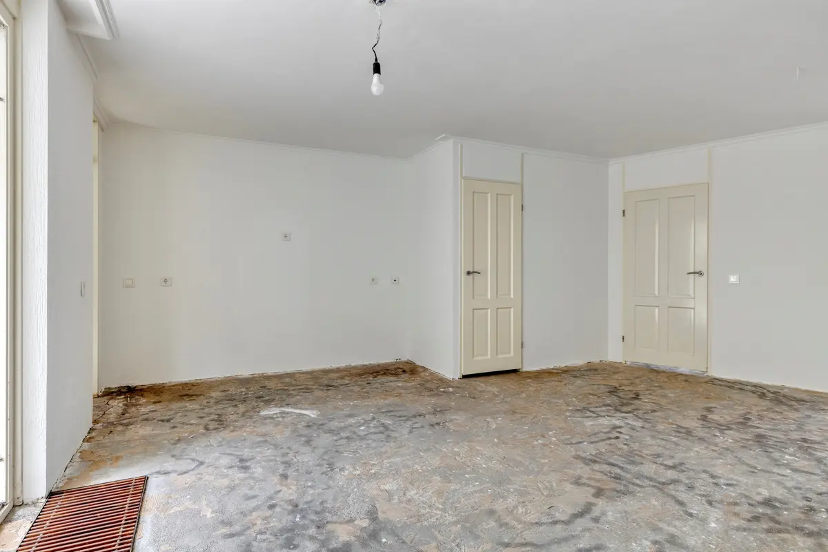 De betonvloer is niet afgewerkt, de wanden zijn gespachteld en de plafonds zijn gespoten.