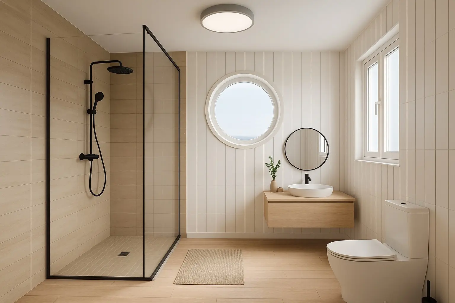 De XL 2e badkamer, 2.27x3.34 m, met een schitterend rond raam is voorzien van een wastafel, een wasmachine-aansluiting, een douchecabine en een toilet.