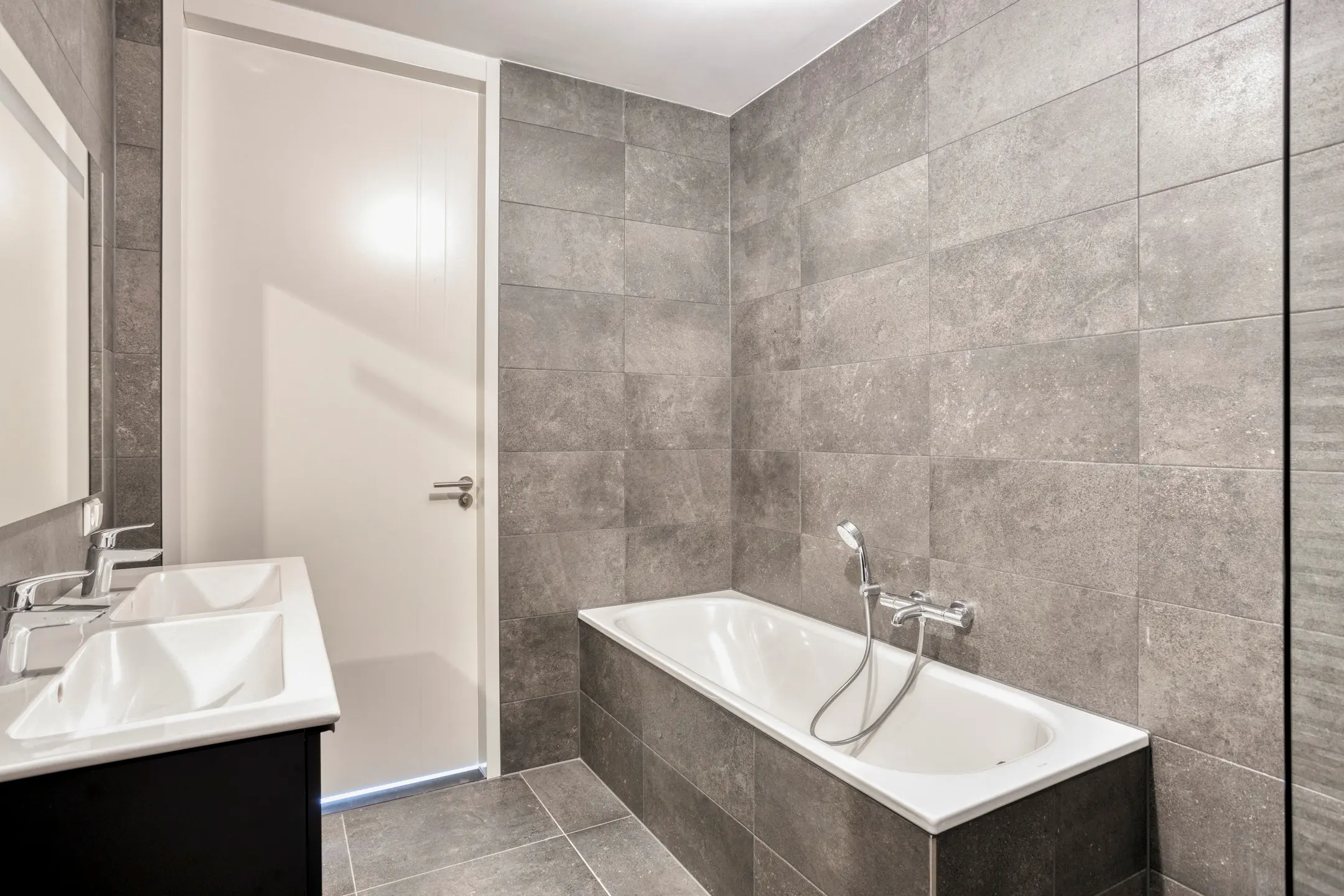 De badkamer (ca. 6 m²) is volledig betegeld en ruim van opzet. Hier is een ruime inloopdouche met draingoot, een bad, twee wastafels en een elektrische designradiator.