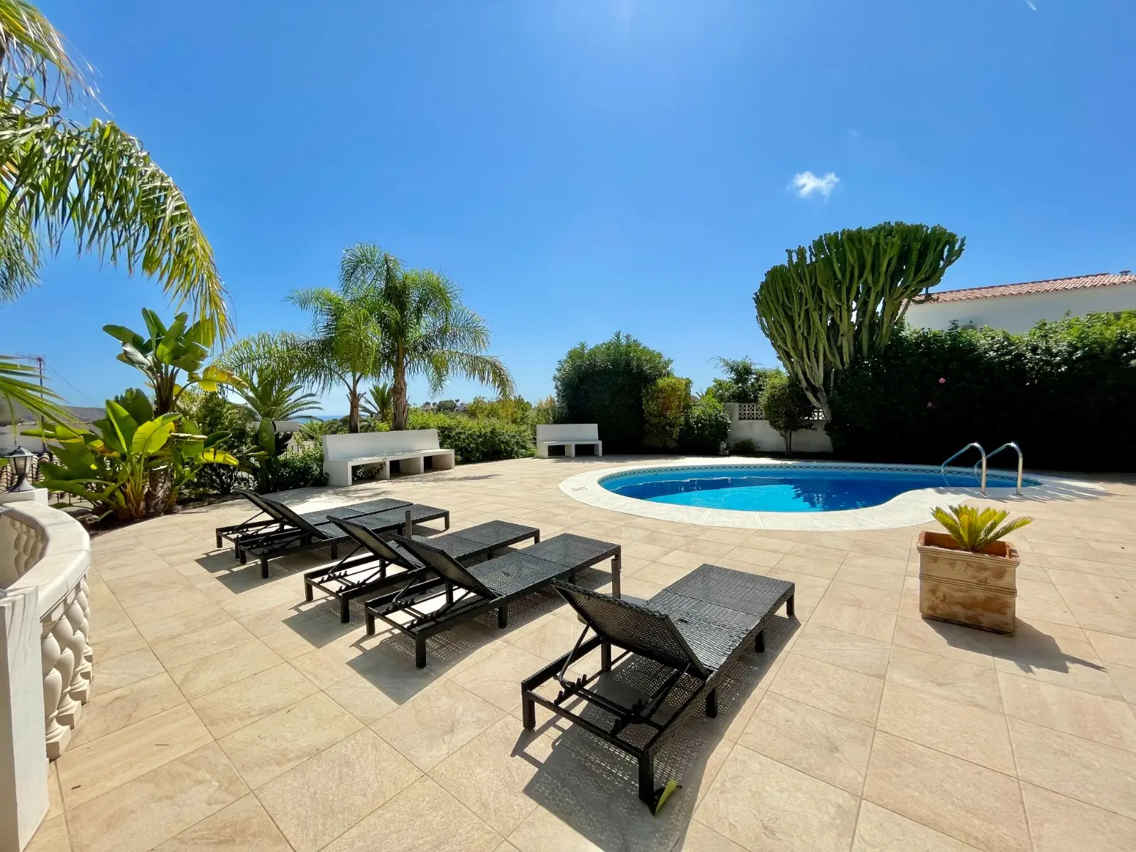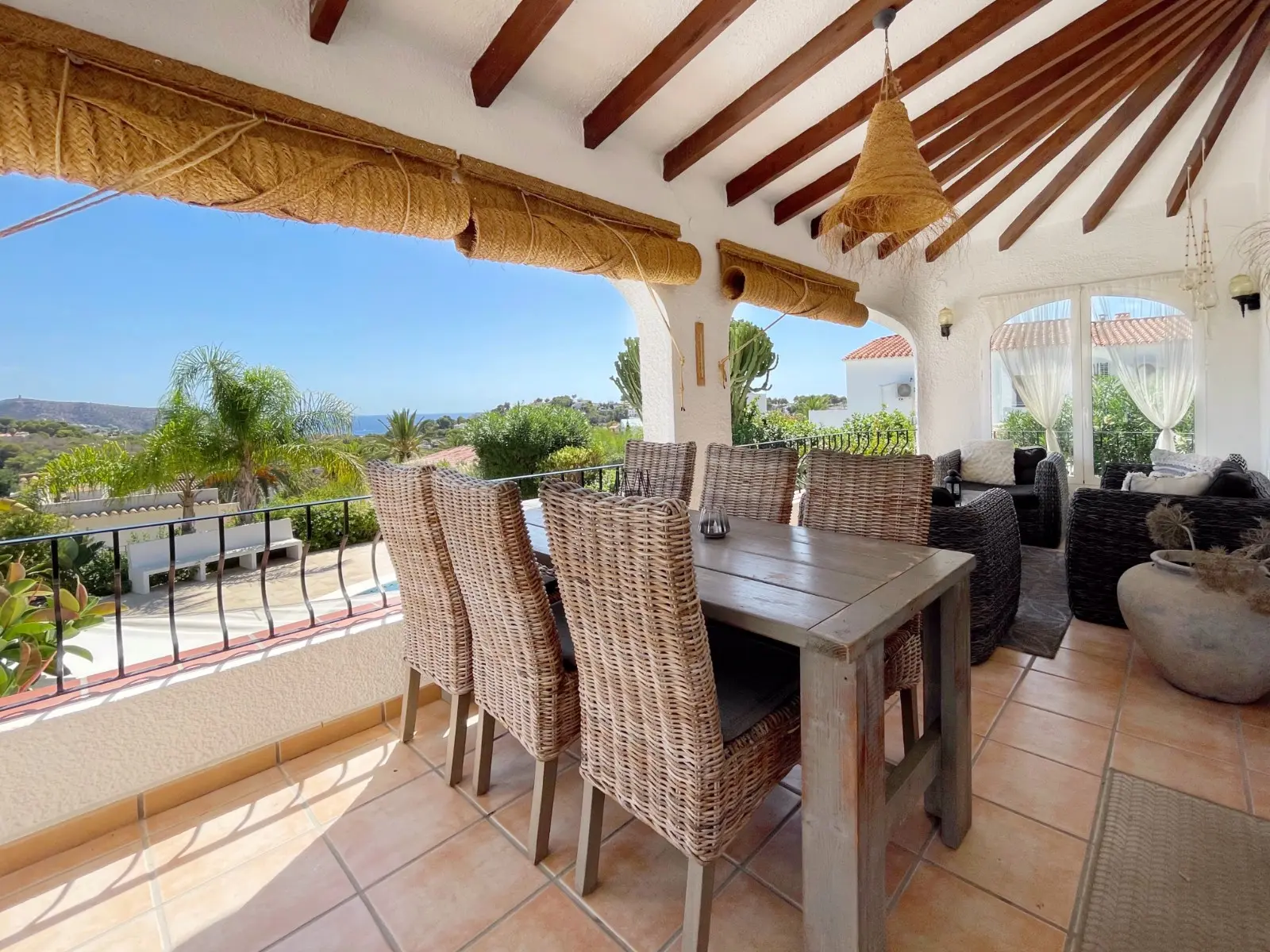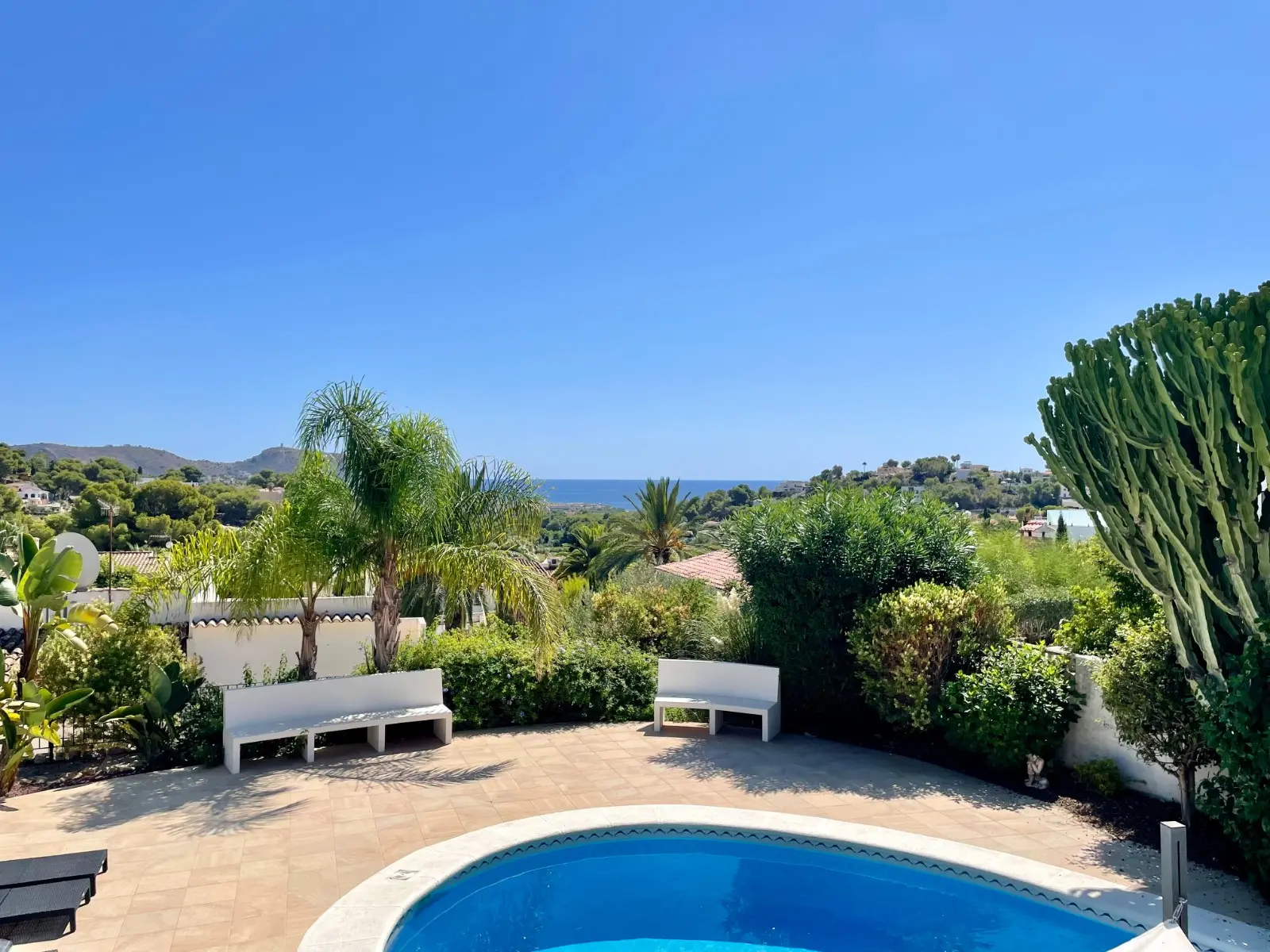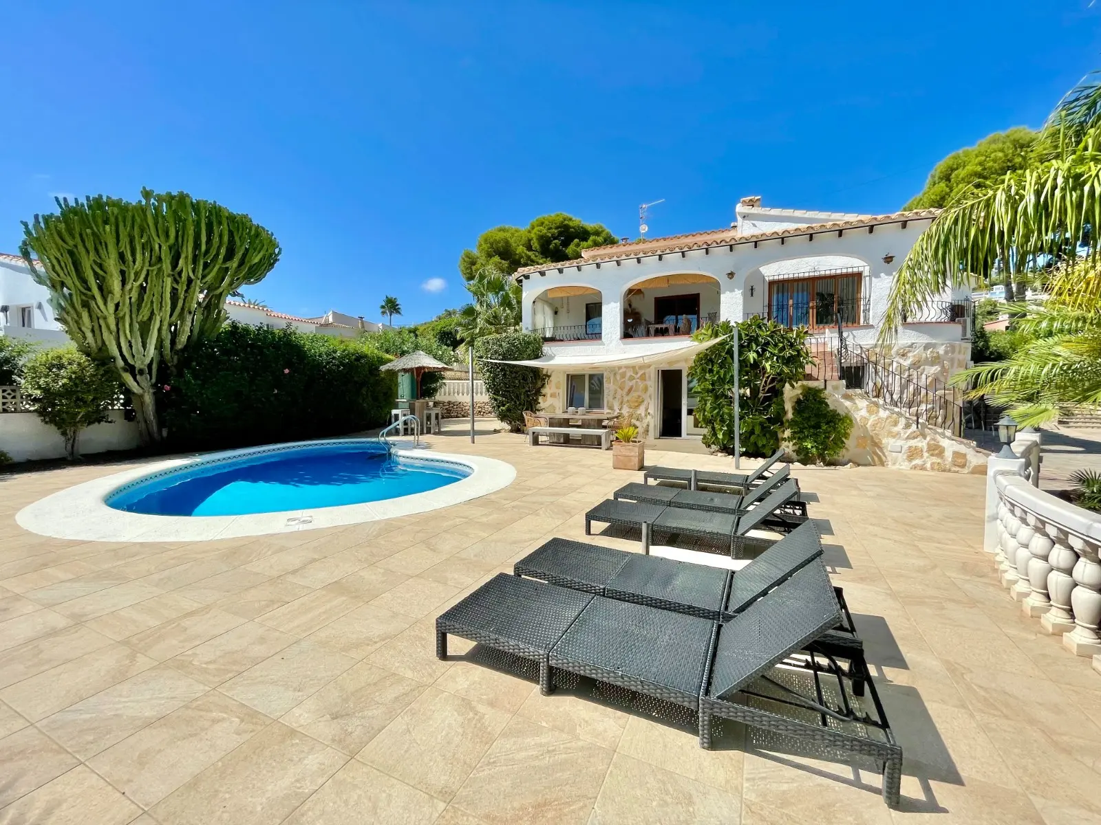 Gezellig ingerichte villa op een ruim kavel gelegen in het lagere gedeelte van de populaire wijk Benimeit met een schitterend zicht op zowel de zee als op het centrum van Moraira. De woning beschikt over een woonkamer die verbonden is met een leuke naya (overdekt terras) en een open terras, die beide over de tuin met het niervormige zwembad uitkijken. In de onderbouw een geheel separaat gastenverblijf en een ruime garage. Binnen 6 minuten zit u in hartje centrum Moraira en op korte afstand vinden we een klein commercieel centrum met o.a. een supermarkt (met veel Nederlandse producten) die 7 dagen per week geopend is.