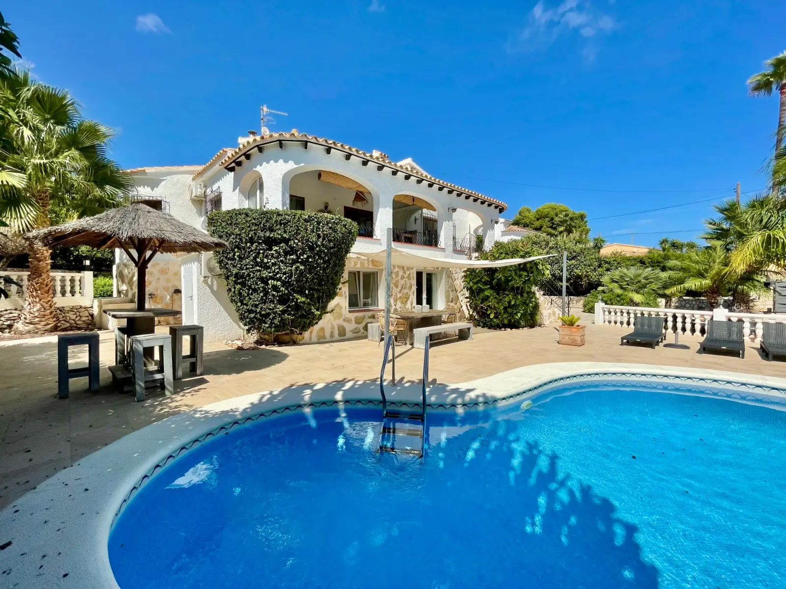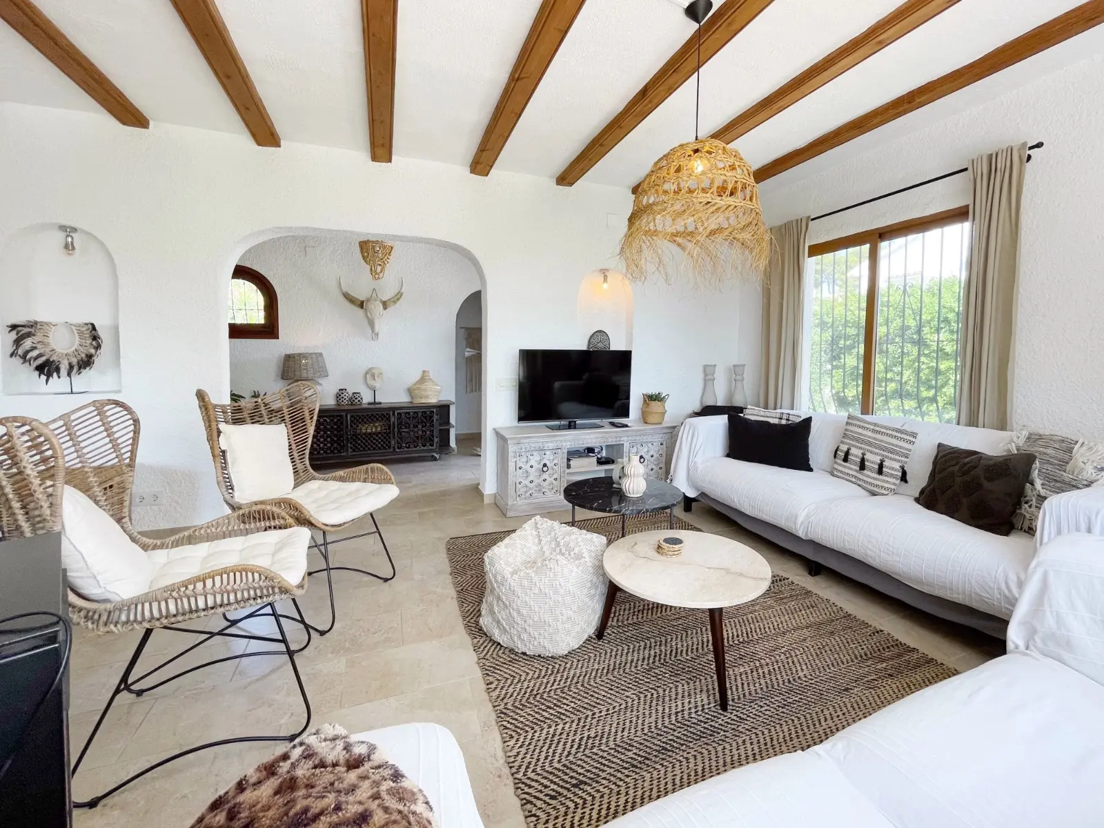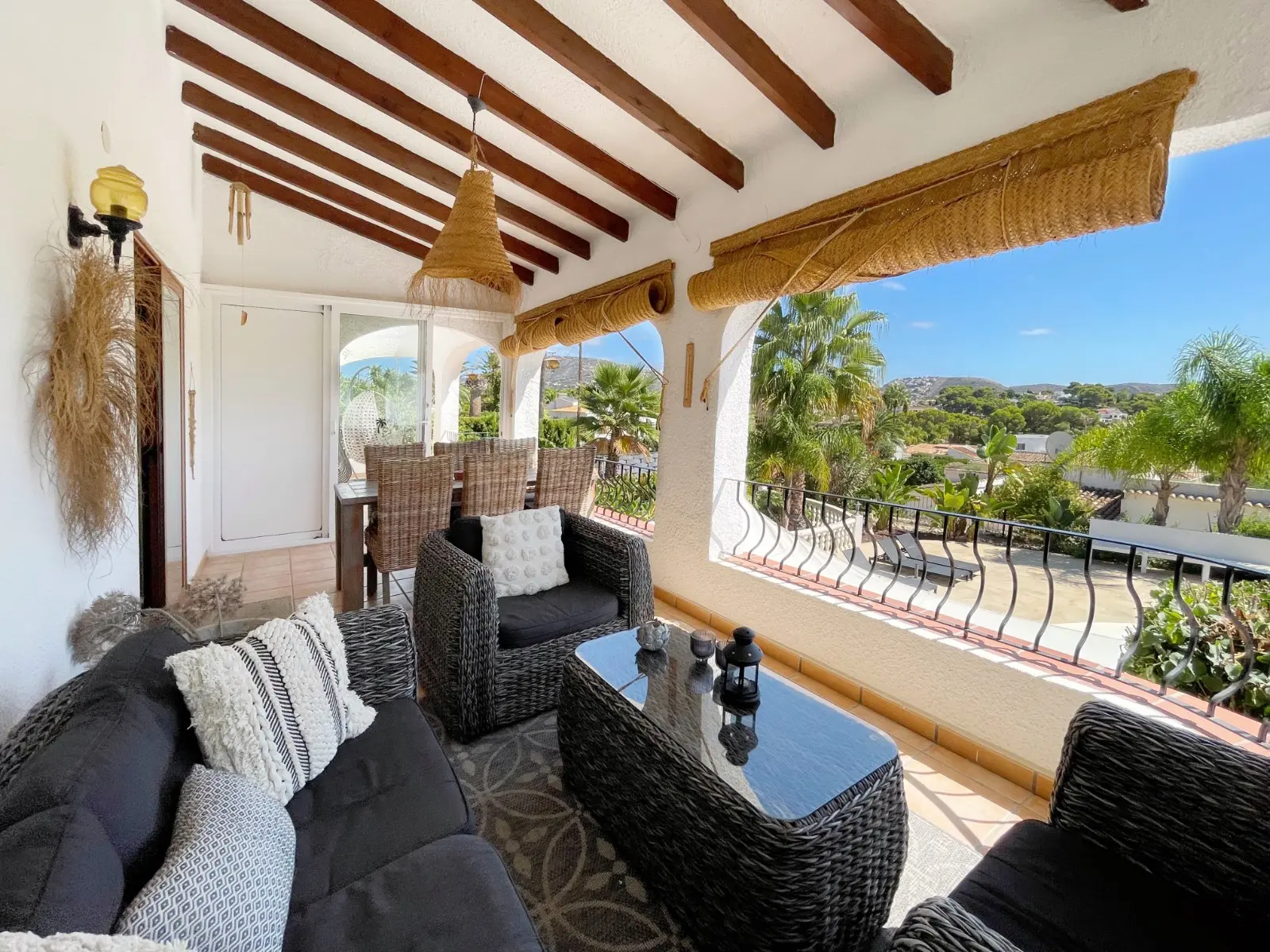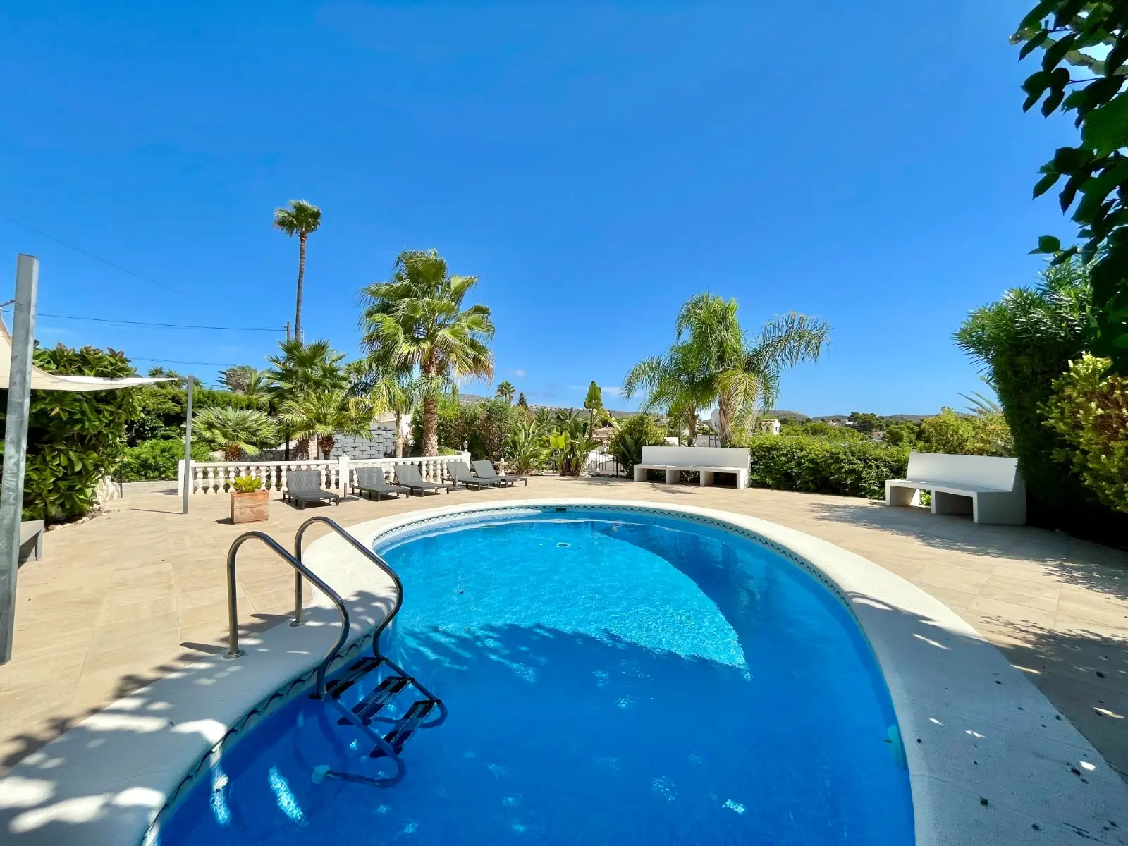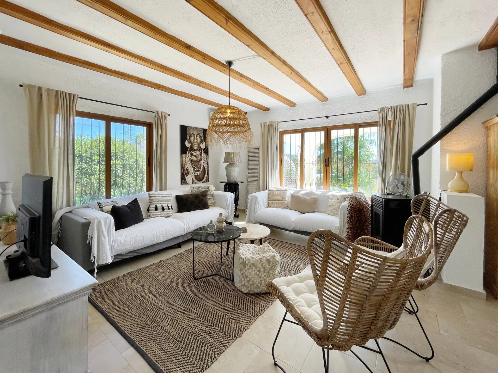 Gezellig ingerichte villa op een ruim kavel gelegen in het lagere gedeelte van de populaire wijk Benimeit met een schitterend zicht op zowel de zee als op het centrum van Moraira. De woning beschikt over een woonkamer die verbonden is met een leuke naya (overdekt terras) en een open terras, die beide over de tuin met het niervormige zwembad uitkijken. In de onderbouw een geheel separaat gastenverblijf en een ruime garage. Binnen 6 minuten zit u in hartje centrum Moraira en op korte afstand vinden we een klein commercieel centrum met o.a. een supermarkt (met veel Nederlandse producten) die 7 dagen per week geopend is.