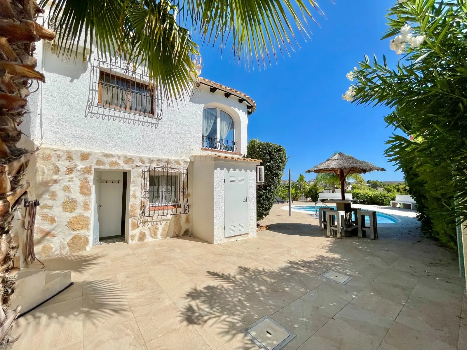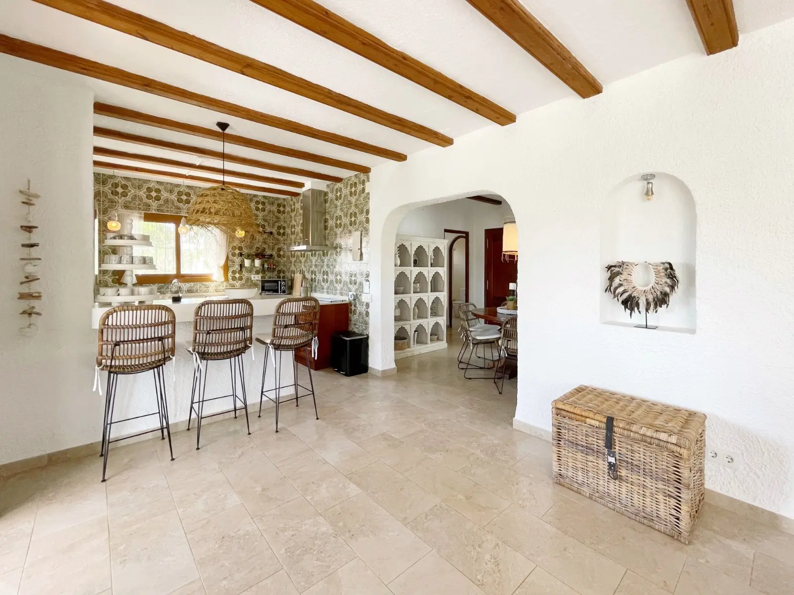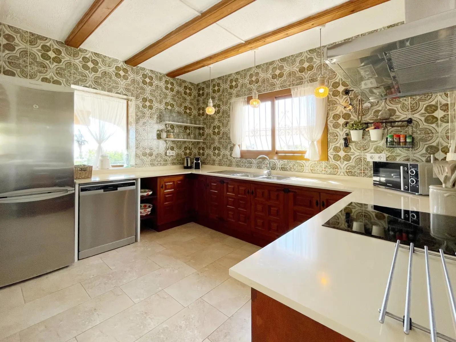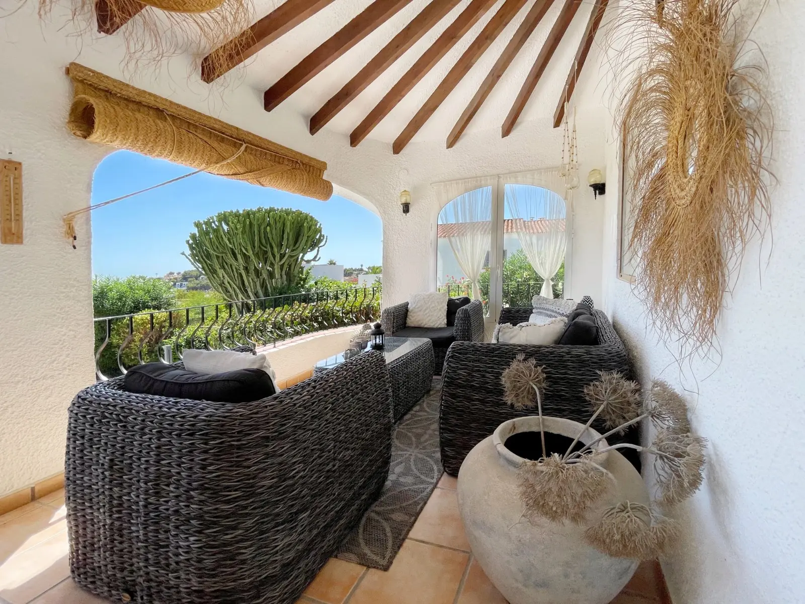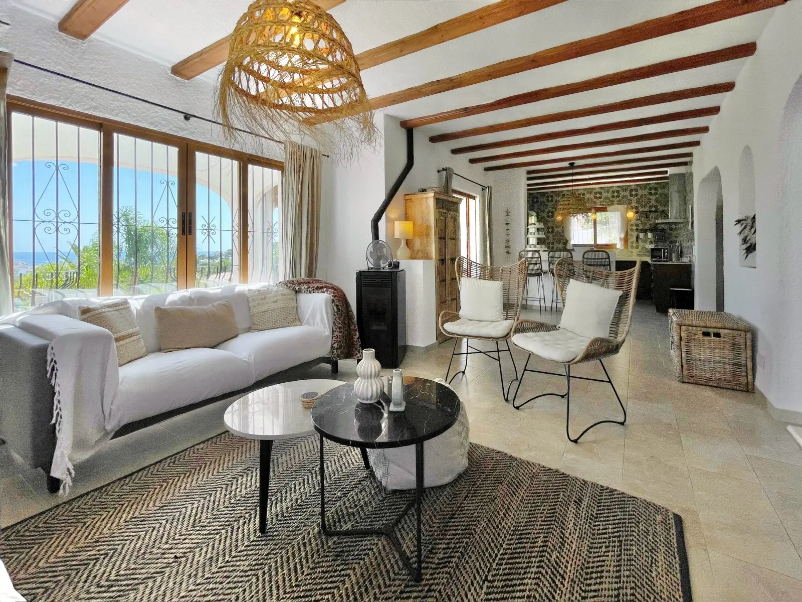 Gezellig ingerichte villa op een ruim kavel gelegen in het lagere gedeelte van de populaire wijk Benimeit met een schitterend zicht op zowel de zee als op het centrum van Moraira. De woning beschikt over een woonkamer die verbonden is met een leuke naya (overdekt terras) en een open terras, die beide over de tuin met het niervormige zwembad uitkijken. In de onderbouw een geheel separaat gastenverblijf en een ruime garage. Binnen 6 minuten zit u in hartje centrum Moraira en op korte afstand vinden we een klein commercieel centrum met o.a. een supermarkt (met veel Nederlandse producten) die 7 dagen per week geopend is.