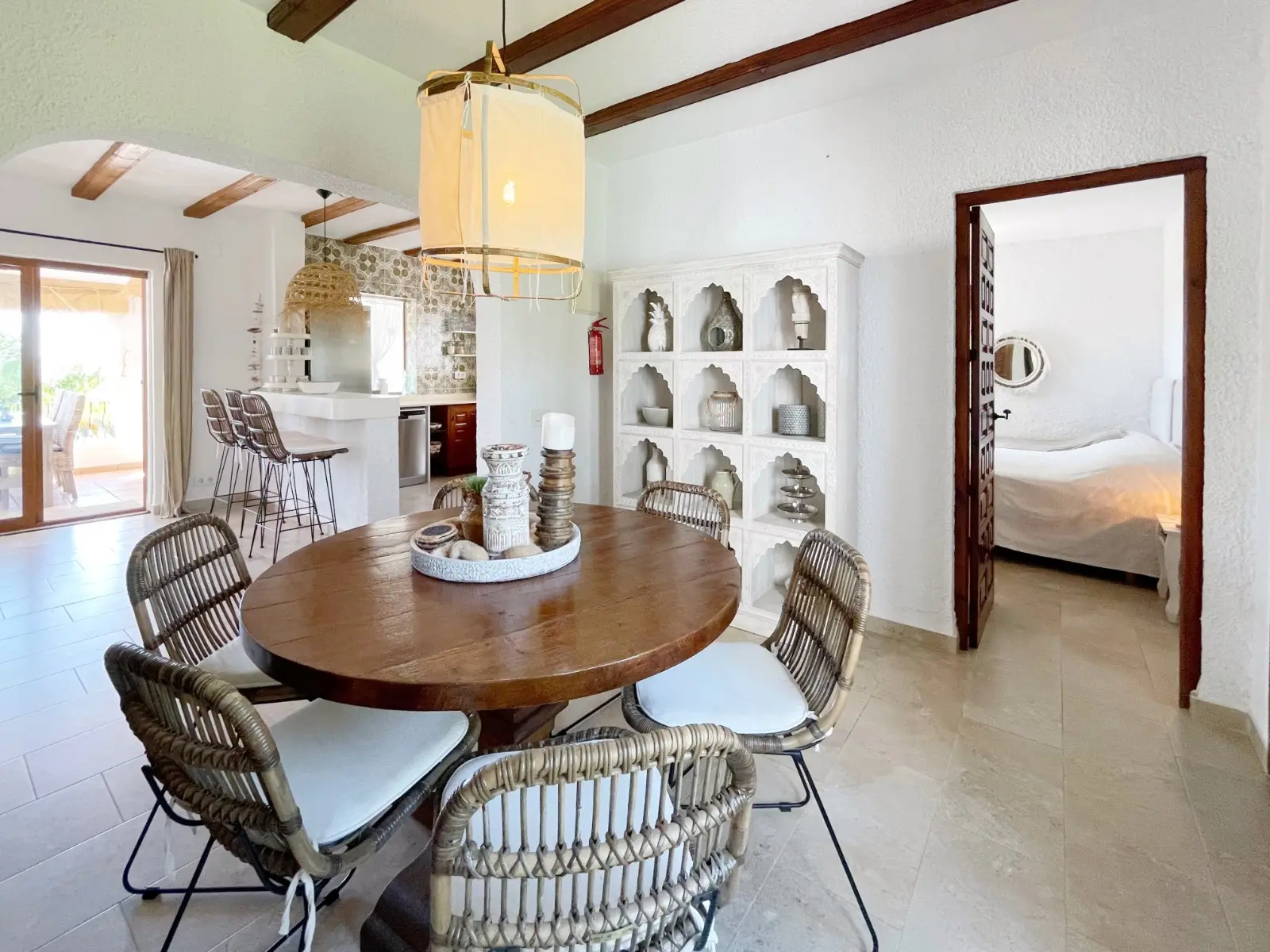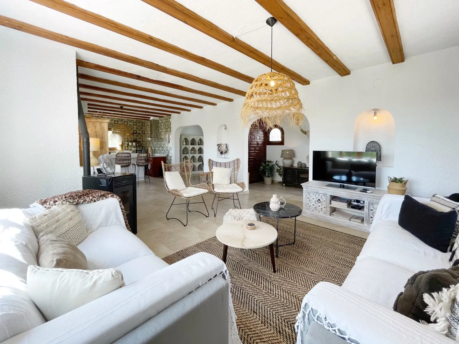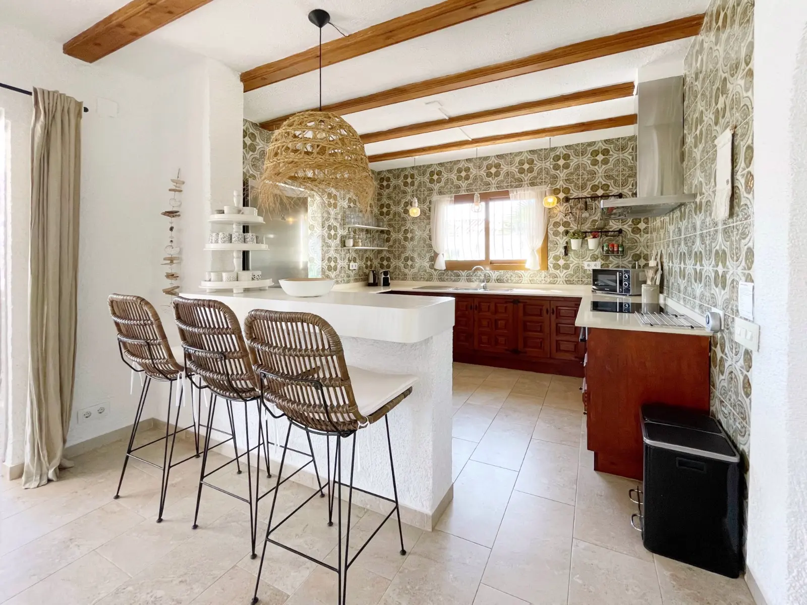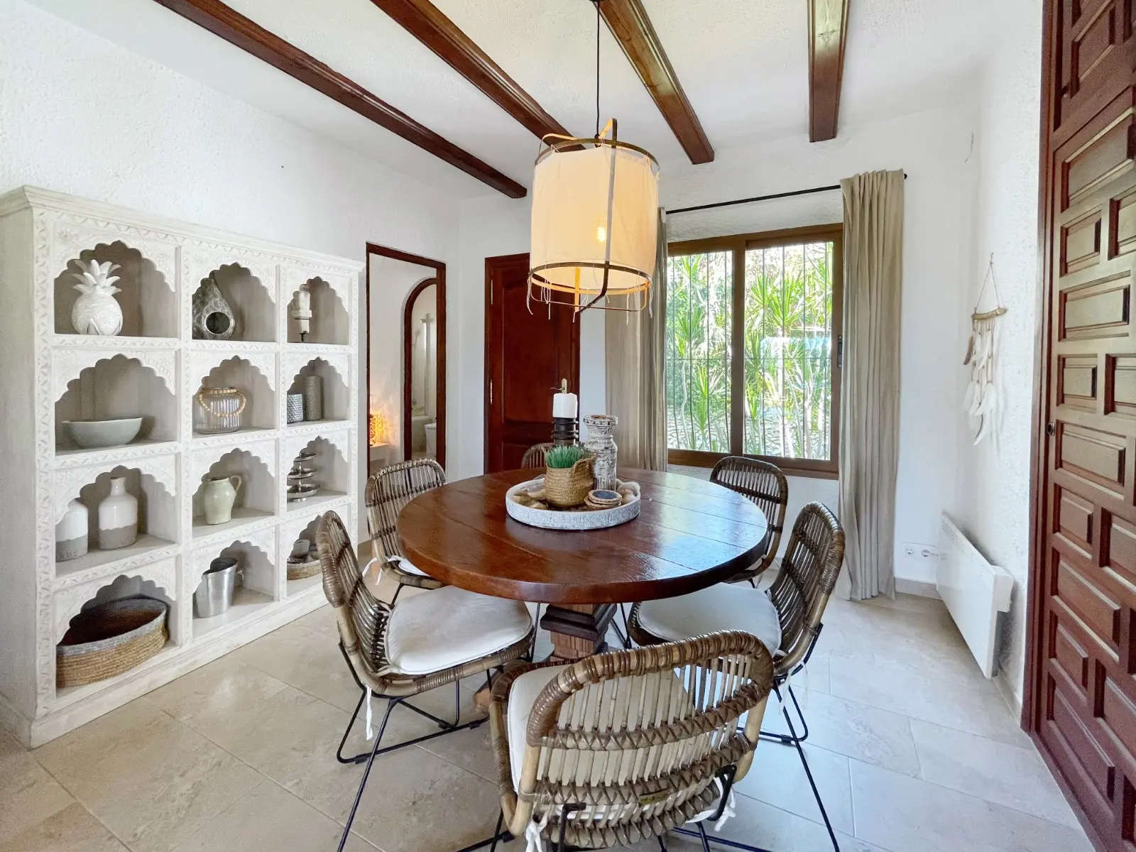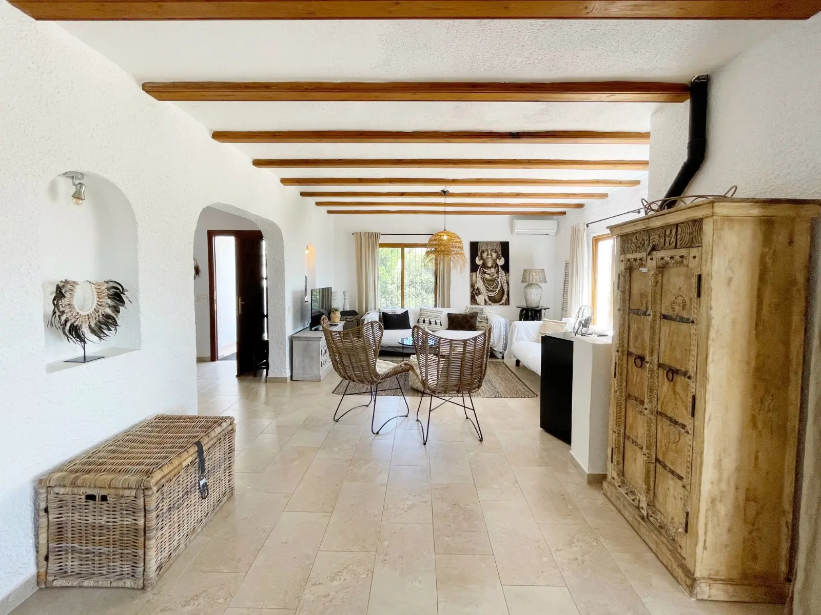 Gezellig ingerichte villa op een ruim kavel gelegen in het lagere gedeelte van de populaire wijk Benimeit met een schitterend zicht op zowel de zee als op het centrum van Moraira. De woning beschikt over een woonkamer die verbonden is met een leuke naya (overdekt terras) en een open terras, die beide over de tuin met het niervormige zwembad uitkijken. In de onderbouw een geheel separaat gastenverblijf en een ruime garage. Binnen 6 minuten zit u in hartje centrum Moraira en op korte afstand vinden we een klein commercieel centrum met o.a. een supermarkt (met veel Nederlandse producten) die 7 dagen per week geopend is.