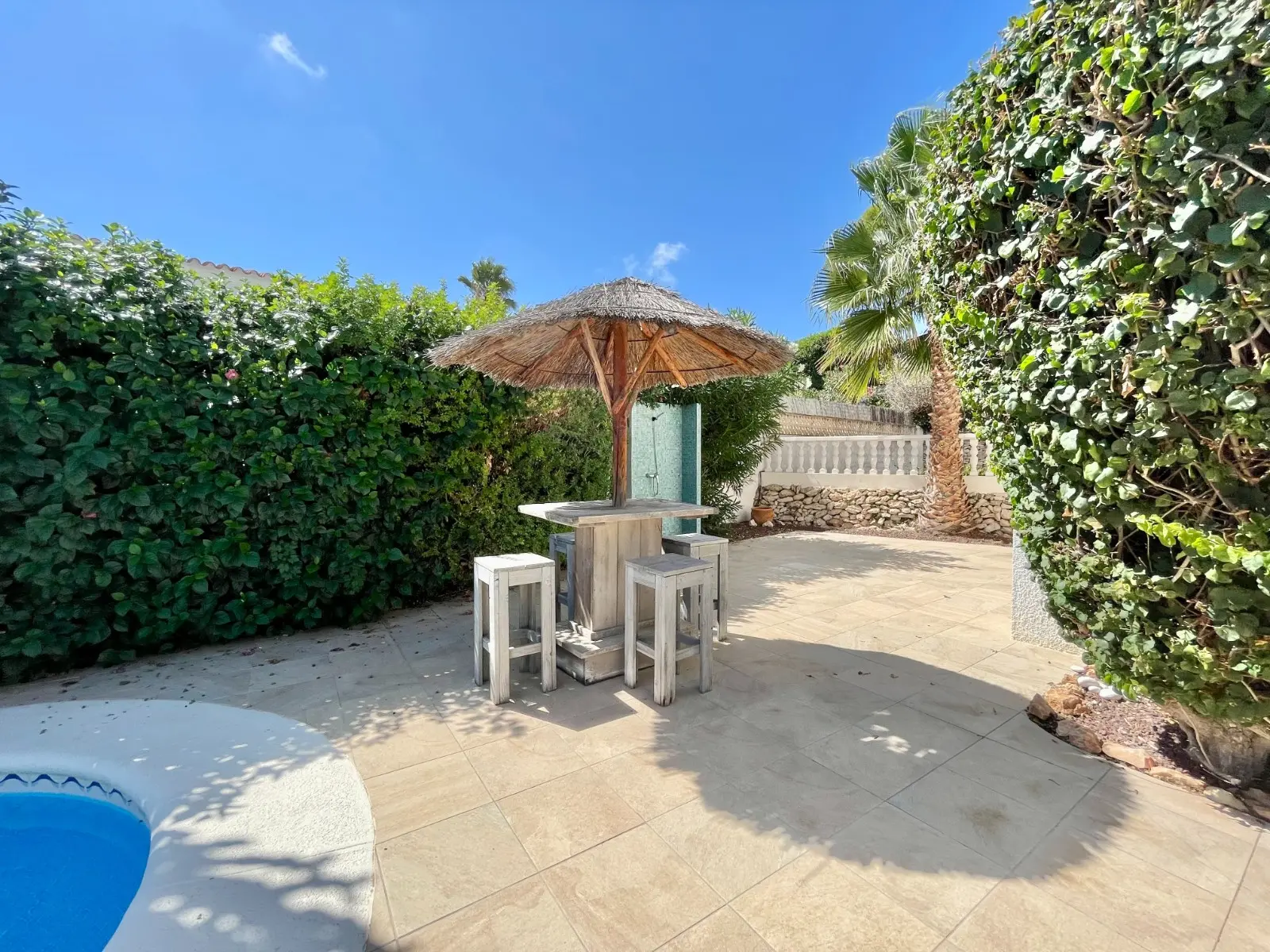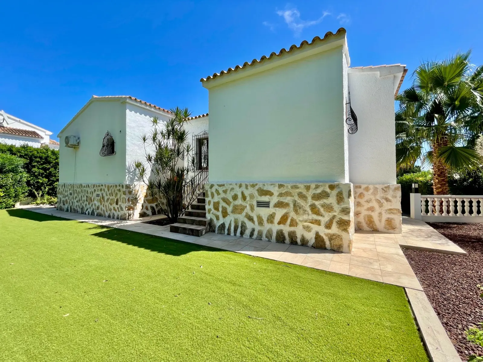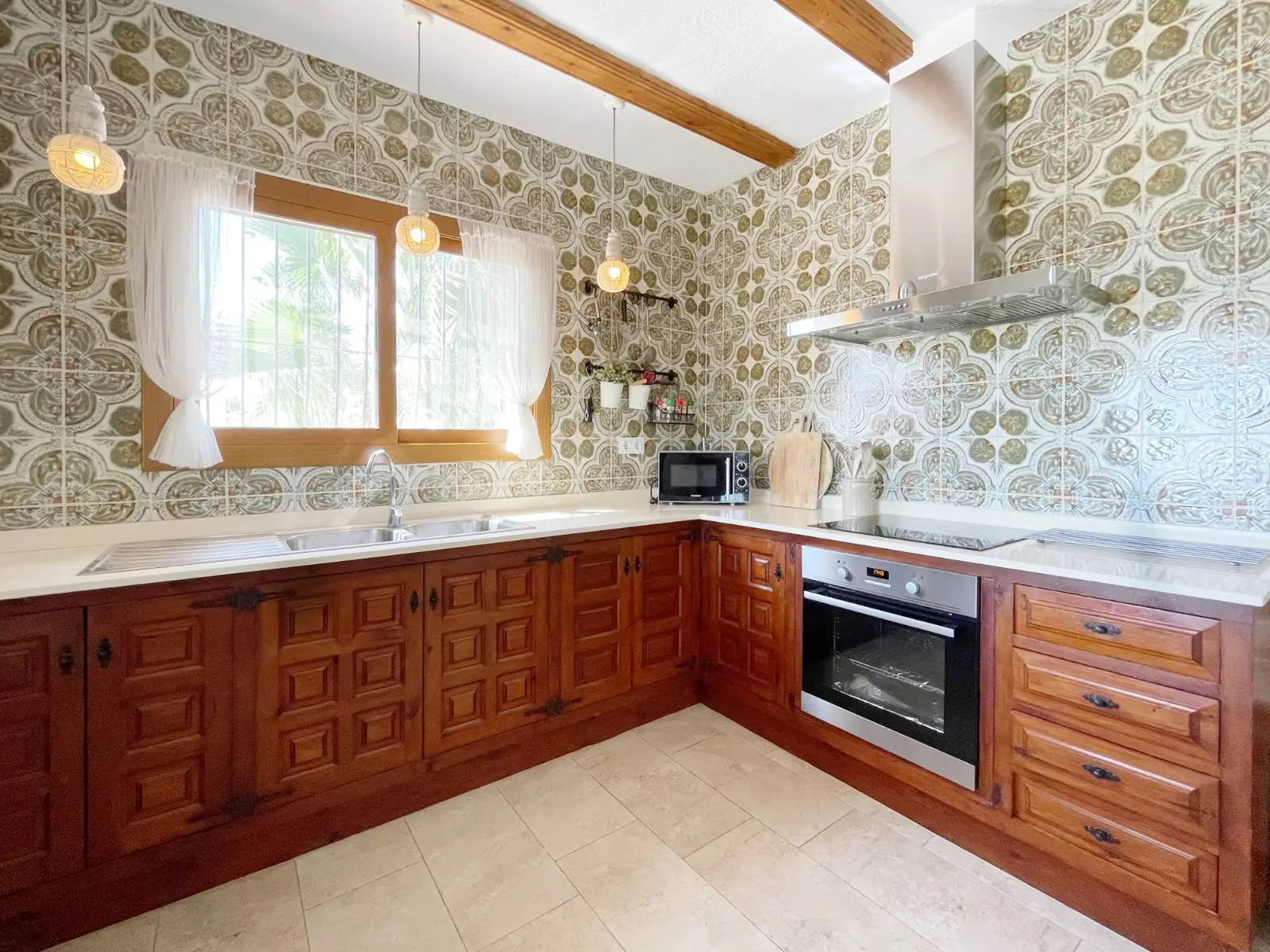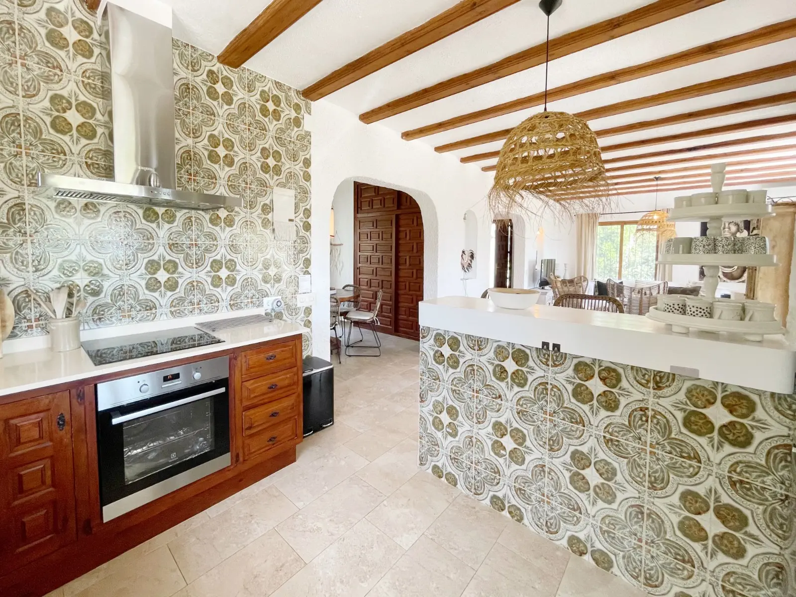 Gezellig ingerichte villa op een ruim kavel gelegen in het lagere gedeelte van de populaire wijk Benimeit met een schitterend zicht op zowel de zee als op het centrum van Moraira. De woning beschikt over een woonkamer die verbonden is met een leuke naya (overdekt terras) en een open terras, die beide over de tuin met het niervormige zwembad uitkijken. In de onderbouw een geheel separaat gastenverblijf en een ruime garage. Binnen 6 minuten zit u in hartje centrum Moraira en op korte afstand vinden we een klein commercieel centrum met o.a. een supermarkt (met veel Nederlandse producten) die 7 dagen per week geopend is.