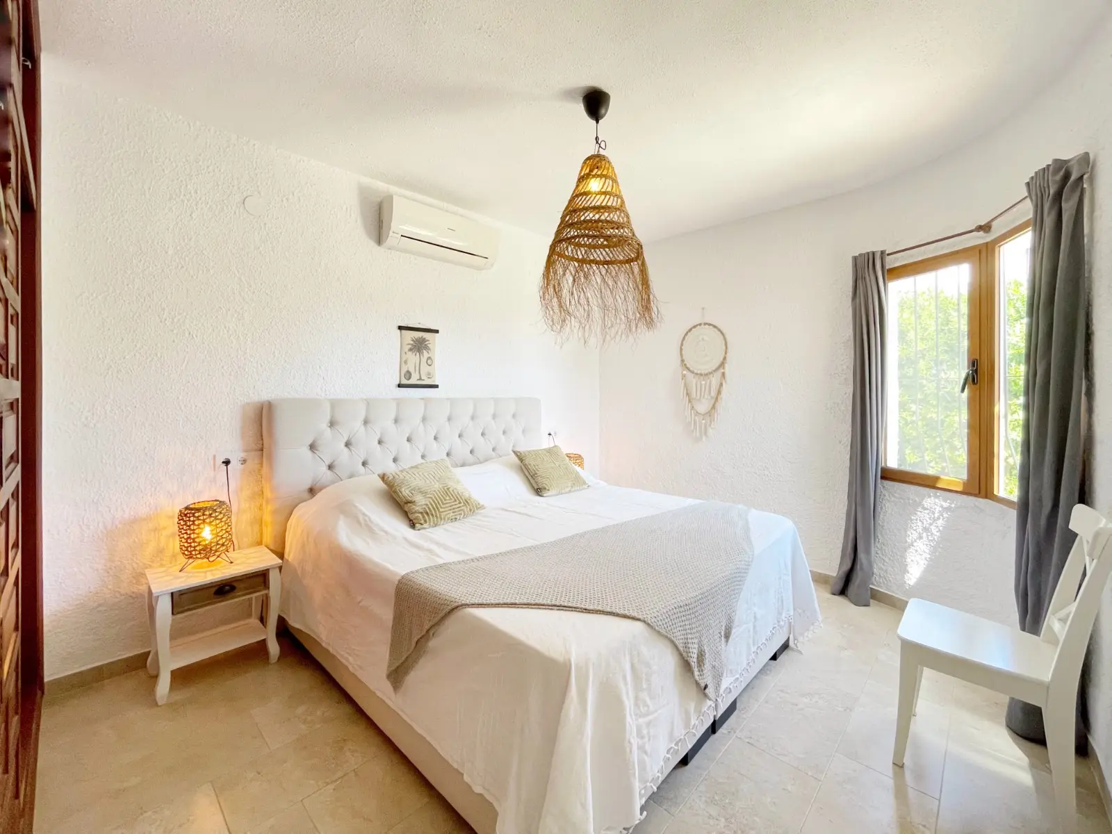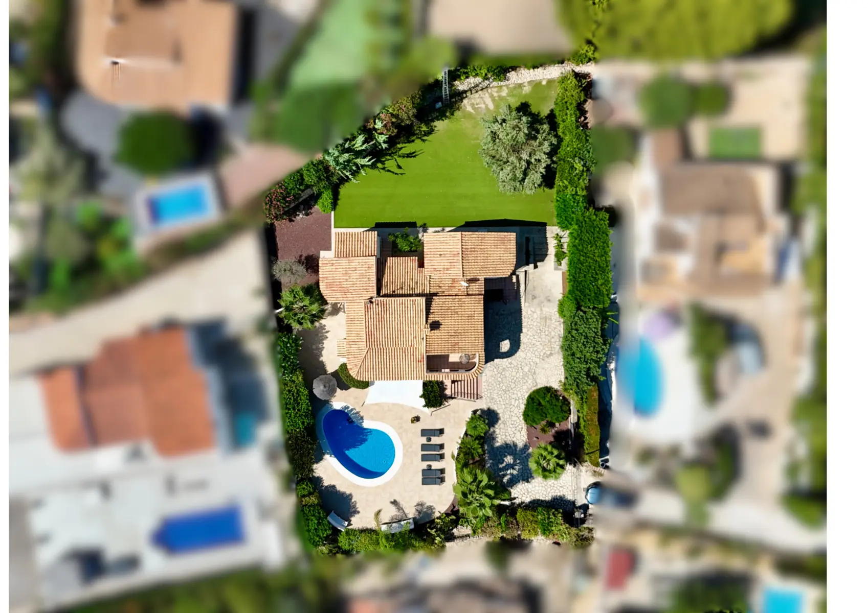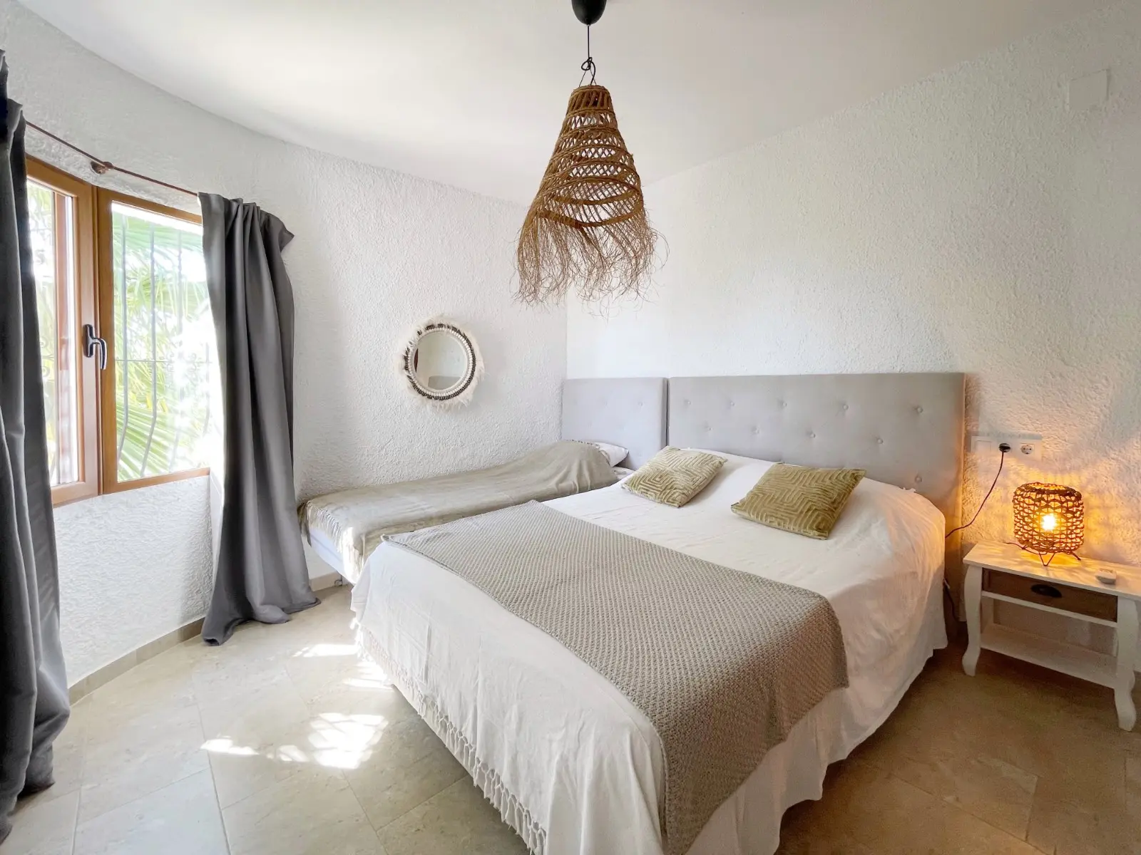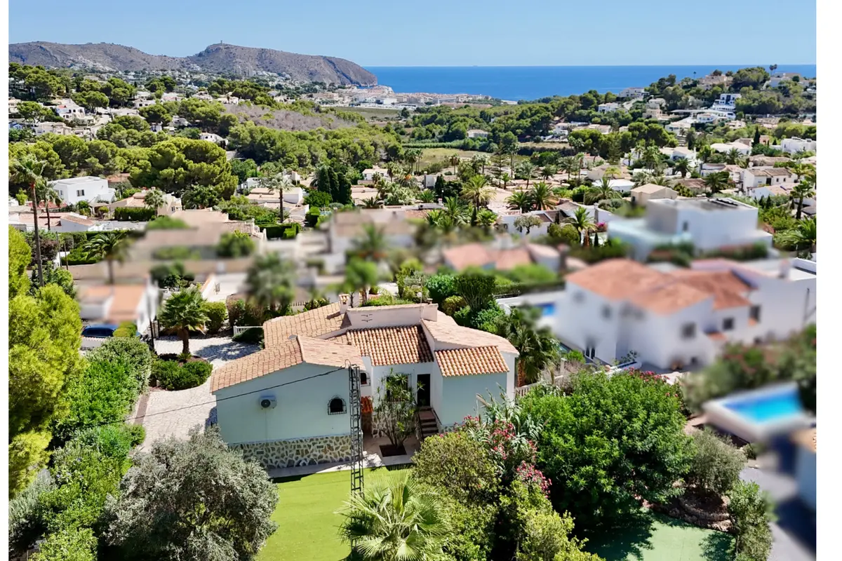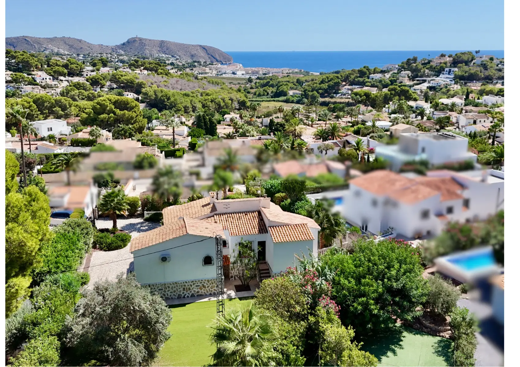 De villa is gelegen op een ruim zeer vlak kavel van 1.181 M2, is toegankelijk via een automatische poort en beslaat 2 verdiepingen. Vanaf beide niveaus biedt de woning een schitterend (zee)zicht. De woonverdieping is bereikbaar via een trap naar de voordeur die toegang geeft tot een ruime toegangshal. Van hieruit bereiken we een ruime woonkamer met open keuken, 2 slaapkamers en 2 badkamers. De woonkamer loopt over in de naya en een gedeelte open terras, vanaf beide niveaus een schitterend zicht op zowel zee, groen, bergen en centrum Moraira. In de onderbouw vinden we naast een garage, een in 2019 geheel gerenoveerd zelfstandig gastenverblijf bestaande uit een keukentje, badkamer en een kamer met loungehoek en slaapgedeelte. Deze kamer is via schuifdeuren direct verbonden met het ruime zwembadterras, omgeven door een groene oase aan volwassen bomen en struiken. Daarnaast nog een kleine kamer waar nu d.m.v. een stapelbed nog extra slaapgelegenheid is gecreëerd. Naast de garage biedt het perceel voldoende ruimte om nog meerdere auto’s te parkeren.