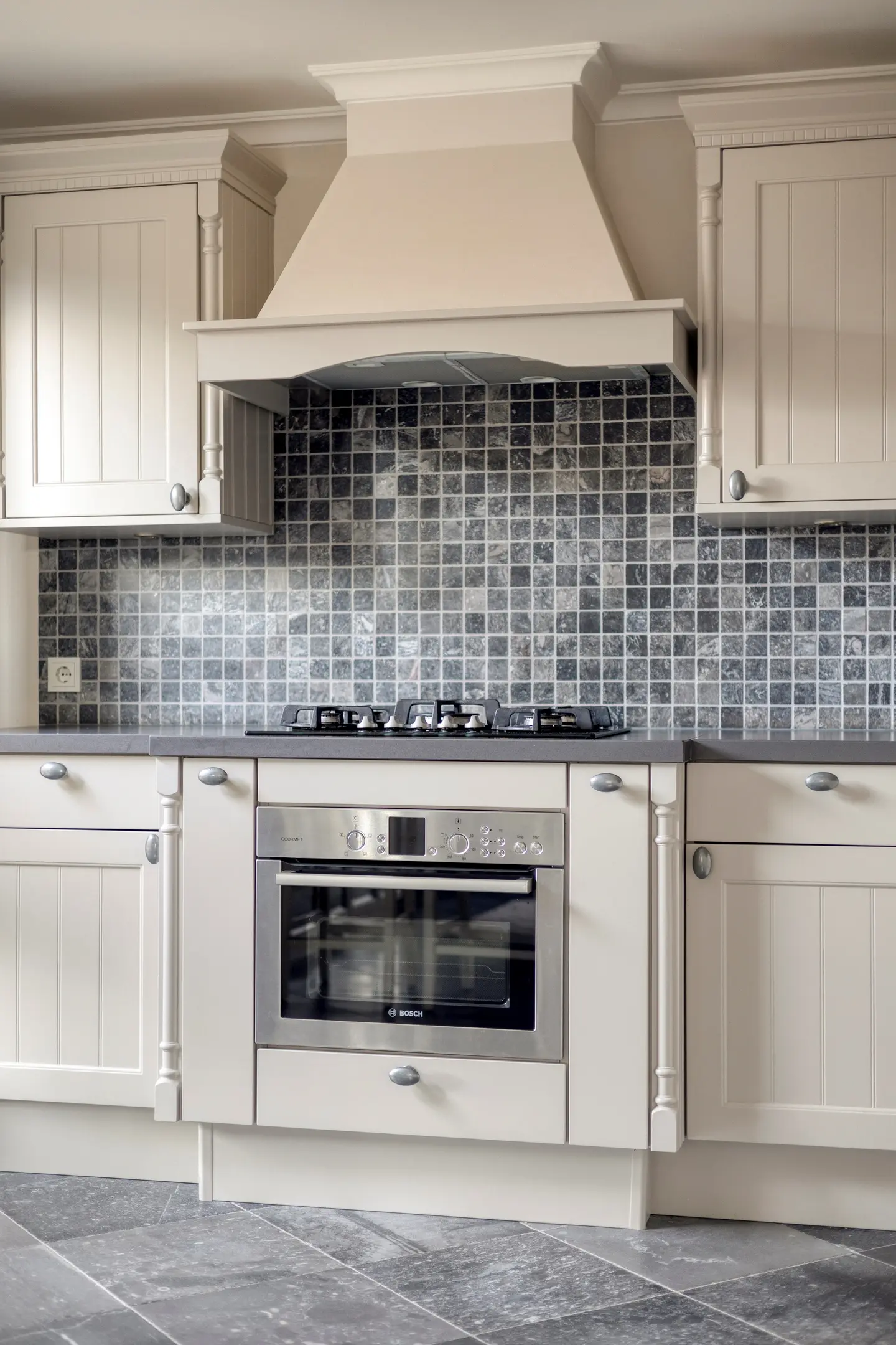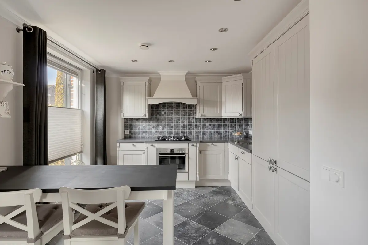 De keuken is uitgevoerd in landelijke stijl en voorzien van alle moderne gemakken, waaronder een royale koel-/vriescombinatie (2025), een afzuigkap in schouw, een vaatwasser en een combi-oven.