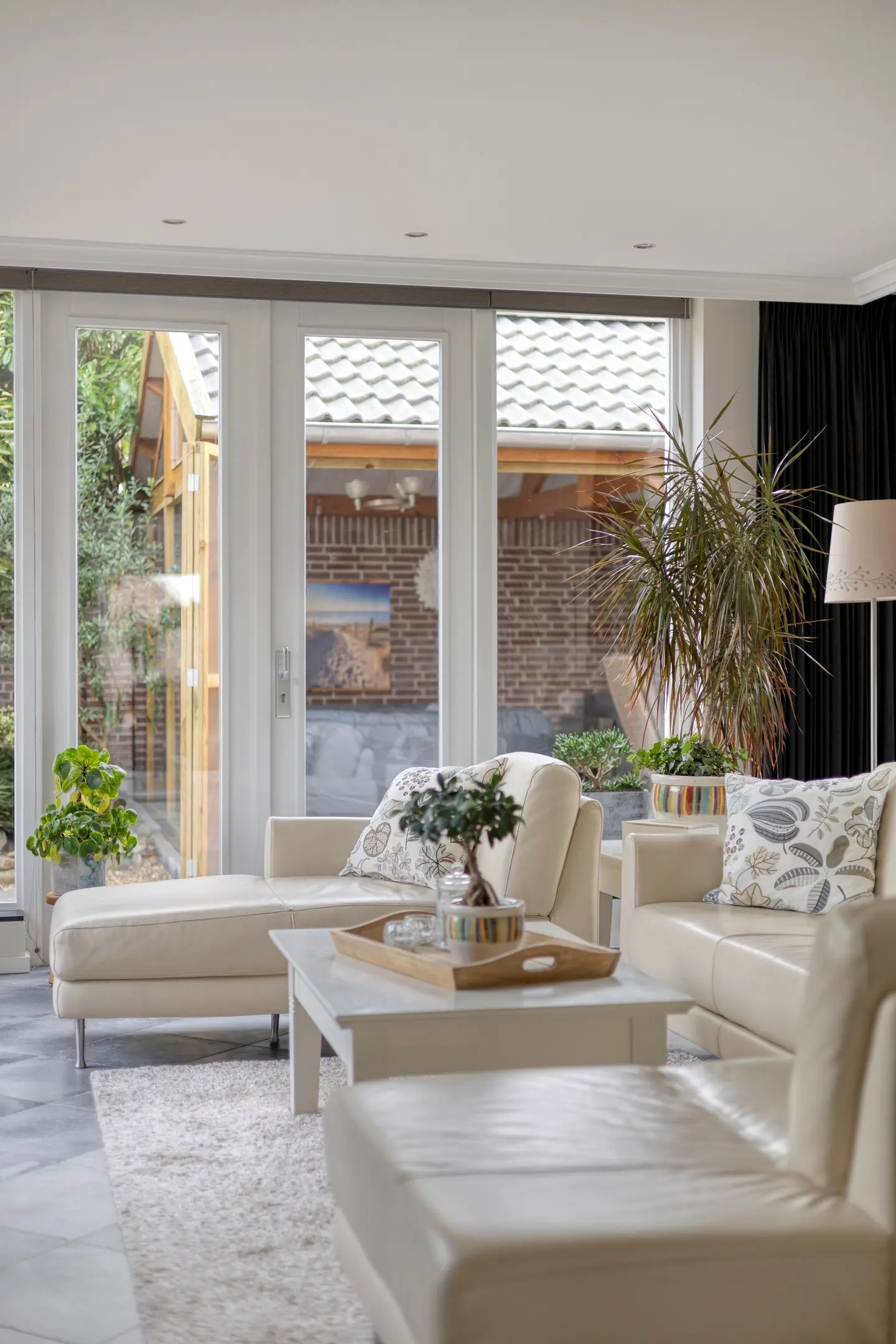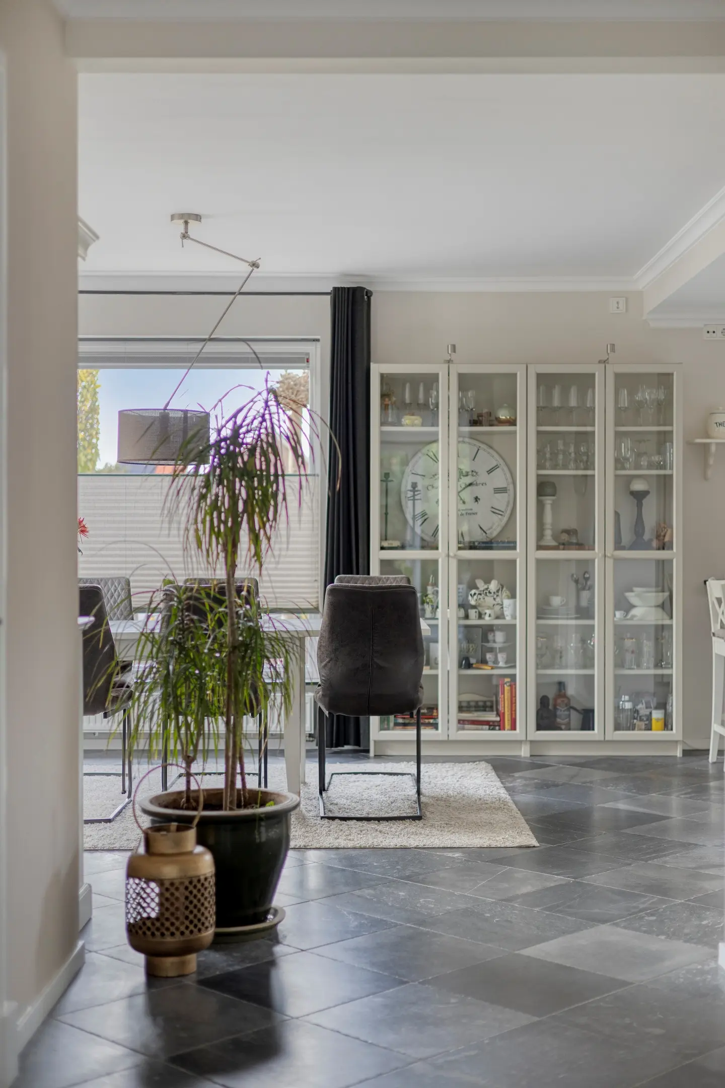 De vloer is afgewerkt met een stijlvolle Belgisch hardstenen vloer met vloerverwarming, terwijl de wanden strak zijn gestuct. Aan de achterzijde bevindt zich de zithoek: een heerlijke, lichte en ruimte dankzij de grote ramen en de openslaande tuindeuren die toegang bieden tot de achtertuin. Het plafond is voorzien van moderne inbouwspots, die de ruimte extra sfeer en licht geven.