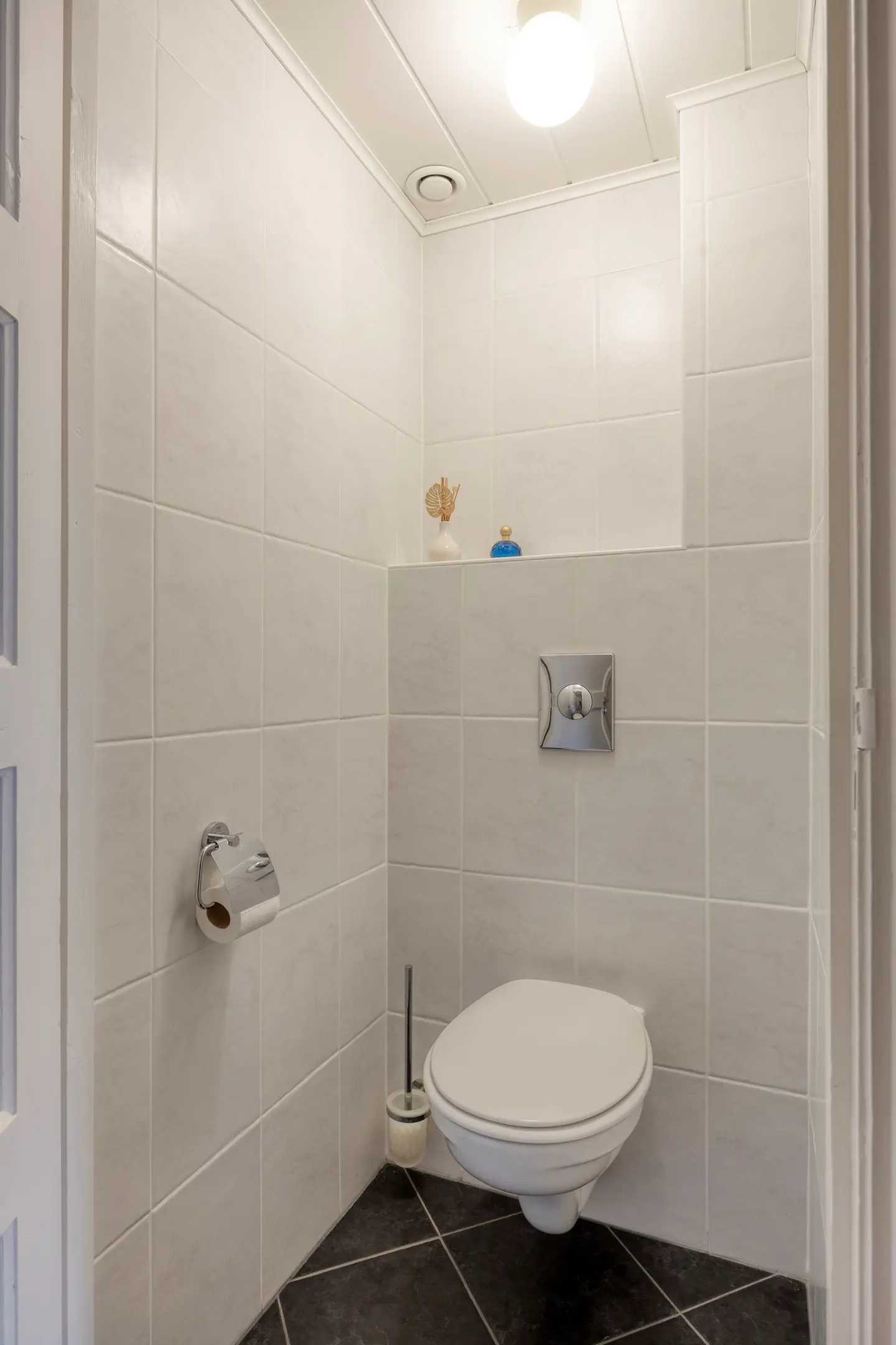 Het separate toilet is geheel betegeld en voorzien van een wandcloset.
