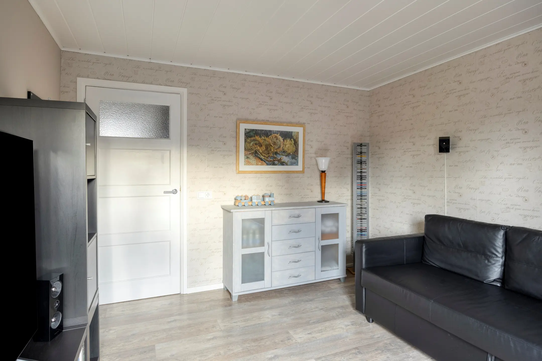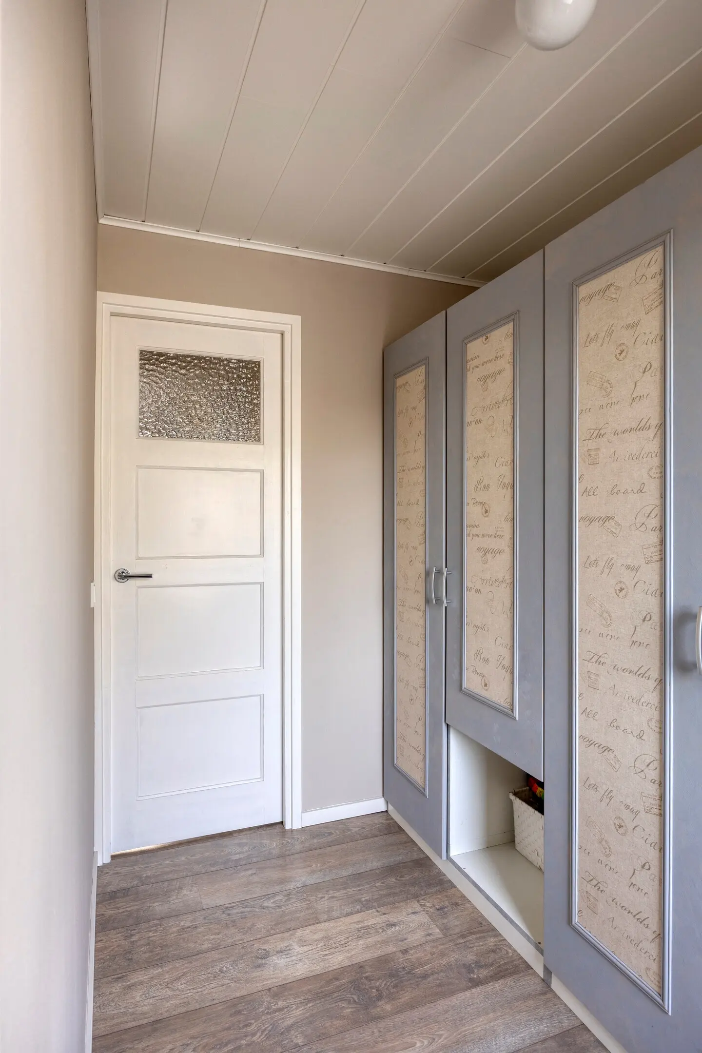 In het midden van de woning bevindt zich de toegang tot een kelder op stahoogte, een praktische vaste kast die momenteel dienstdoet als garderobekast en de doorgang naar de achterhal. Vanuit deze hal zijn het toilet en de achtertuin bereikbaar via een loopdeur.