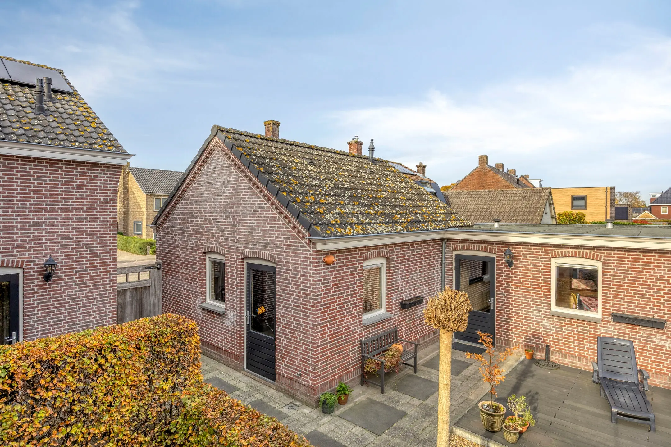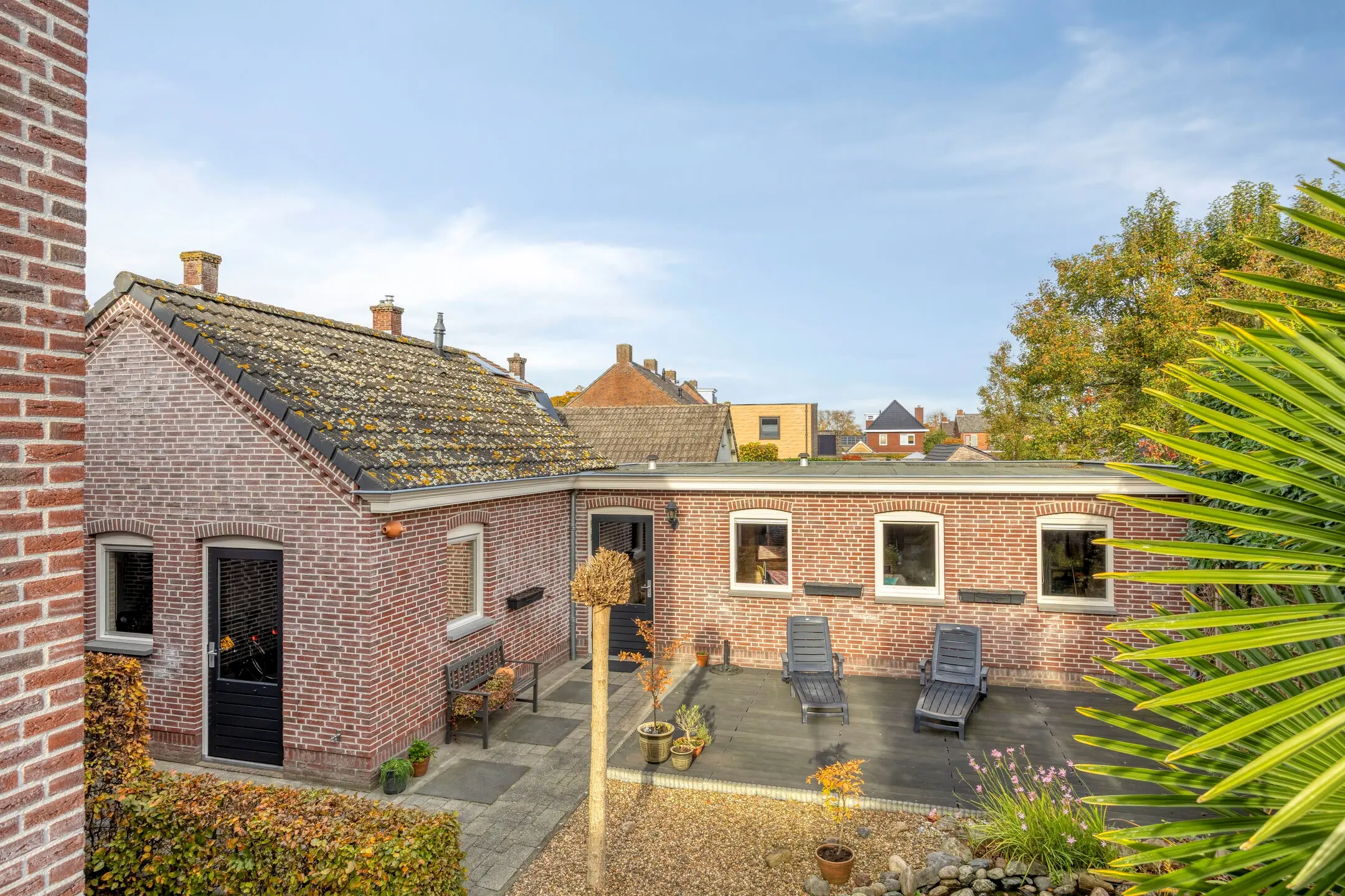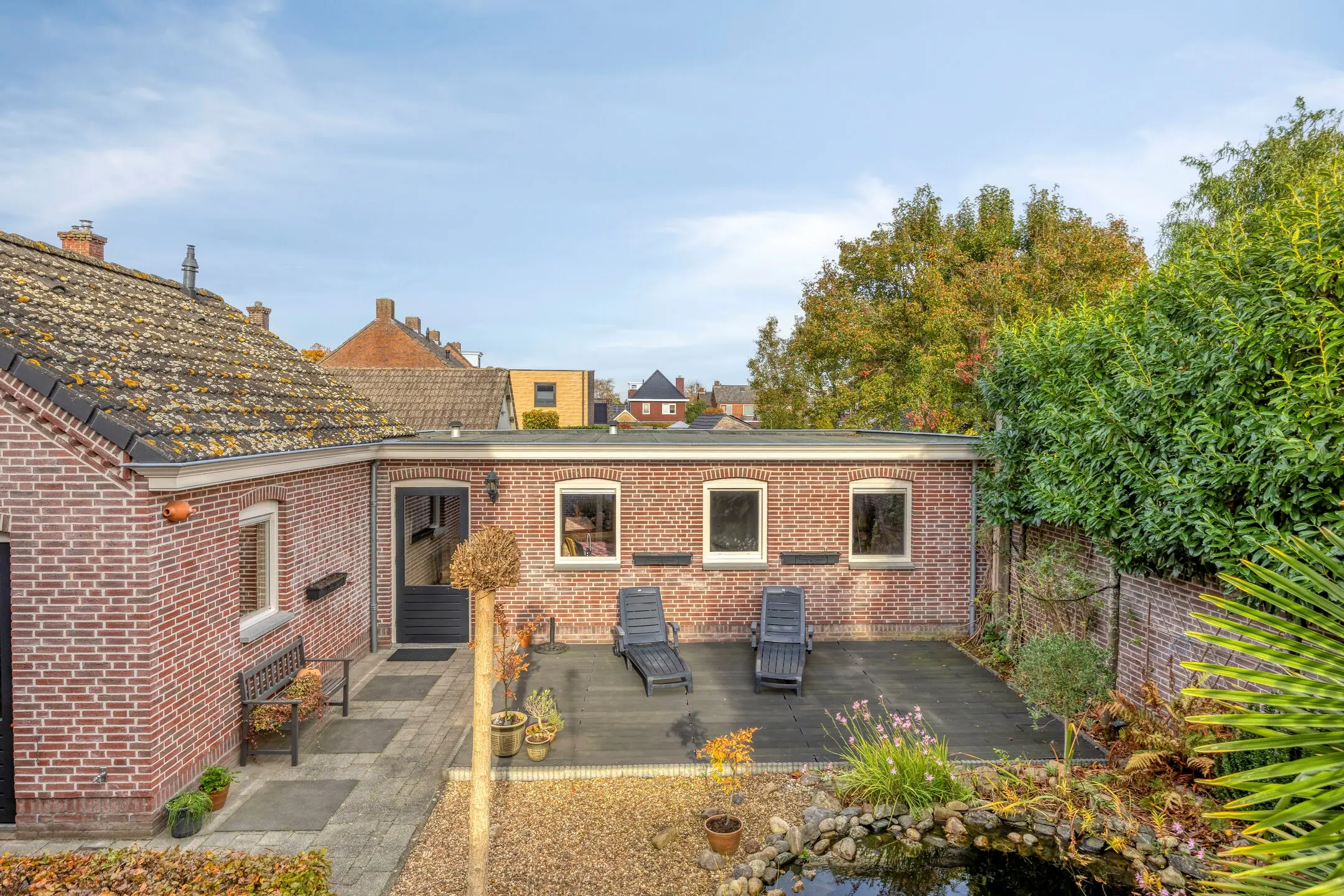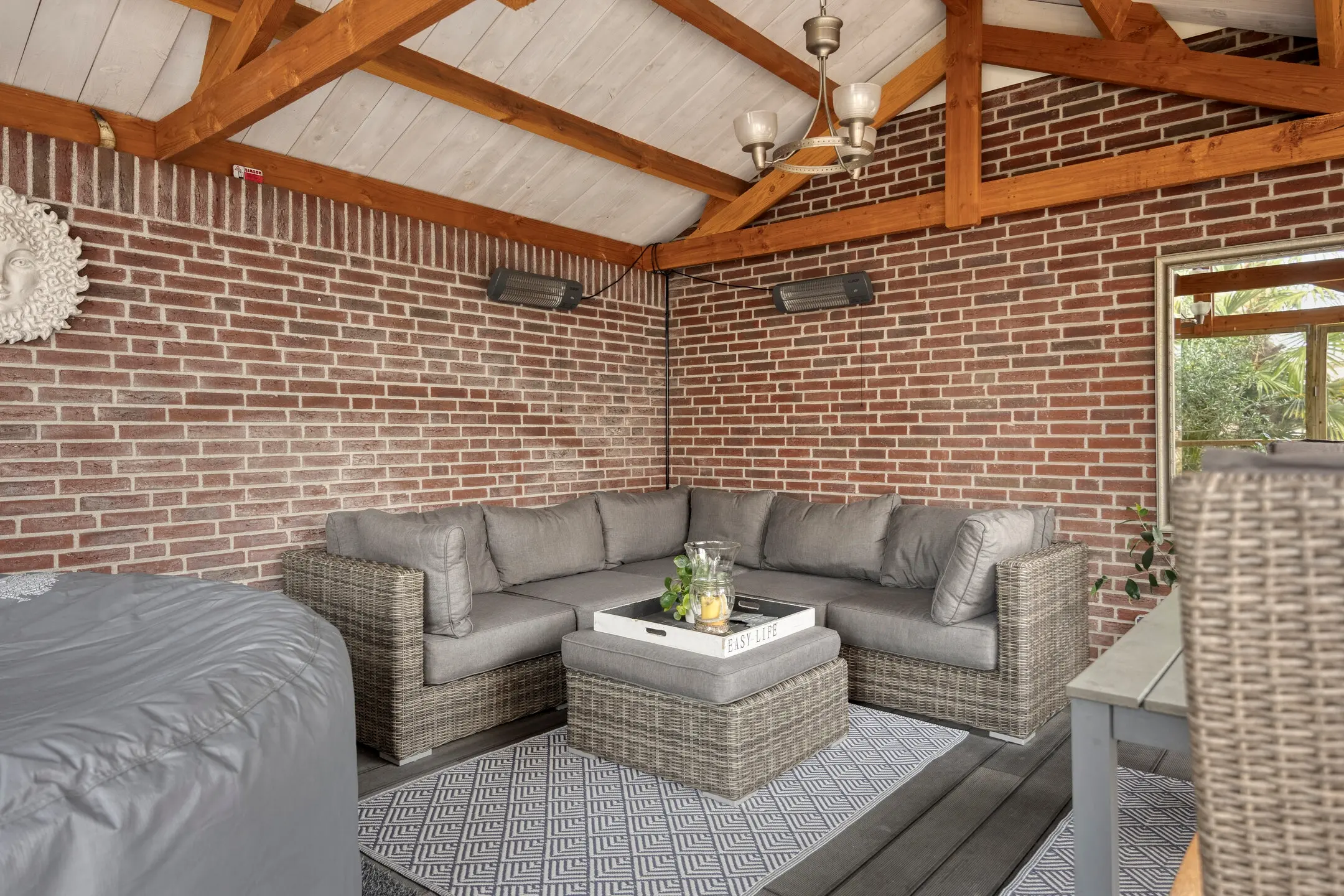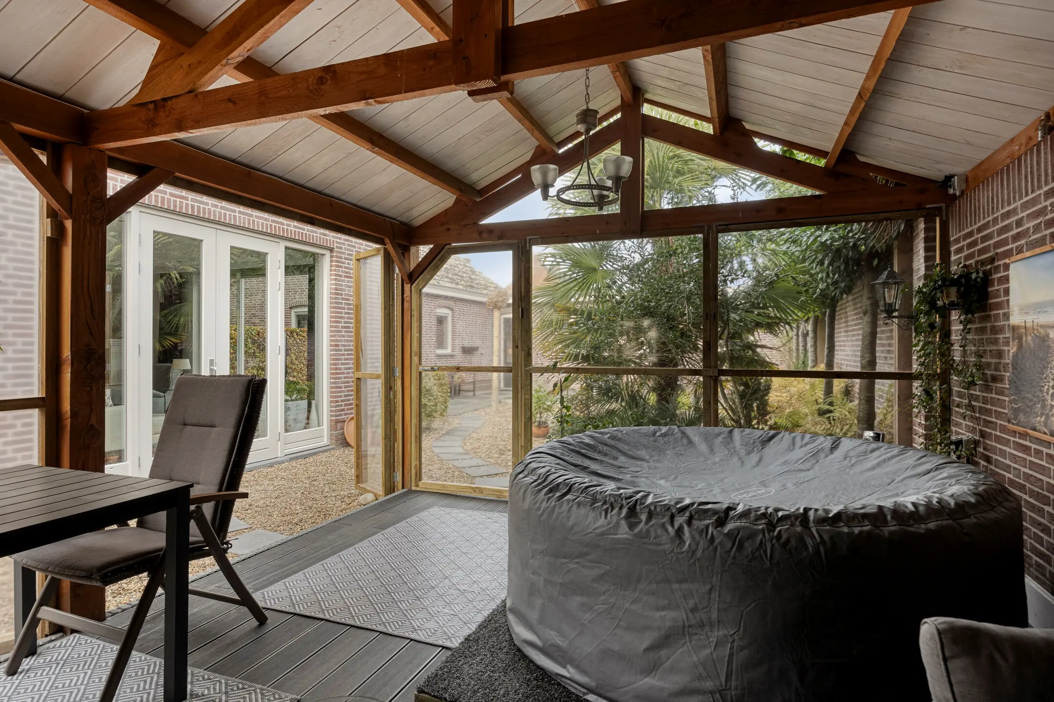 De achtertuin biedt volop privacy en is fraai ingericht met een vijver, een zonneterras met vlonderplanken van composiet, sierbestrating en grind. Daarnaast is er een mooie beplanting met vaste planten en twee palmbomen, wat zorgt voor een zomerse uitstraling. Achterin de tuin bevindt zich een sfeervolle, volledig afsluitbare overkapping. Deze kan desgewenst ook open worden gezet, zodat je optimaal kunt genieten van elk seizoen. De overkapping is voorzien van elektra, meerdere stopcontacten en twee elektrische kachels, waardoor het er het hele jaar door aangenaam vertoeven is.