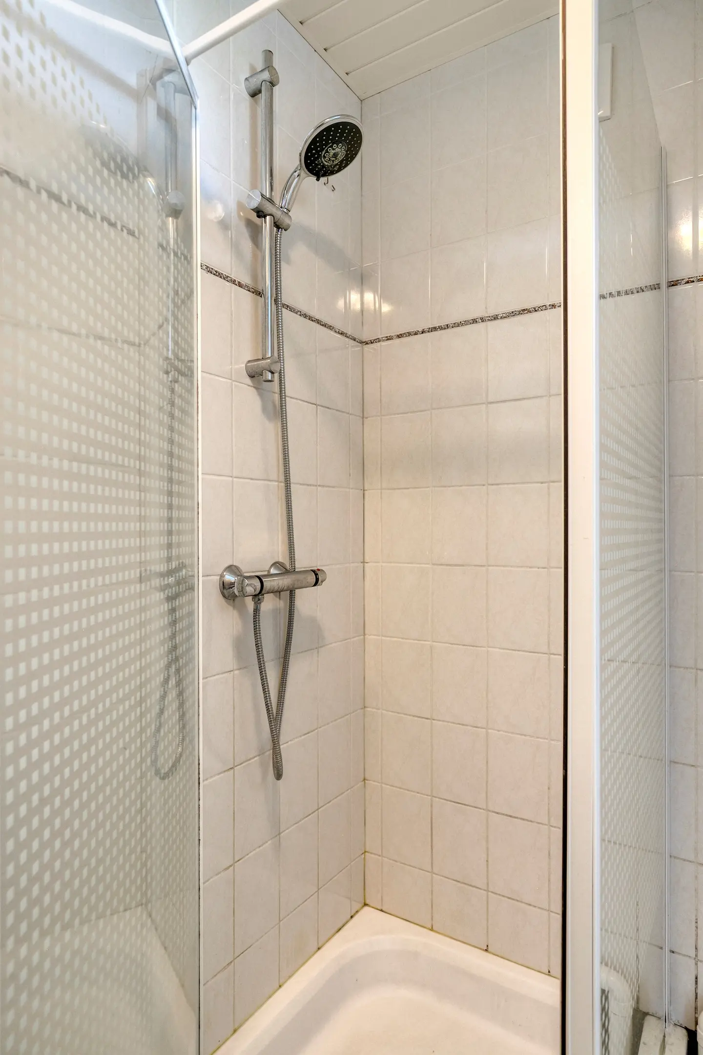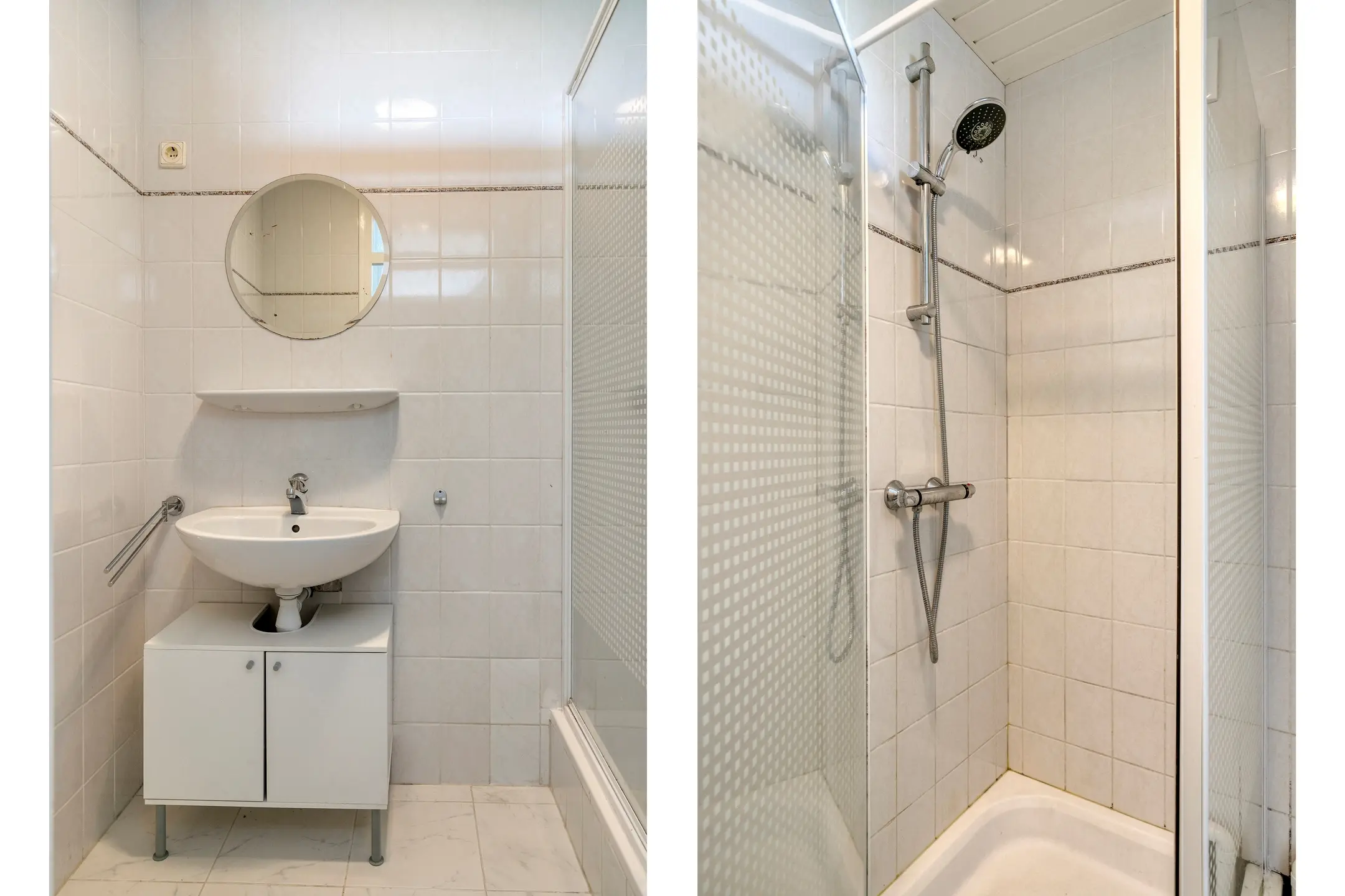 De geheel betegelde badkamer met mechanische ventilatie is voorzien van een wastafel, een wasmachine-aansluiting en een douchecabine met thermostaatkraan.