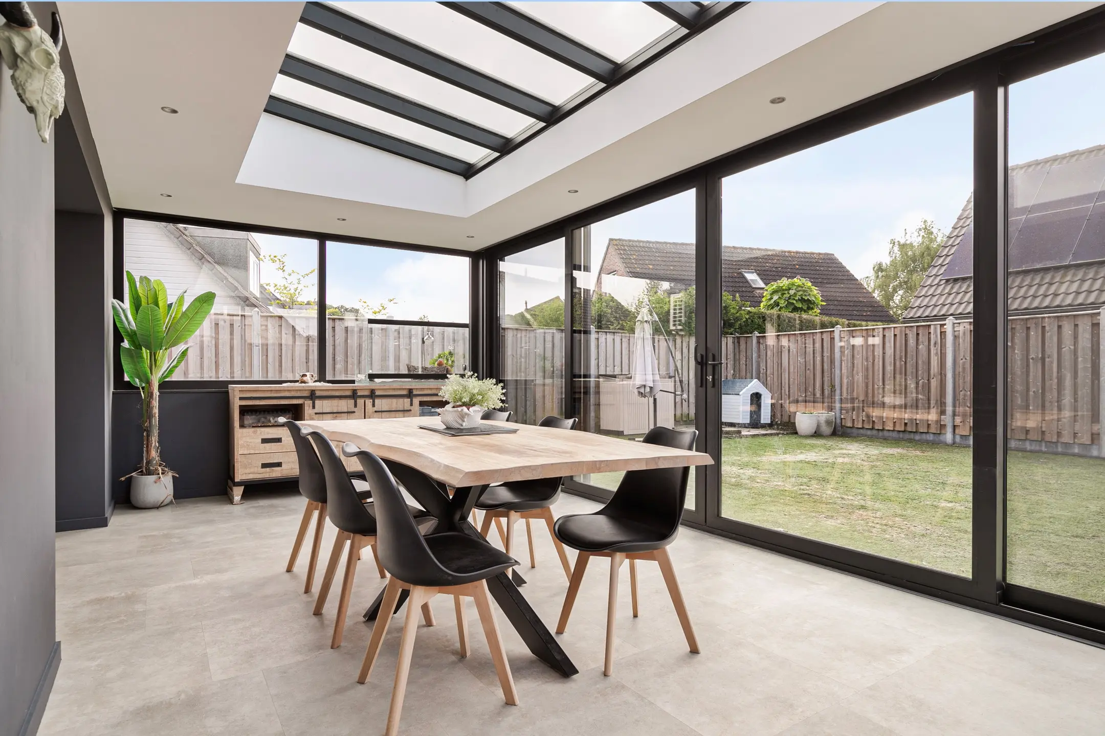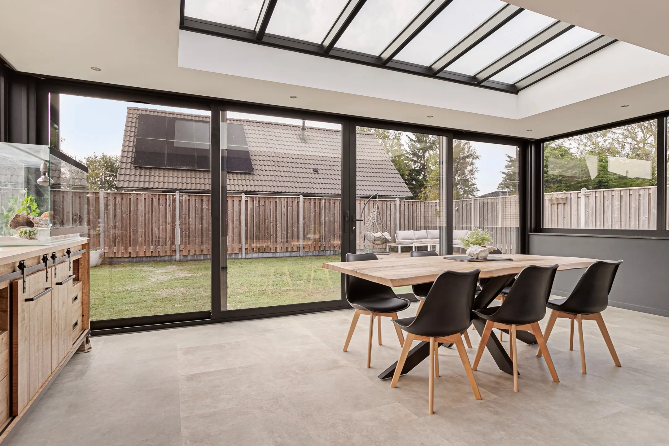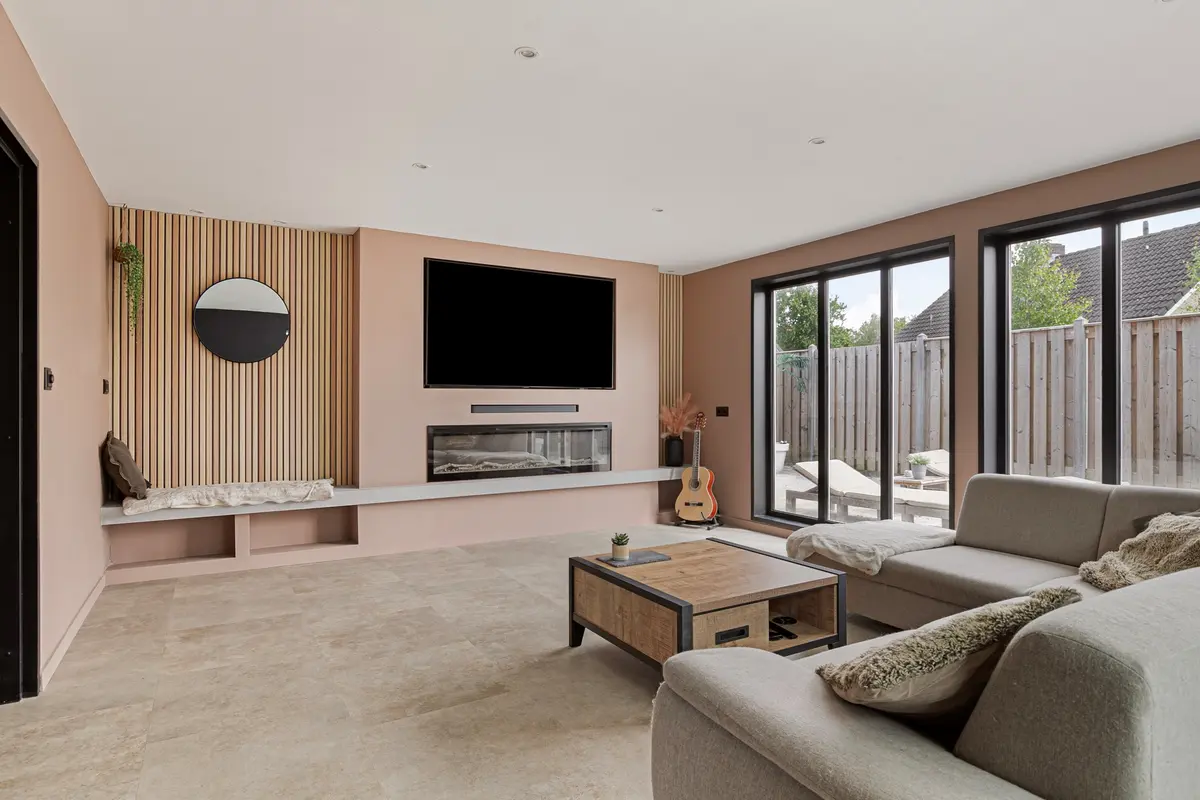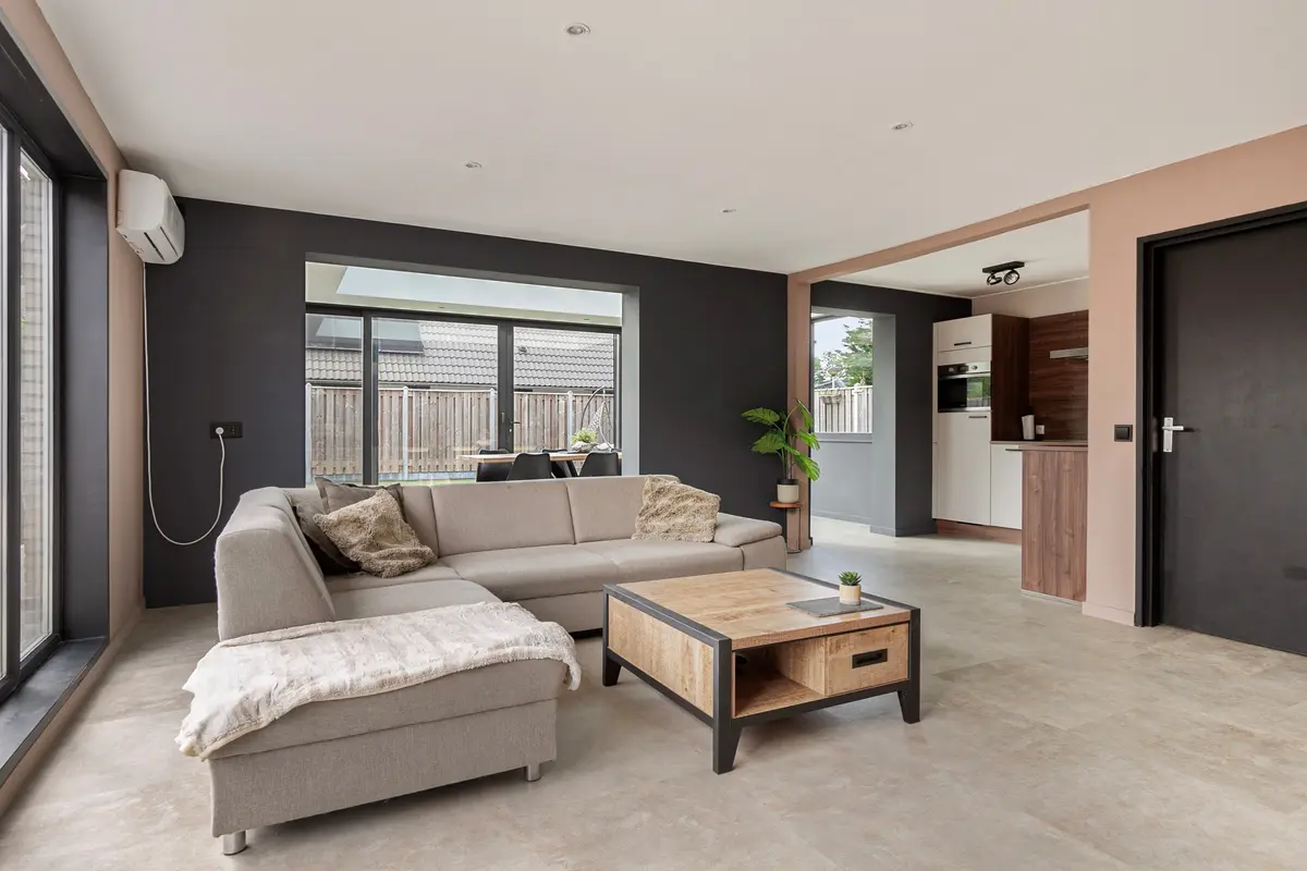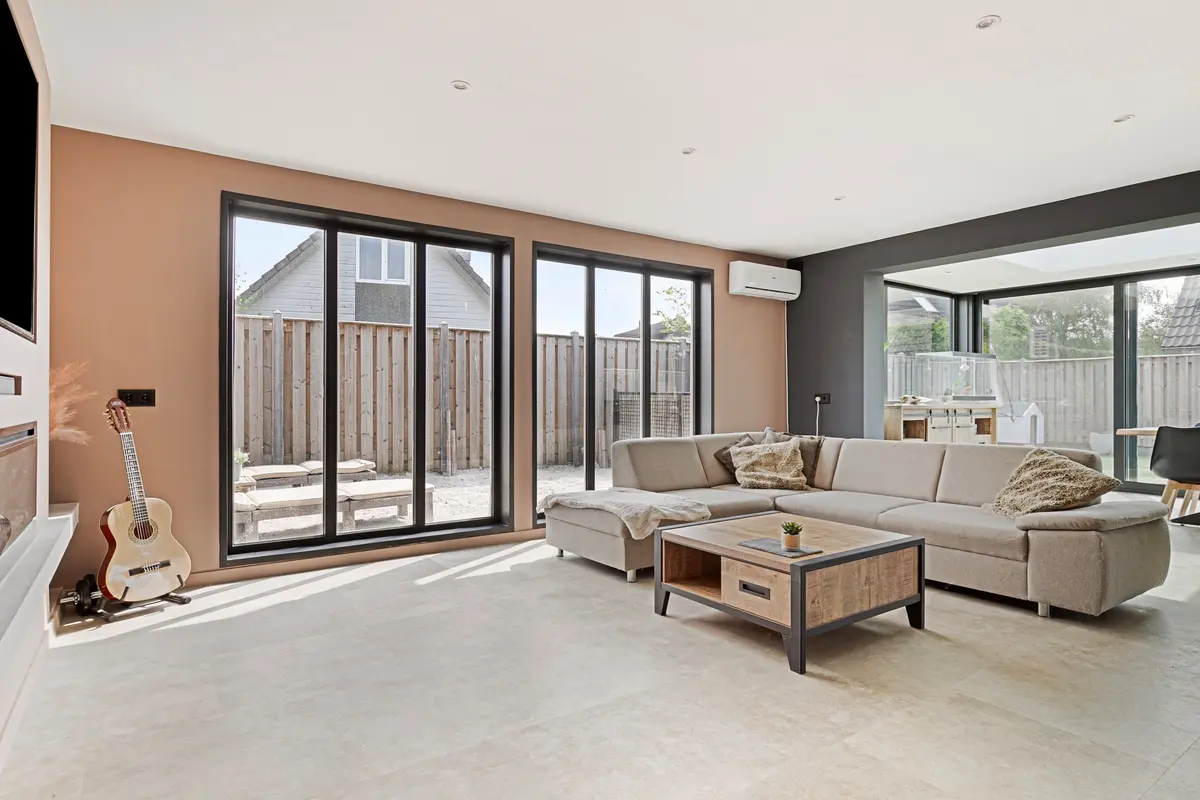- Tuingerichte woonkamer met schuifpui en toegang tot de tuin