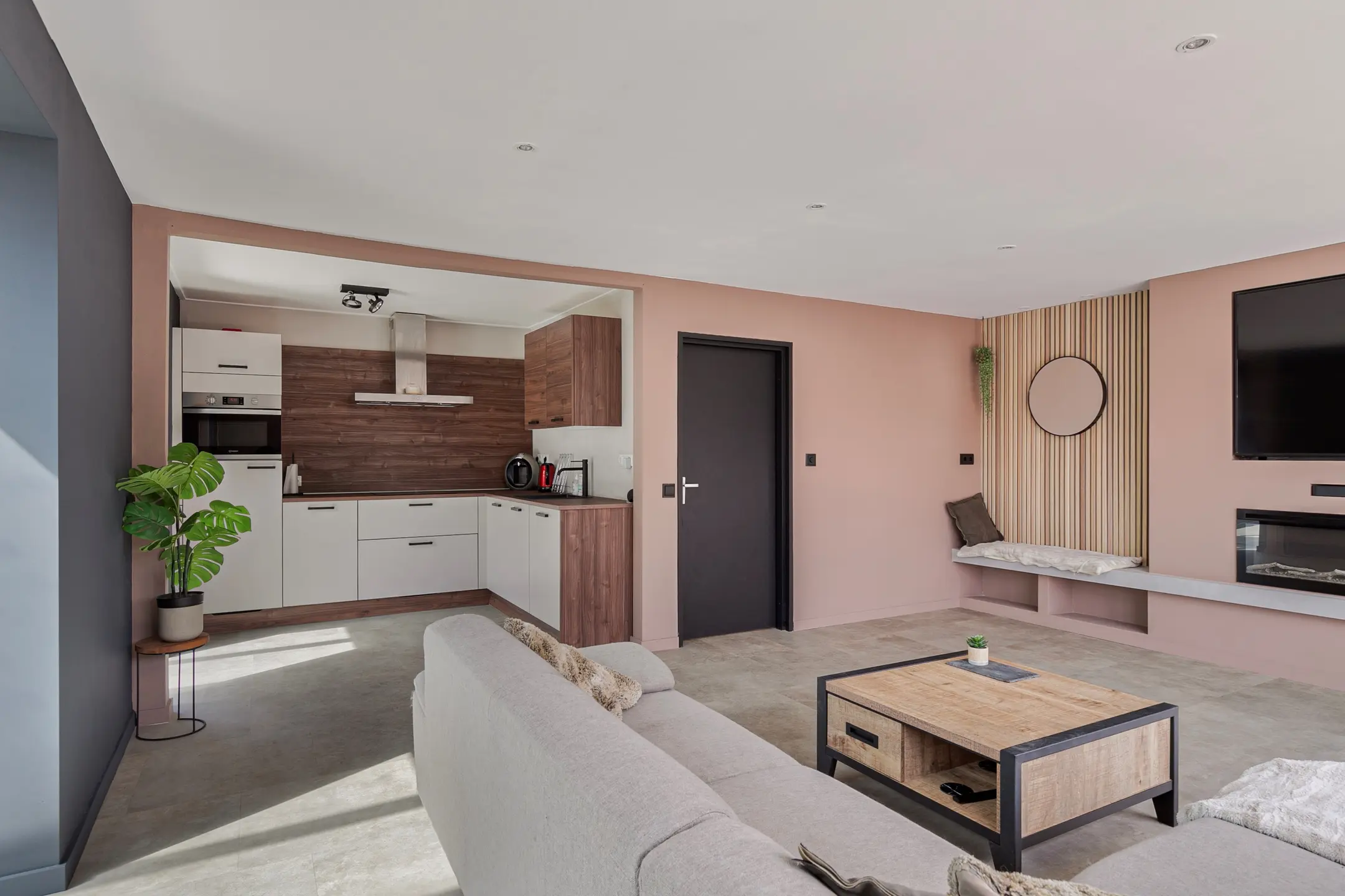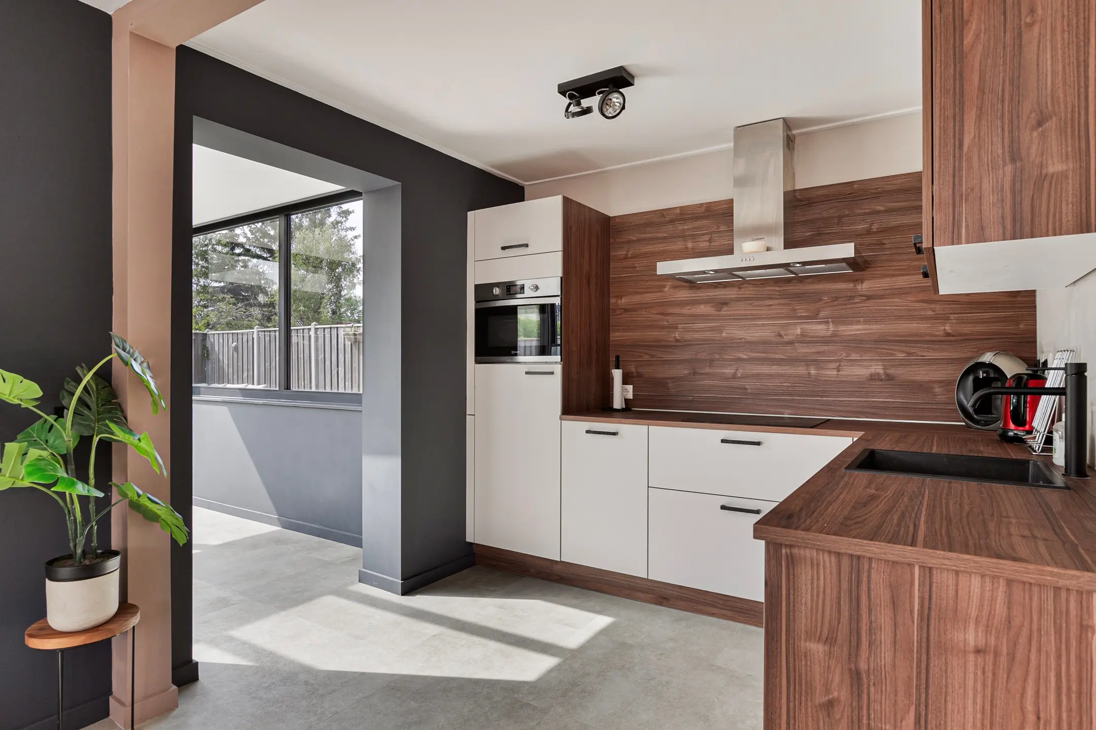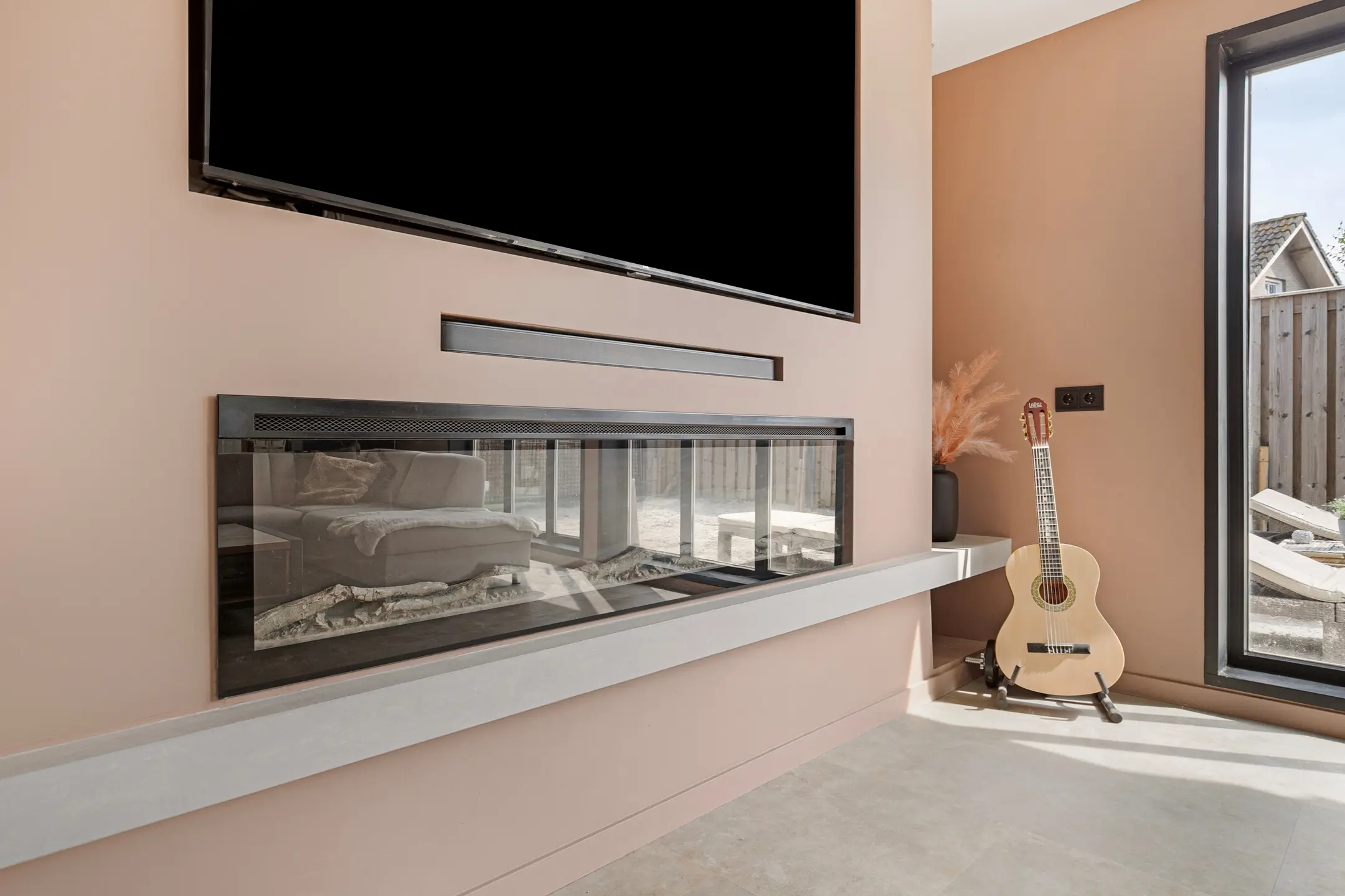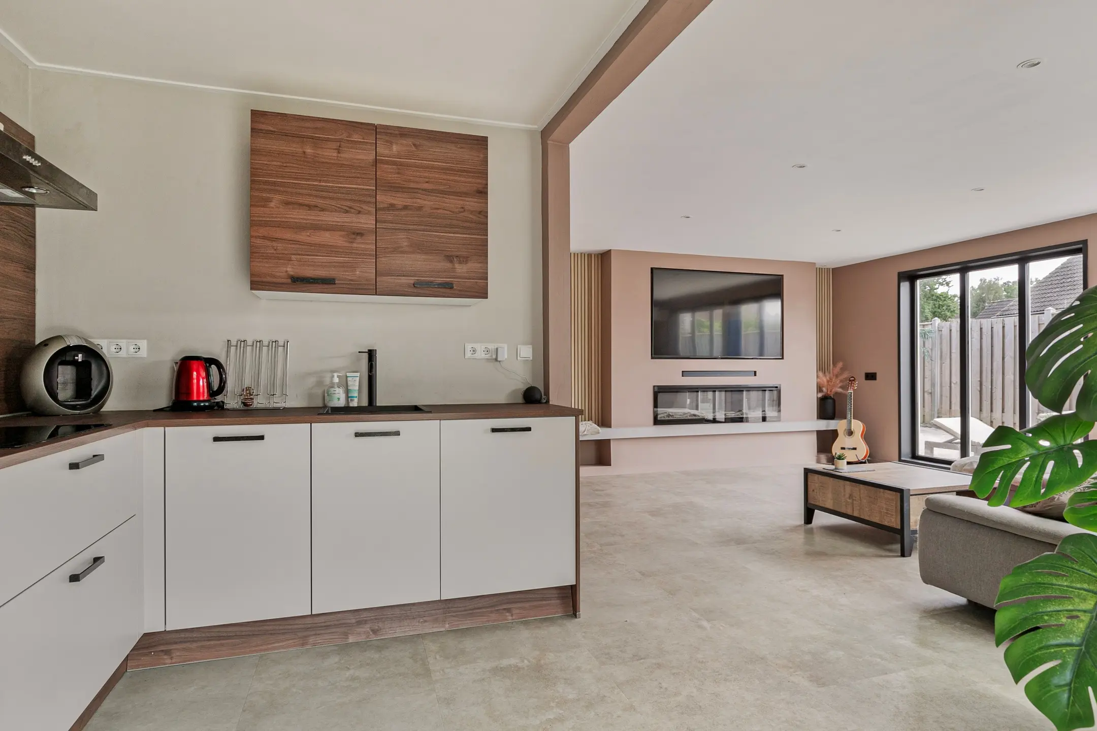Licht, ruimte en zicht op de privacy biedende tuin! De woonkamer heeft meerdere raampartijen, een schuifpui en een mooie open keuken. De wanden zijn deels voorzien van strak stucwerk en het plafond is strak gestuct en voorzien van inbouwspots. De ingebouwde gashaard geeft extra sfeer aan deze woonkamer. De woonkamer heeft airconditioning die heerlijk koelt en de zomer en met koudere dagen de woonkamer kan verwarmen.