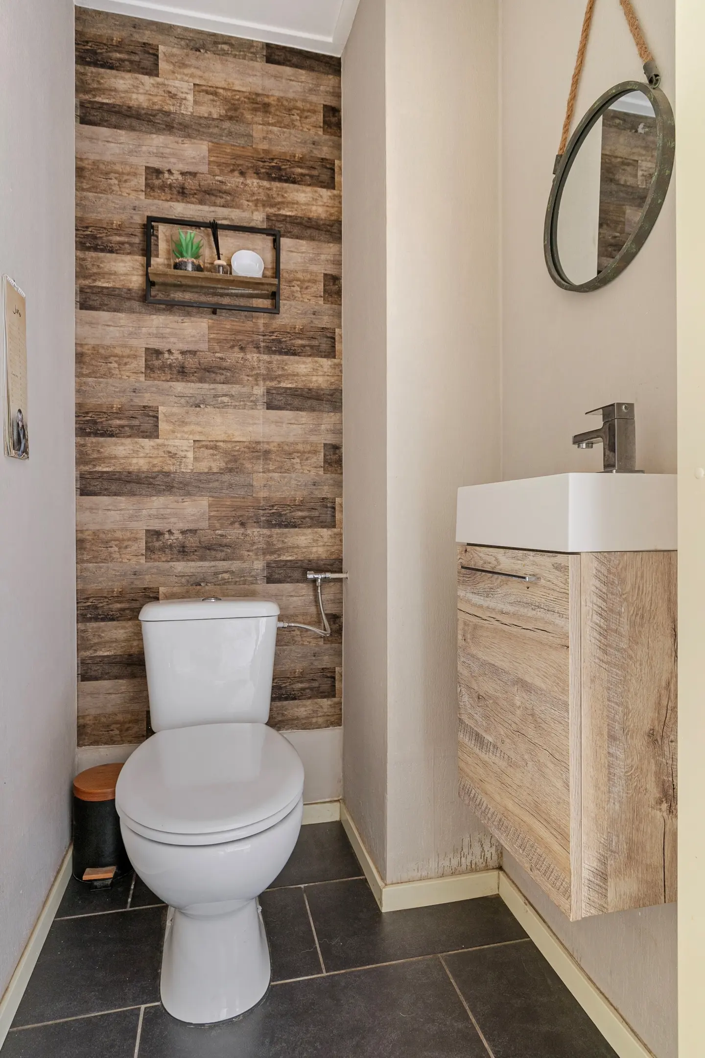 De gehele benedenverdieping, met uitzonderding van de badkamer, is voorzien van een Rigid PVC-vloer.