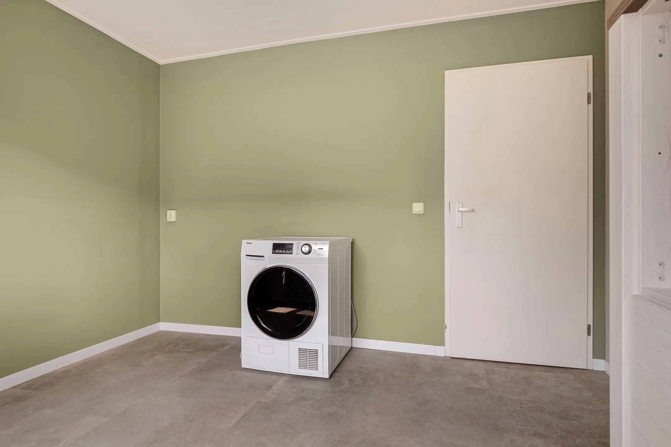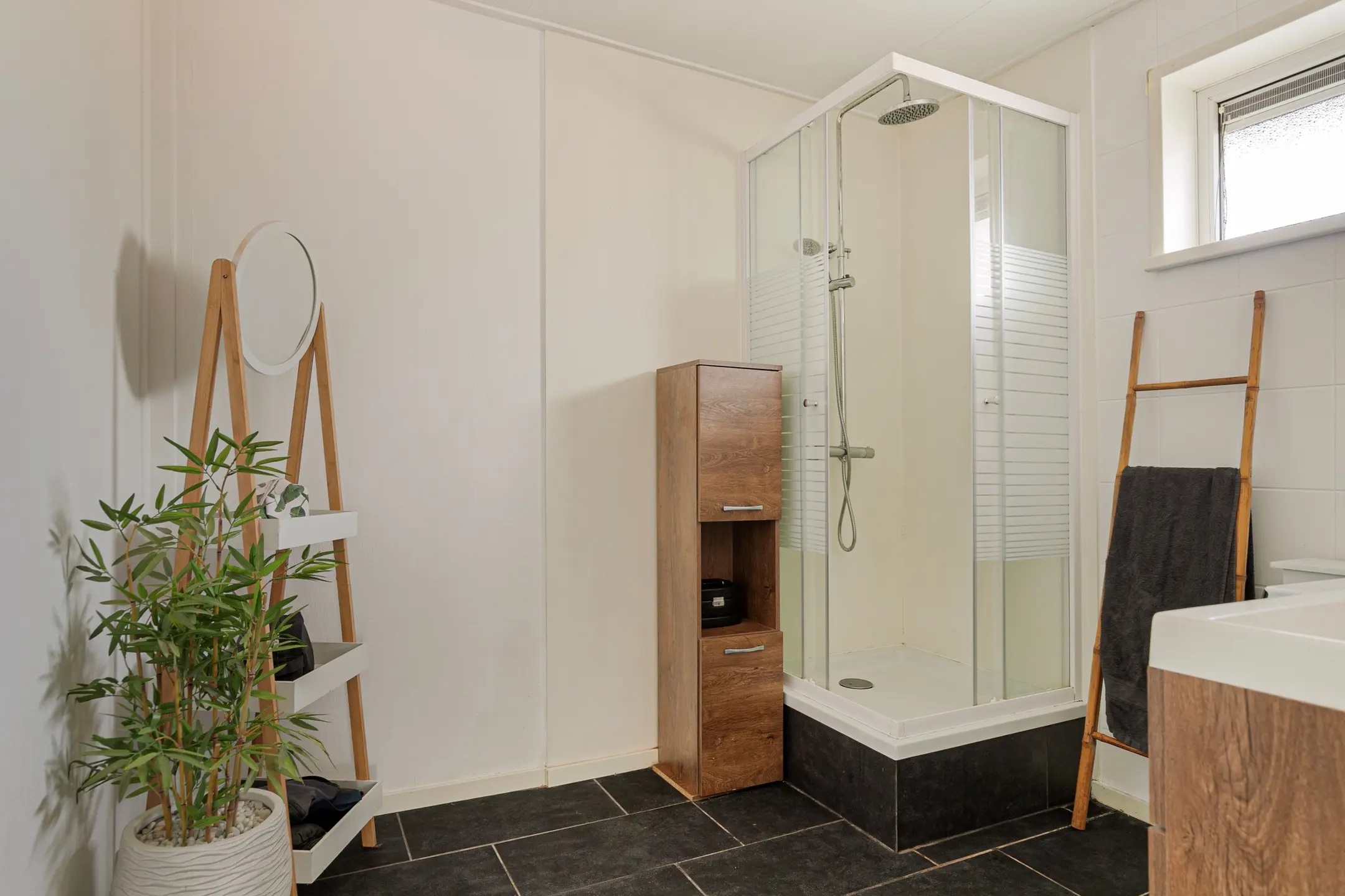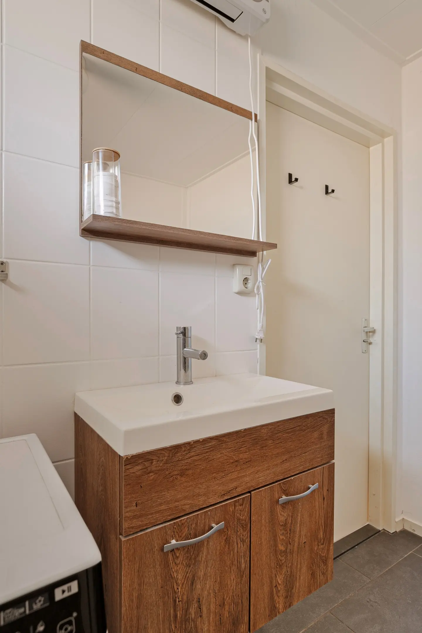 De badkamer is voorzien van een douchecabine en een wastafel met een badkamermeubel. In de badkamer is de aansluiting voor een wasmachine en droger. Deze ruimte is geheel betegeld.