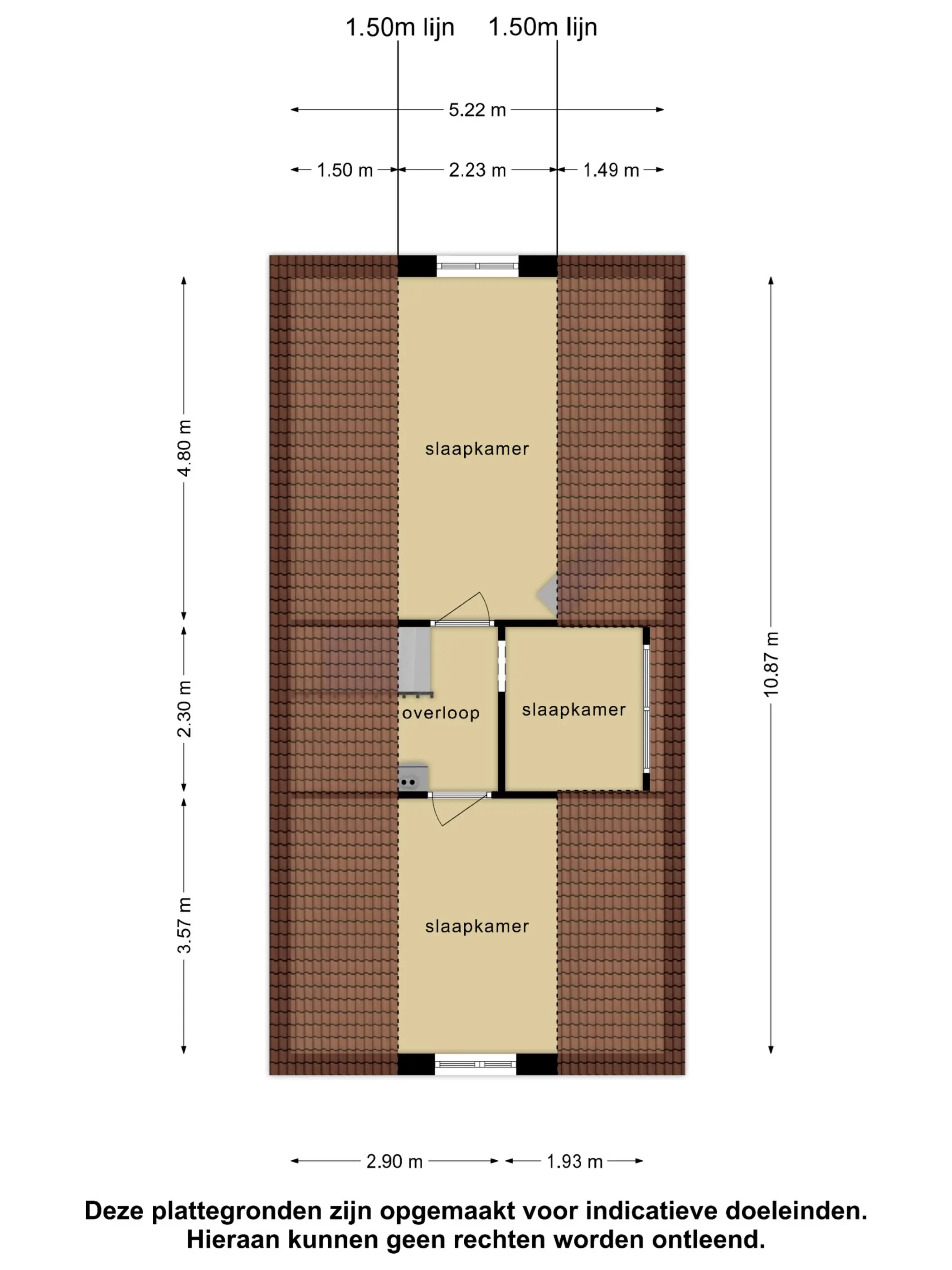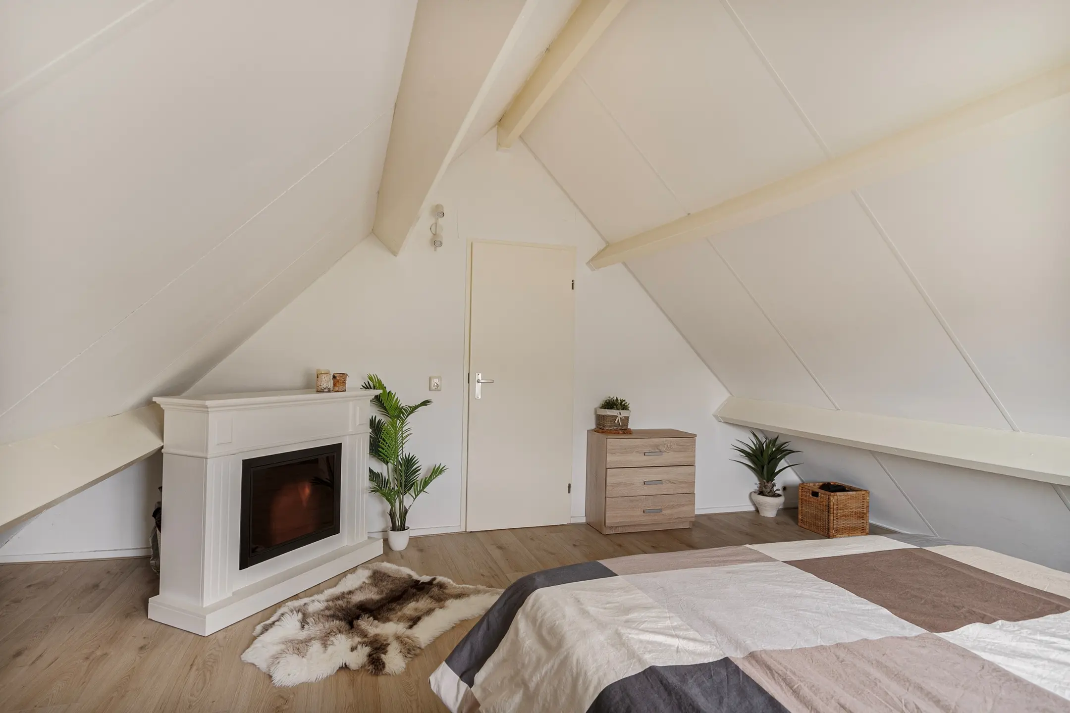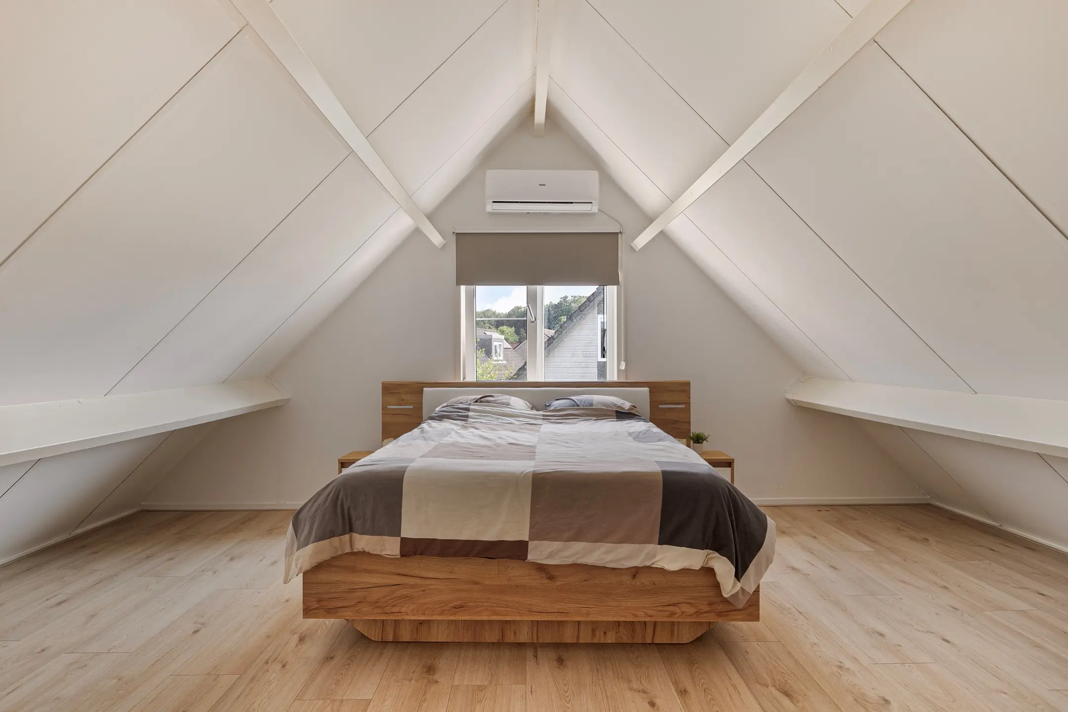 Twee slaapkamers zijn nagenoeg gelijkwaardig aan elkaar, hebben een laminaatvloer en een schuine wandafwerking. Eén slaapkamer is voorzien van airconditioning.