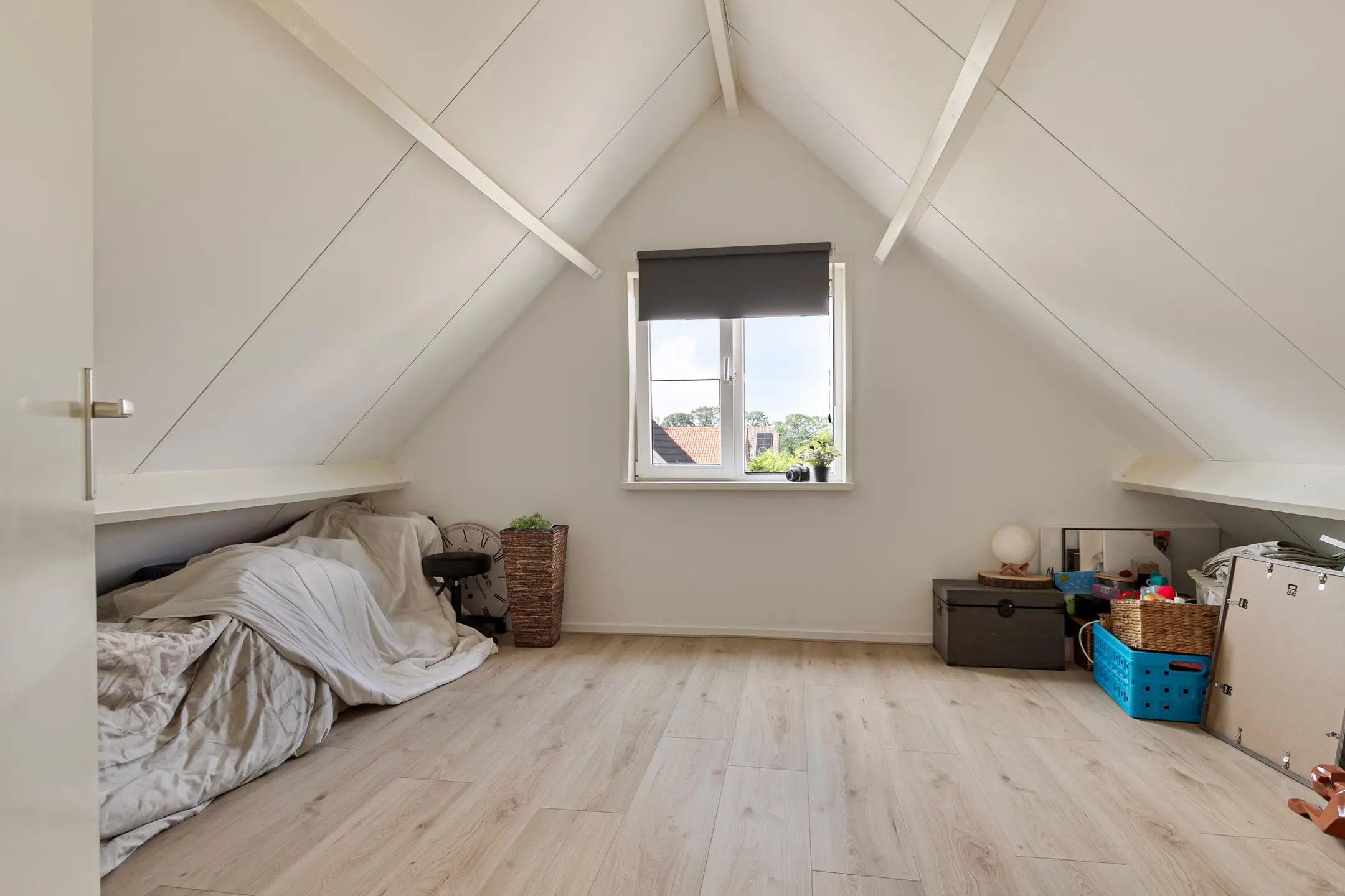 De kleinere slaapkamer op deze verdieping is voorzien van een dakkapel.