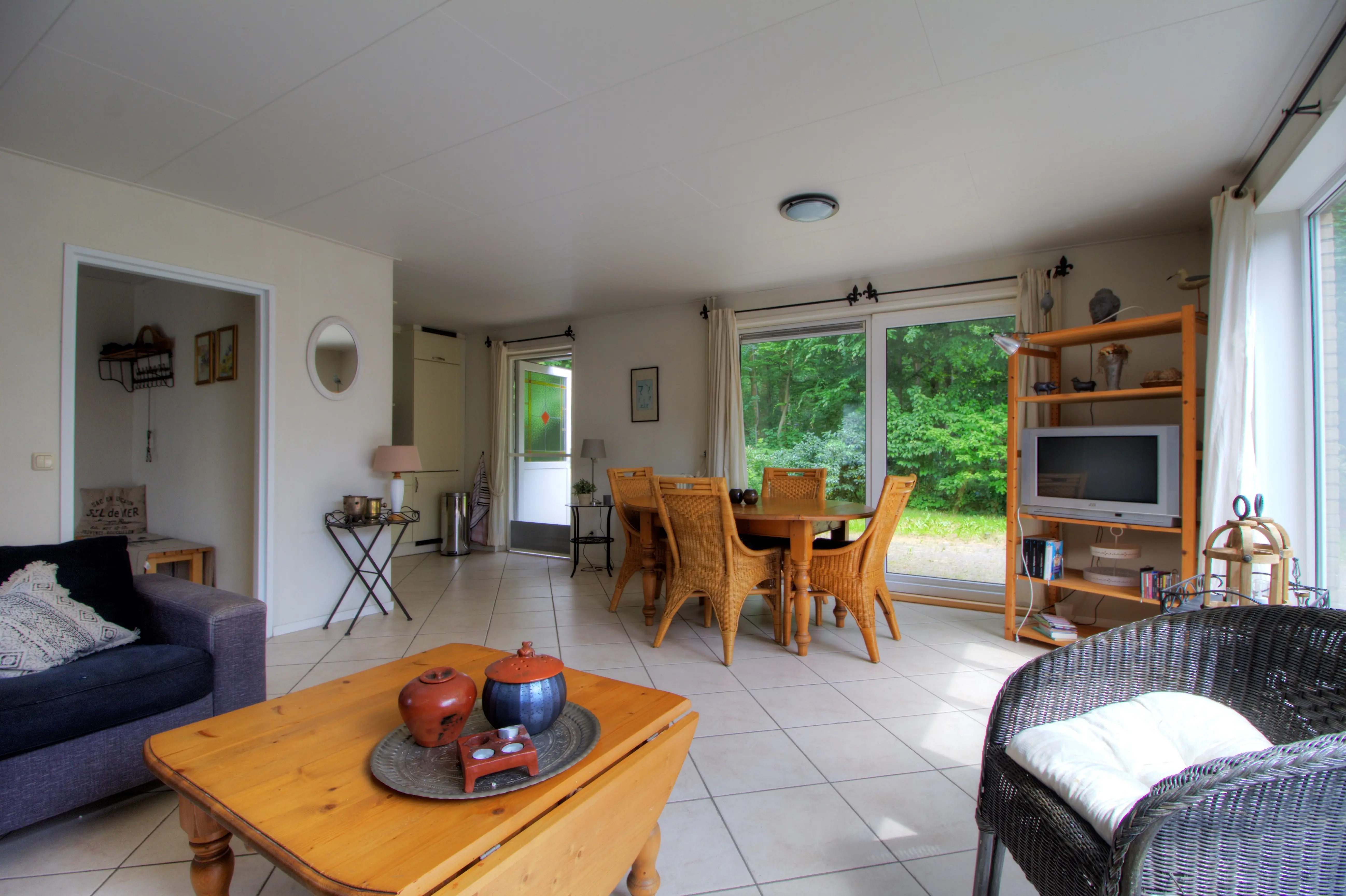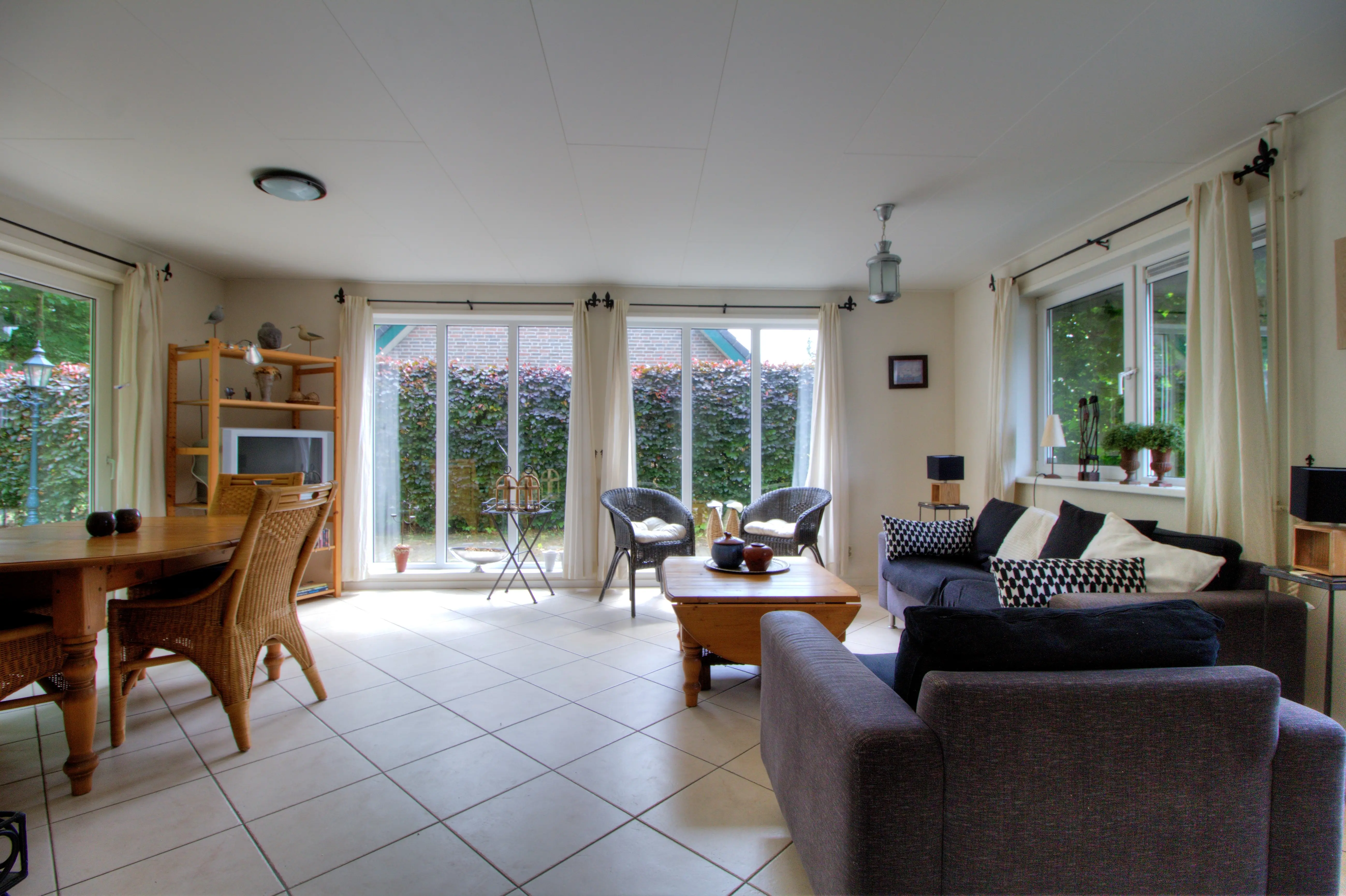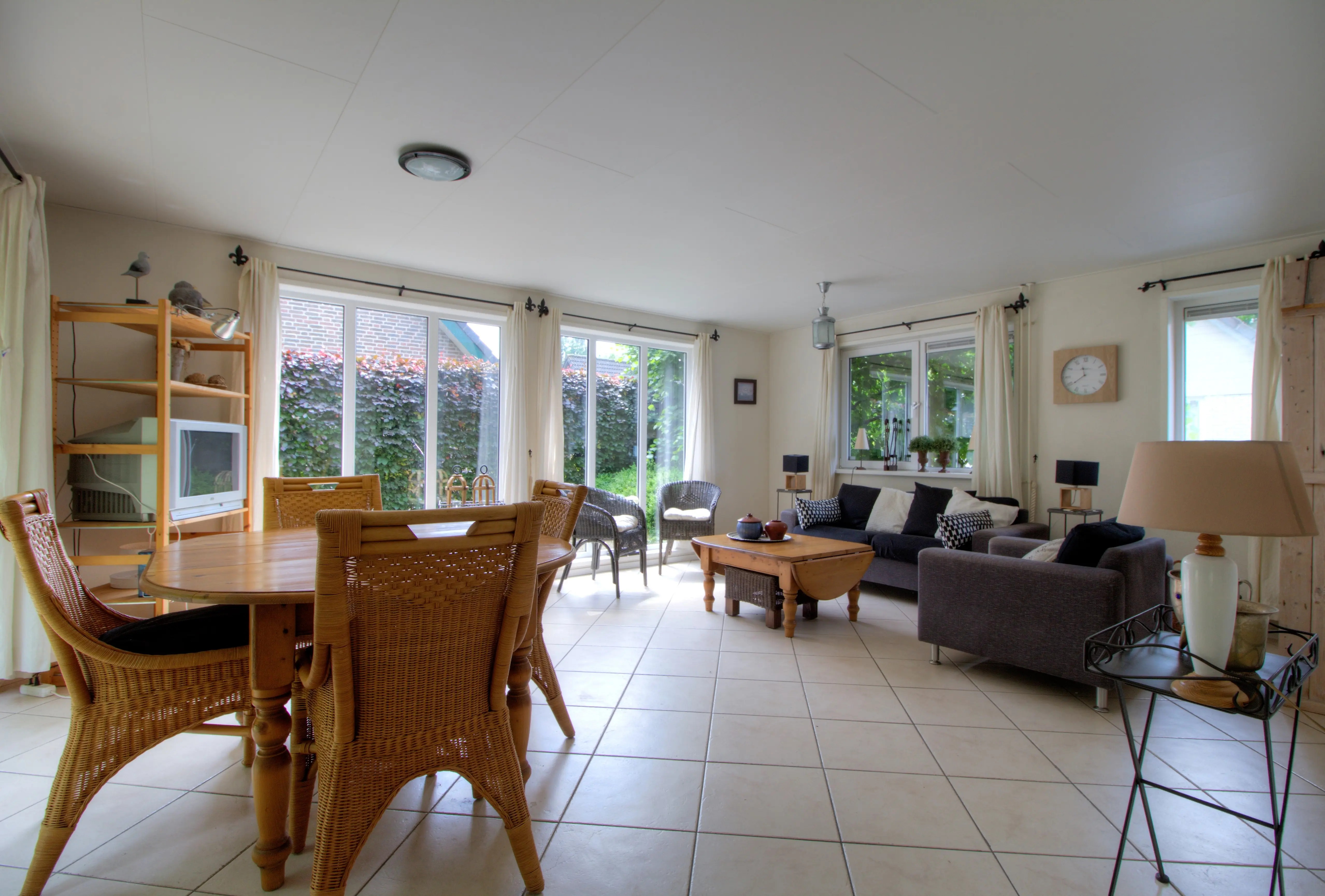 De woonkamer is een lichte ruimte met uitzicht op de tuin en rondom meerdere raampartijen. We schreven het al eerder, de ligging op het perceel en de groene haag rondom maakt het dat je hier veel privacy geniet!