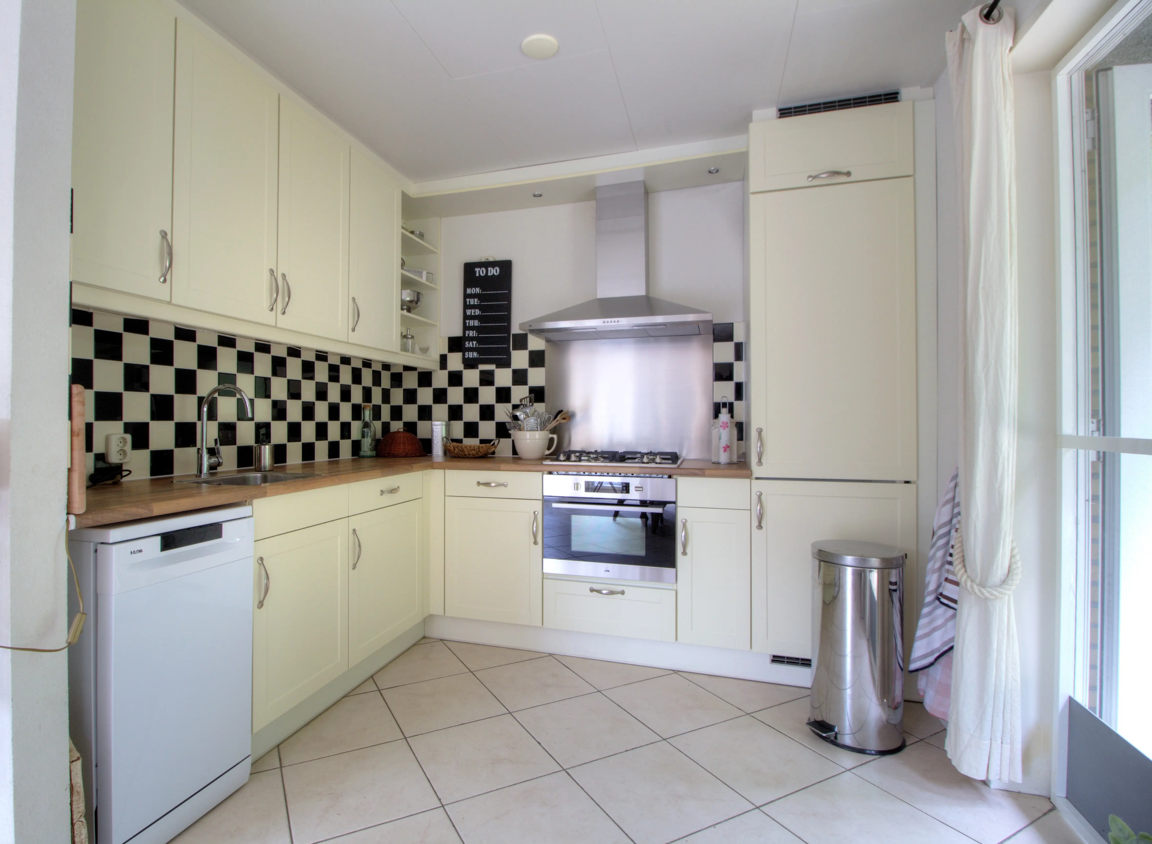 De lichte L-vormige open keuken heeft diverse boven- en onderkasten en is voorzien van een 4-pitskookplaat, roestvrij stalen afzuigkap, combi-oven, koelkast en vaatwasser.