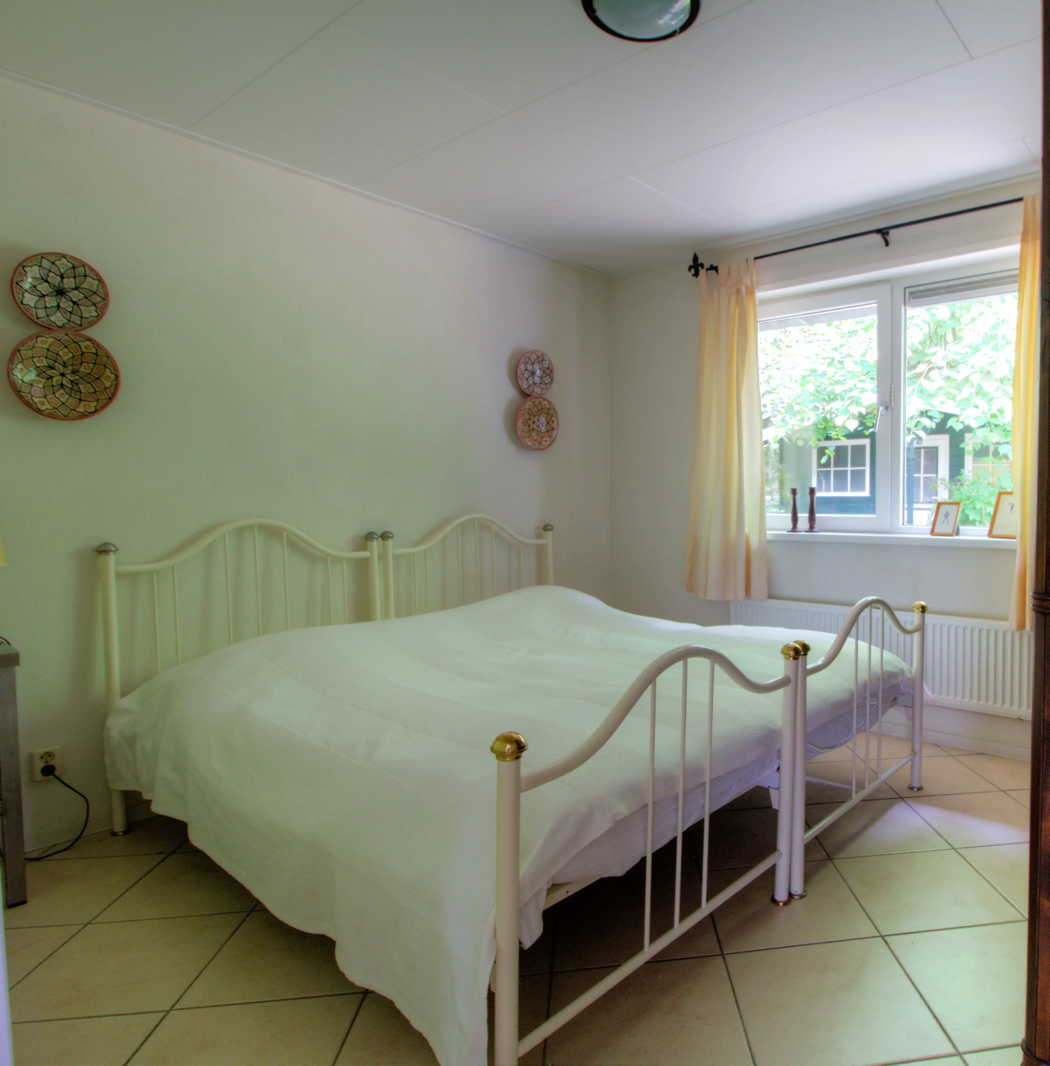 De 1e slaapkamer op de benedenverdieping is rustig gelegen aan de achterzijde van de woning en kijkt uit op de tuin. De slaapkamer heeft een lichte afwerking van de wanden en het plafond. De vloer is voorzien van een tegelvloer.