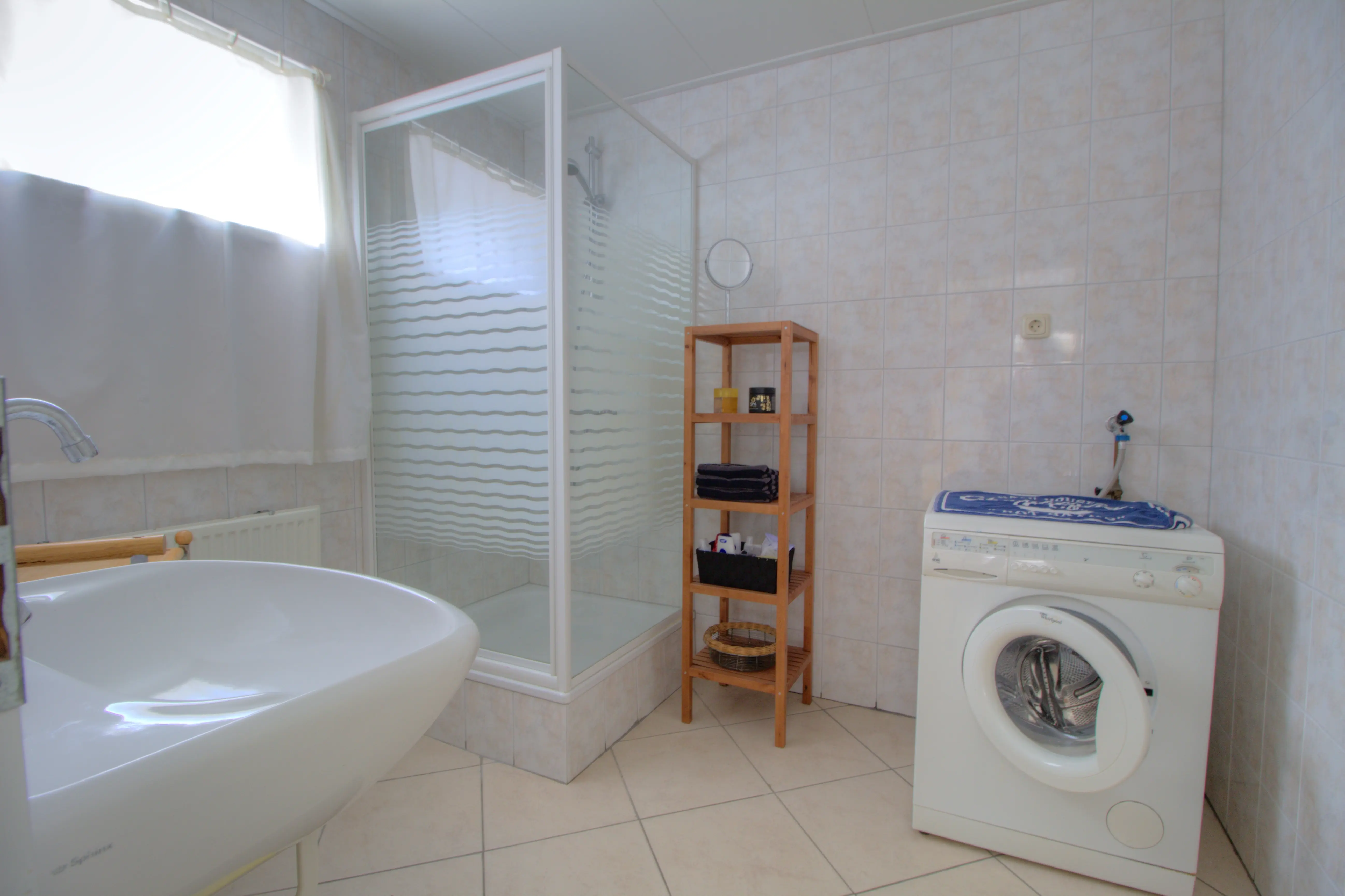 De badkamer is voorzien van een wastafel, douche en een wasmachineaansluiting.