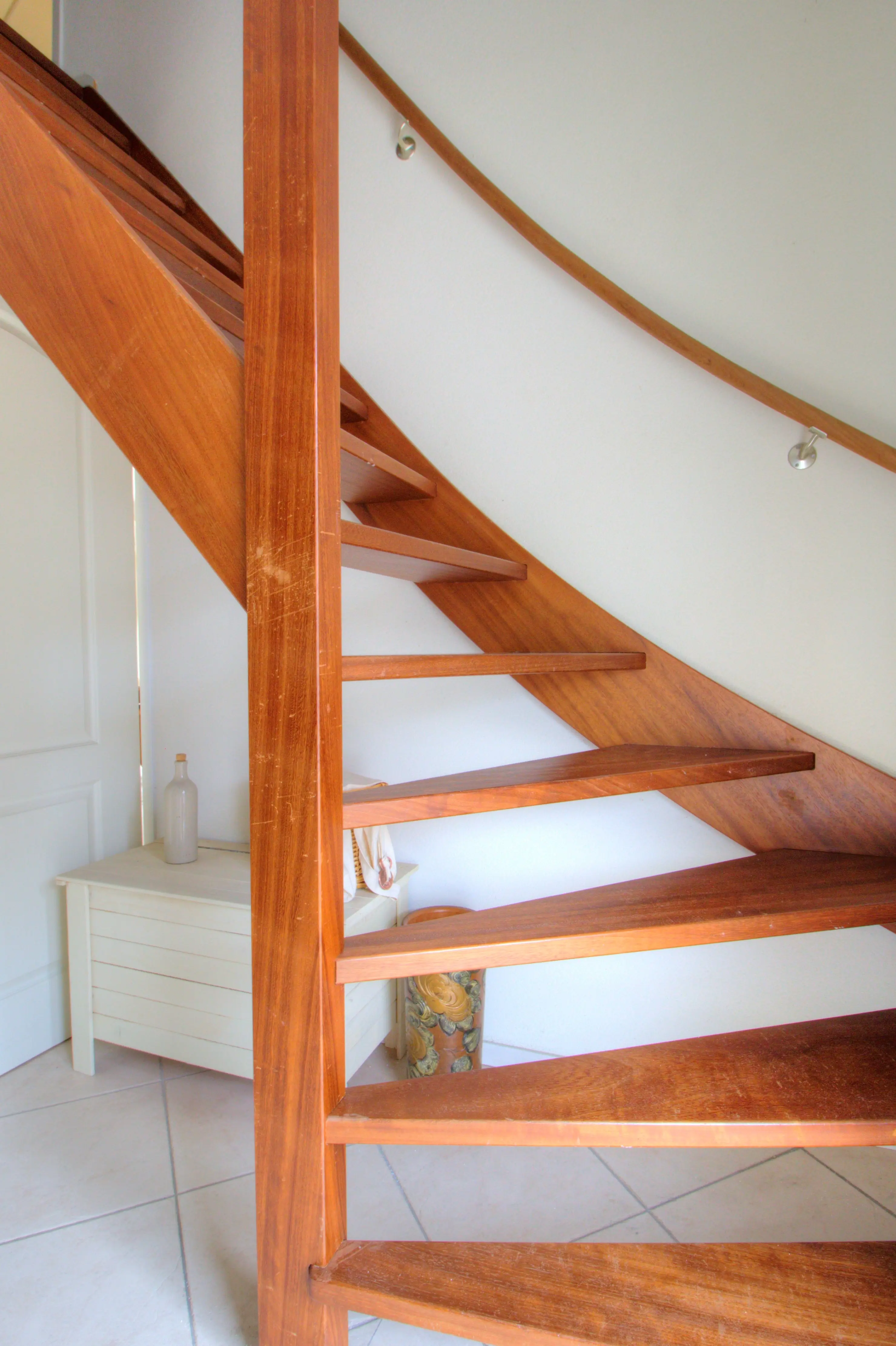 De ontvangsthal, met een robuuste houten trap naar de bovenverdieping , geeft toegang tot de woonkamer, 1e slaapkamer, badkamer en separate toiletruimte. De gehele benedenverdieping is voorzien van een tegelvloer.