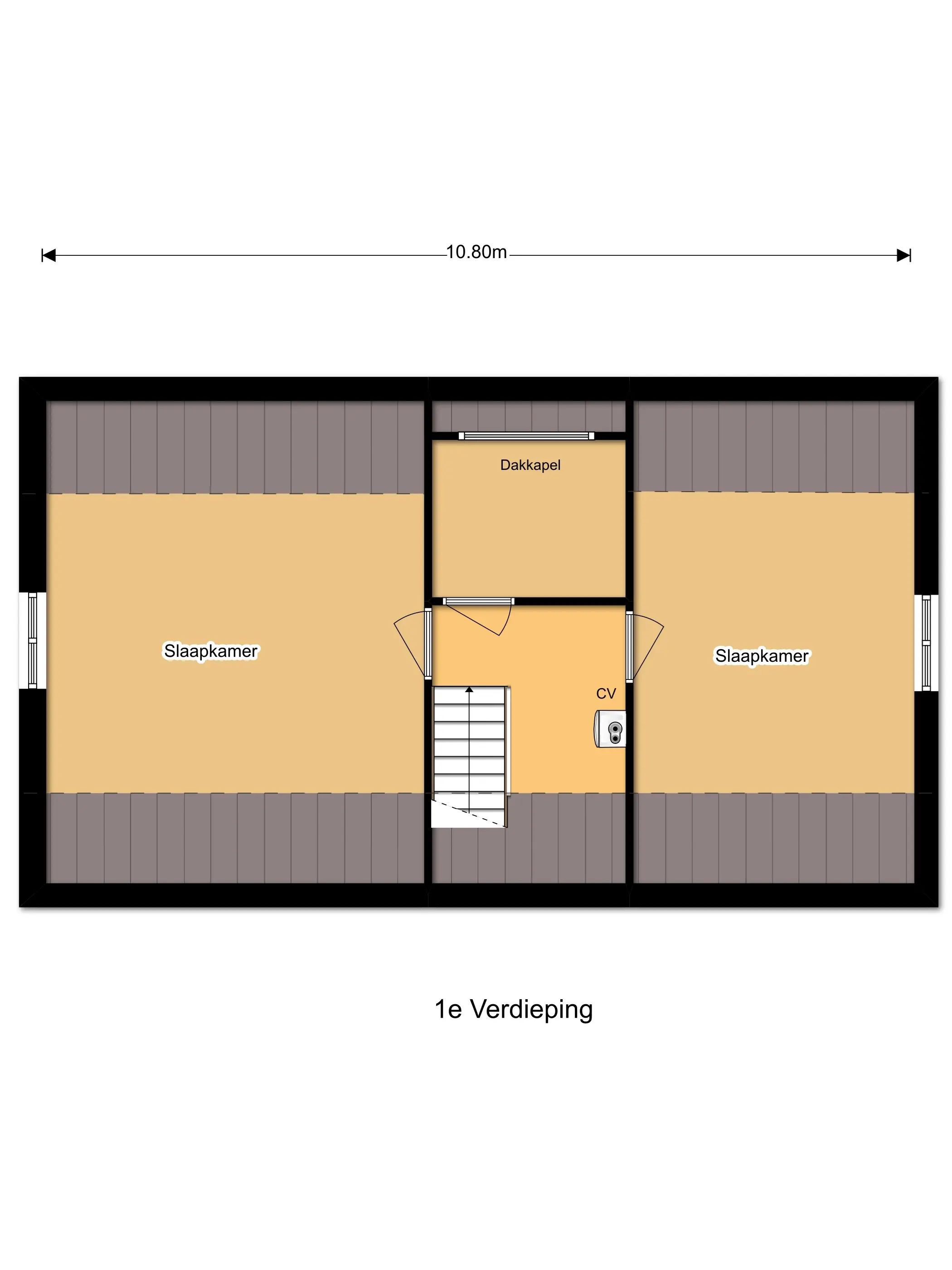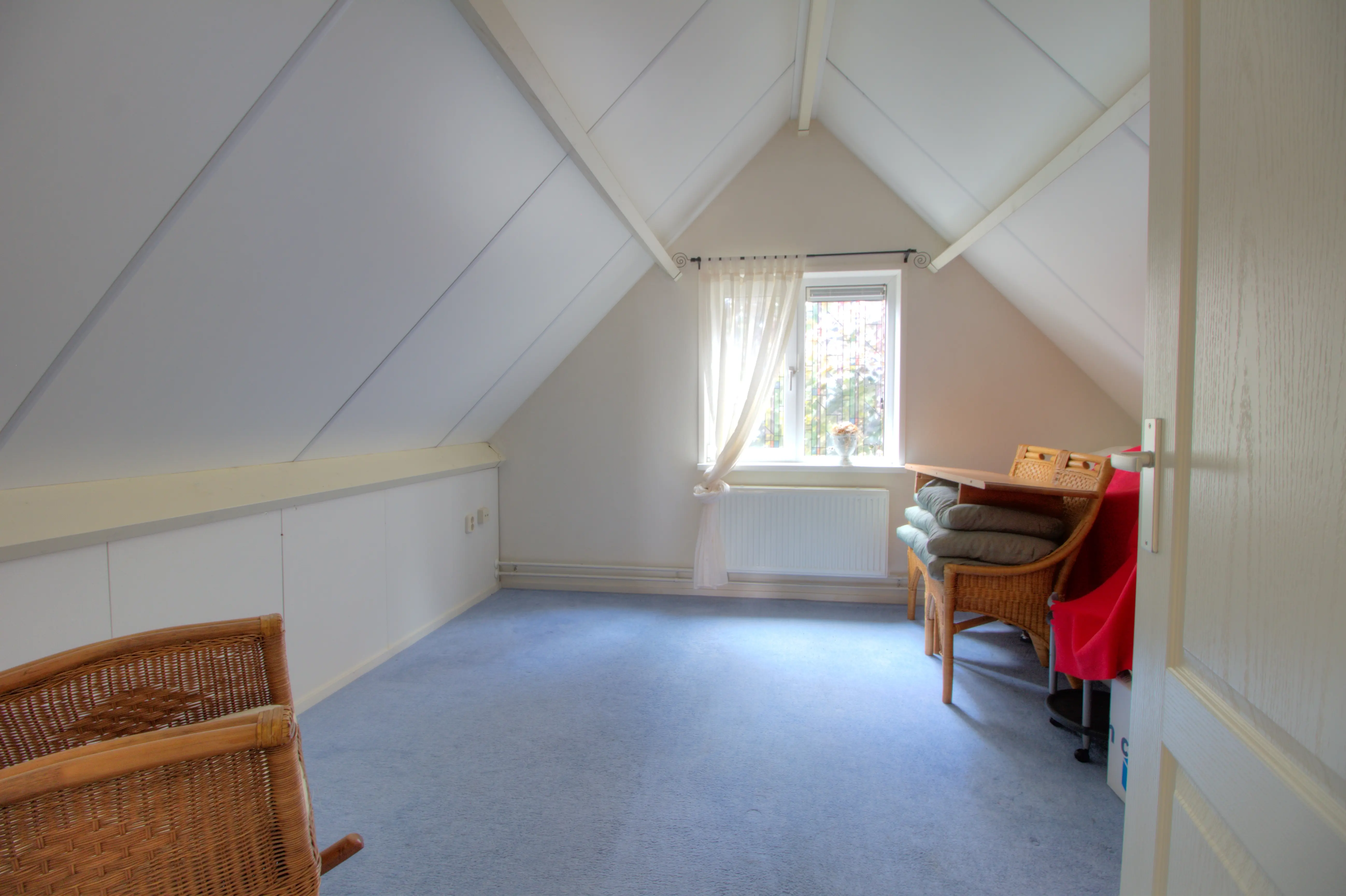 De houten trap in de ontvangsthal geeft toegang tot de 1e verdieping met overloop en 2e en 3e slaapkamer. Beide slaapkamers zijn nagenoeg gelijkwaardige aan elkaar en hebben vloerbedekking, een schuine wandafwerking en een raampartij. Twee fijne kamers, ideaal als slaapkamer maar bijvoorbeeld ook in te richten als hobby- of werkruimte. Tevens is op deze verdieping nog een kleinere kamer.