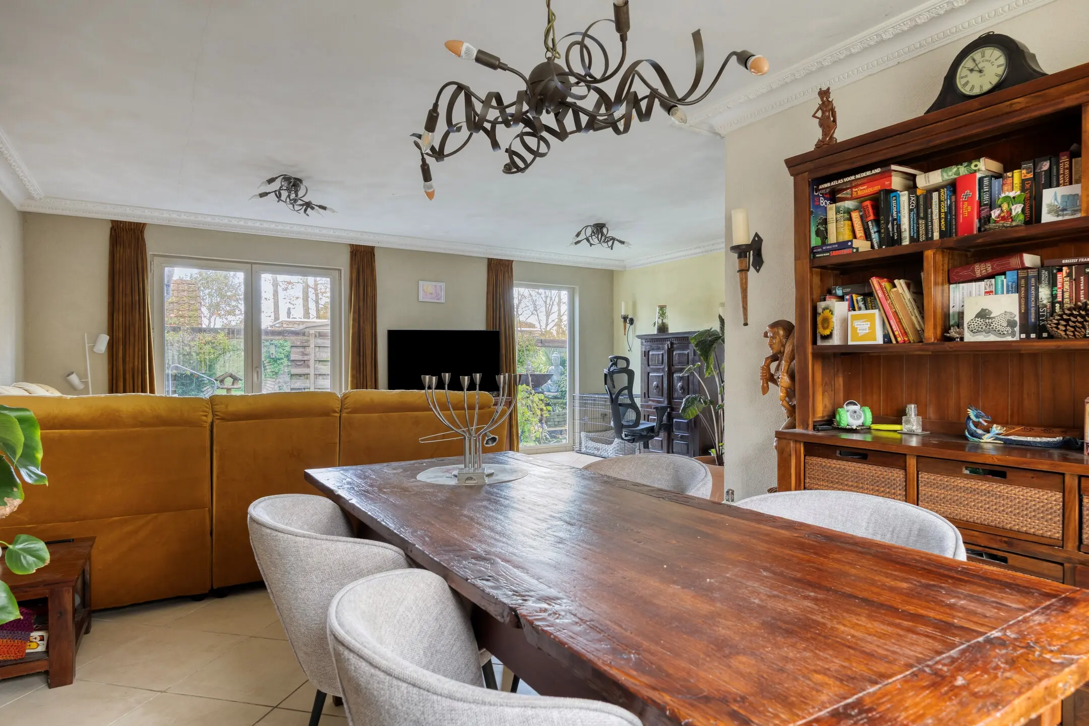 De lichte en ruime L-vormige woonkamer heeft meerdere raampartijen, een tegelvloer, met vloerverwarming en openslaande tuindeuren die toegang geven tot de privacy biedende achtertuin. De wanden zijn afgewerkt met stucwerk en het plafond is afgewerkt met stucwerk en sierlijsten.