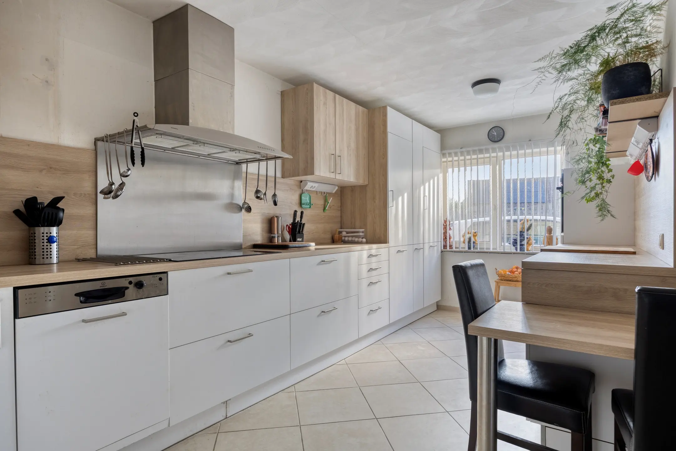 De ruime keuken heeft diverse boven- en onderkasten, een houten aanrechtblad, inductiekookplaat, rvs afzuigkap, koelkast, vriezer, vaatwasser en oven.