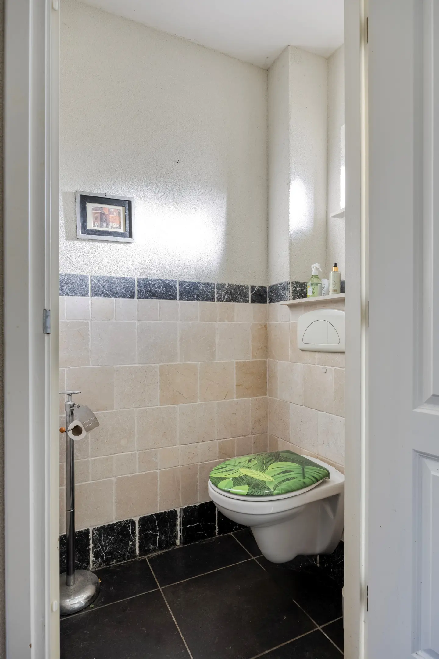 De toiletruimte is voorzien van een wandcloset, mechanische afzuiging en is deels betegeld.