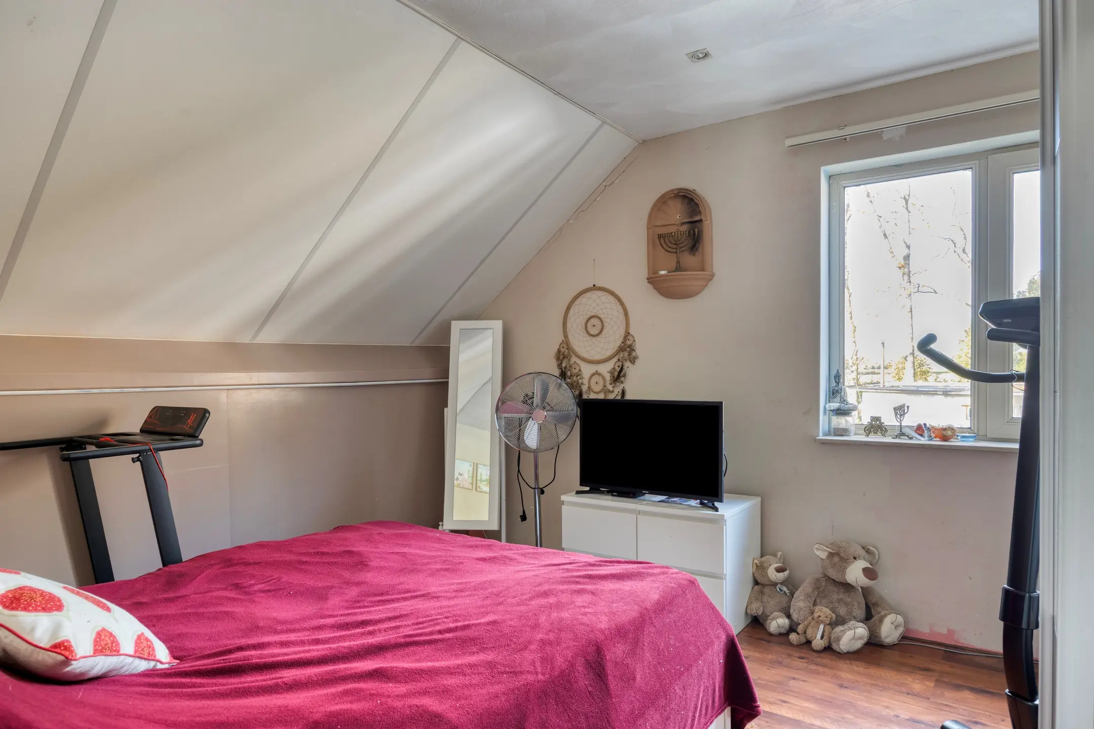 De 1e slaapkamer is ruim van afmeting en is voorzien van een laminaatvloer, extra bergruimte achter het knieschot.