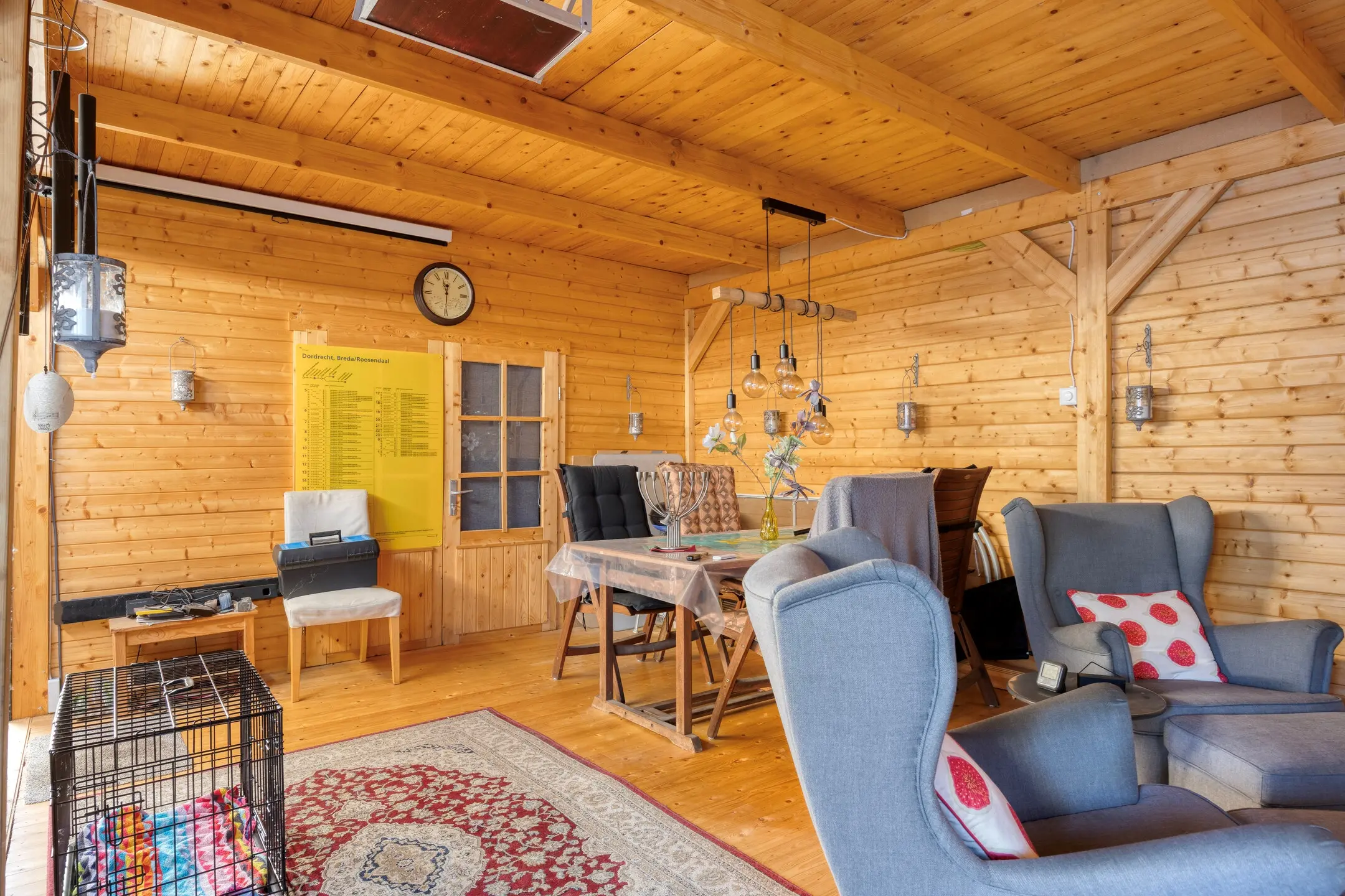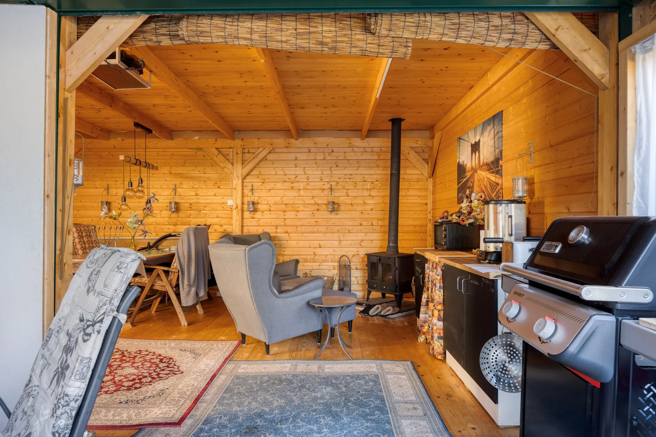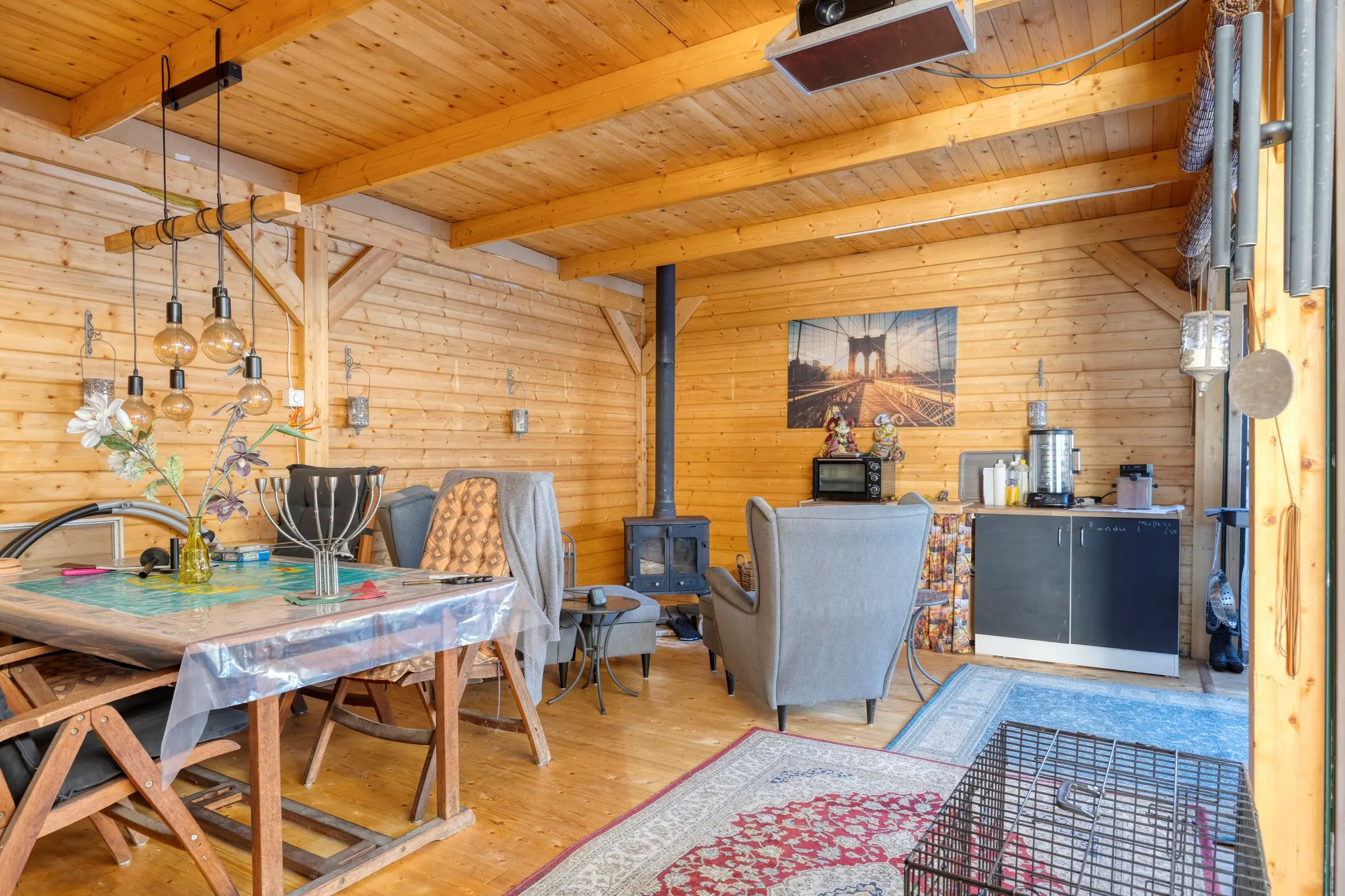De tuin is aangelegd met bestrating, grind en vaste platen. Verder vindt u hier een houten berging en een sfeervolle overkapping, voorzien van een houtkachel en een keukenblok – de ideale plek om het hele jaar door van te genieten.