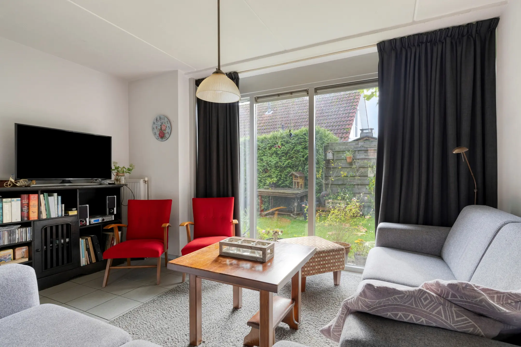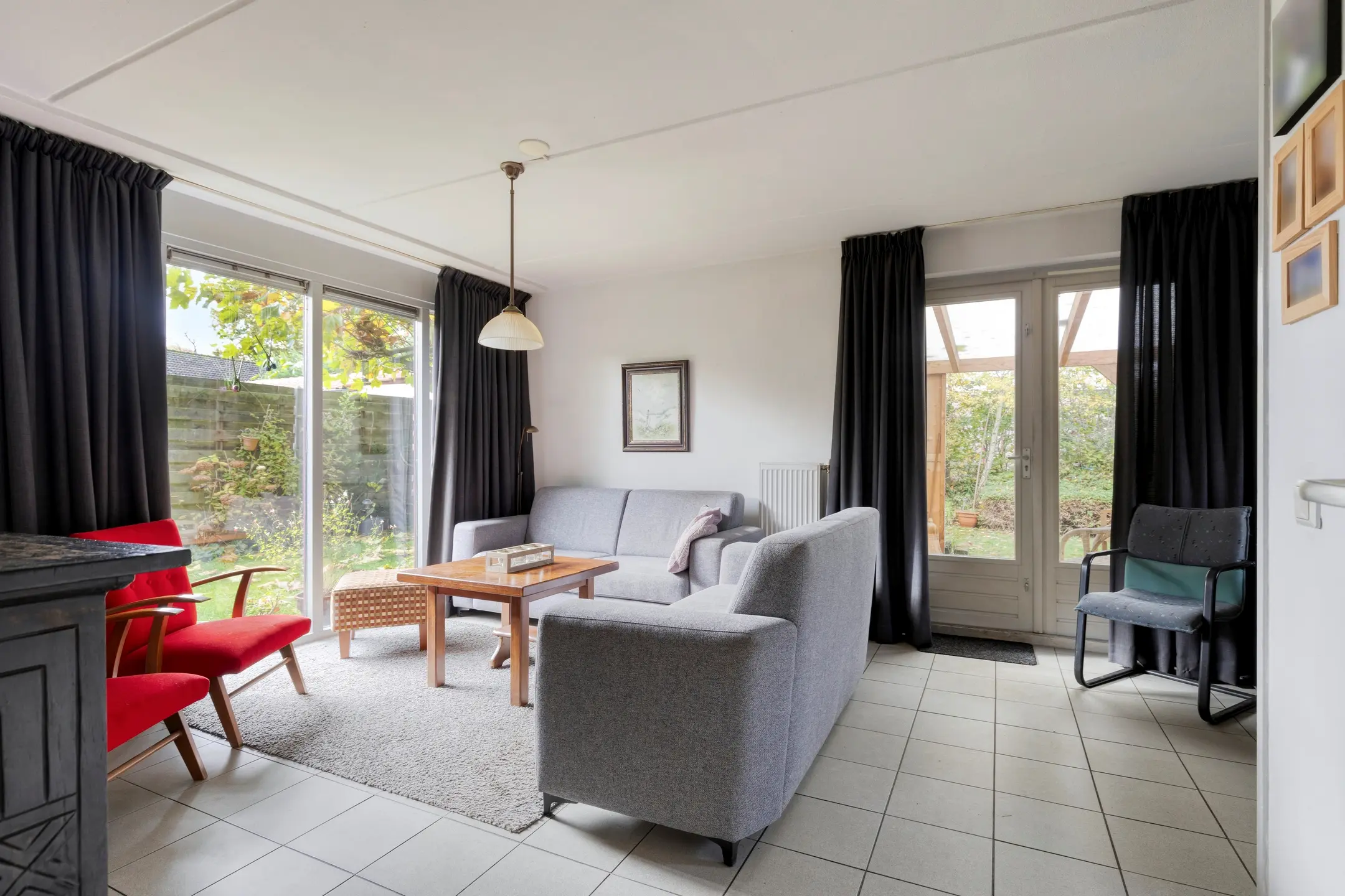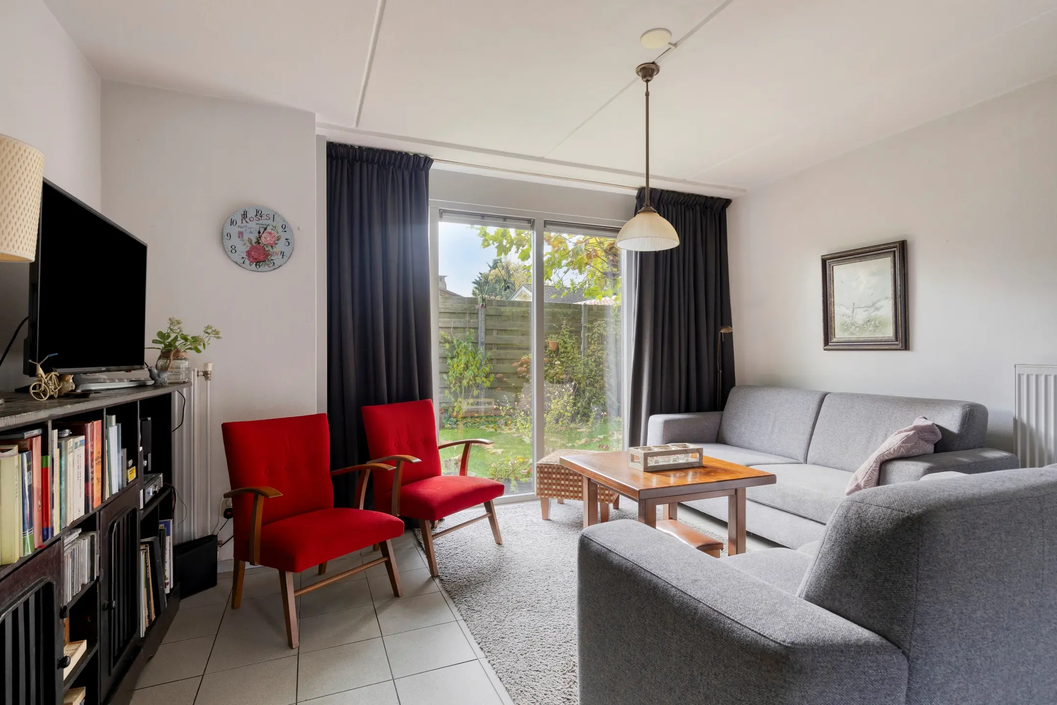 De woonkamer is bijzonder licht dankzij de vele raampartijen en de openslaande tuindeuren naar de tuin. Hierdoor geniet u van een heerlijke natuurlijke lichtinval en een mooi uitzicht op de tuin. De ruimte is afgewerkt met een nette tegelvloer en gestucte wanden.