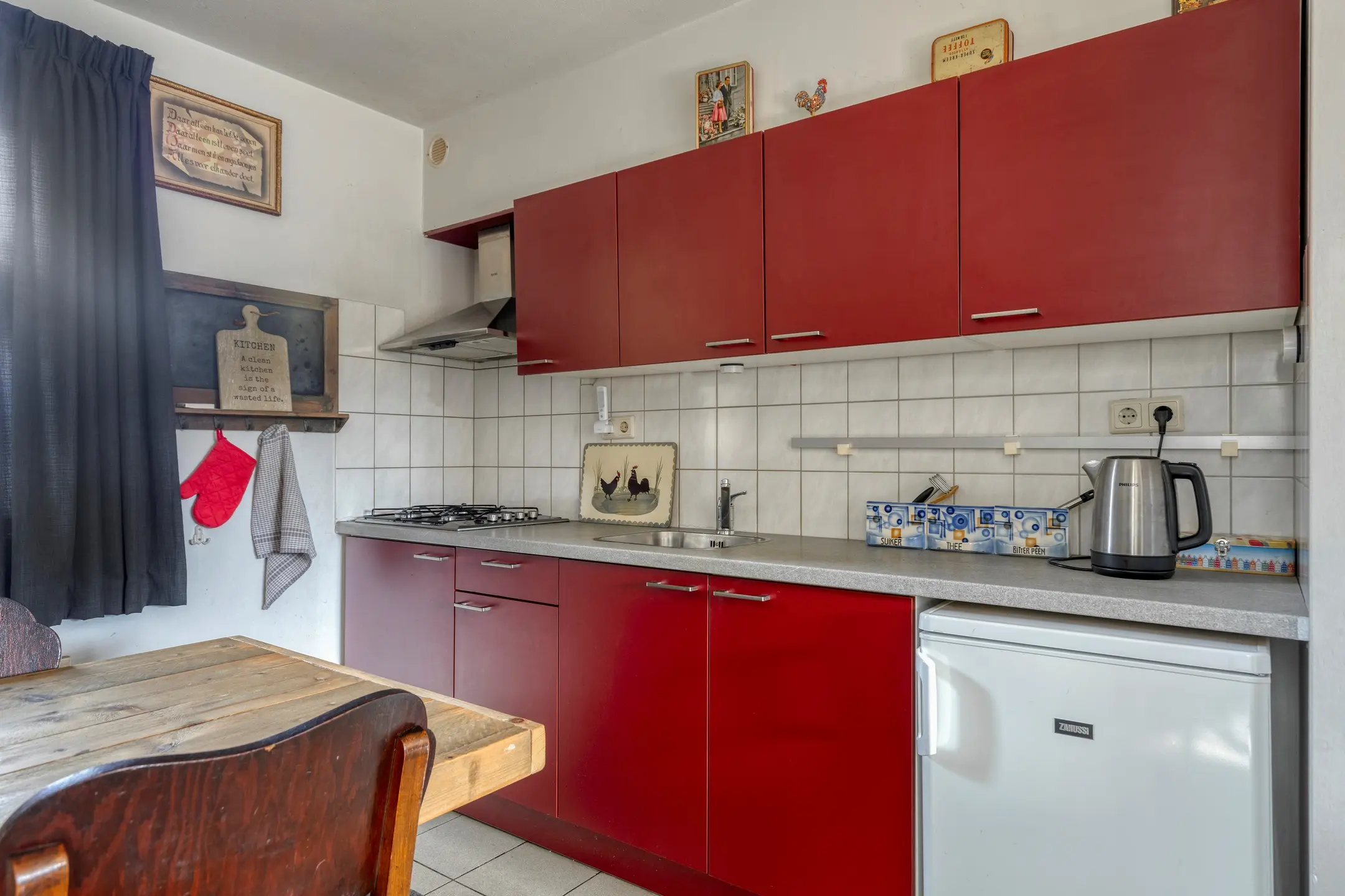 De open keuken heeft diverse boven- en onderkasten en is uitgerust met een 4-pits gaskookplaat, rvs afzuigkap, rvs spoelbak en een losse koelkast.