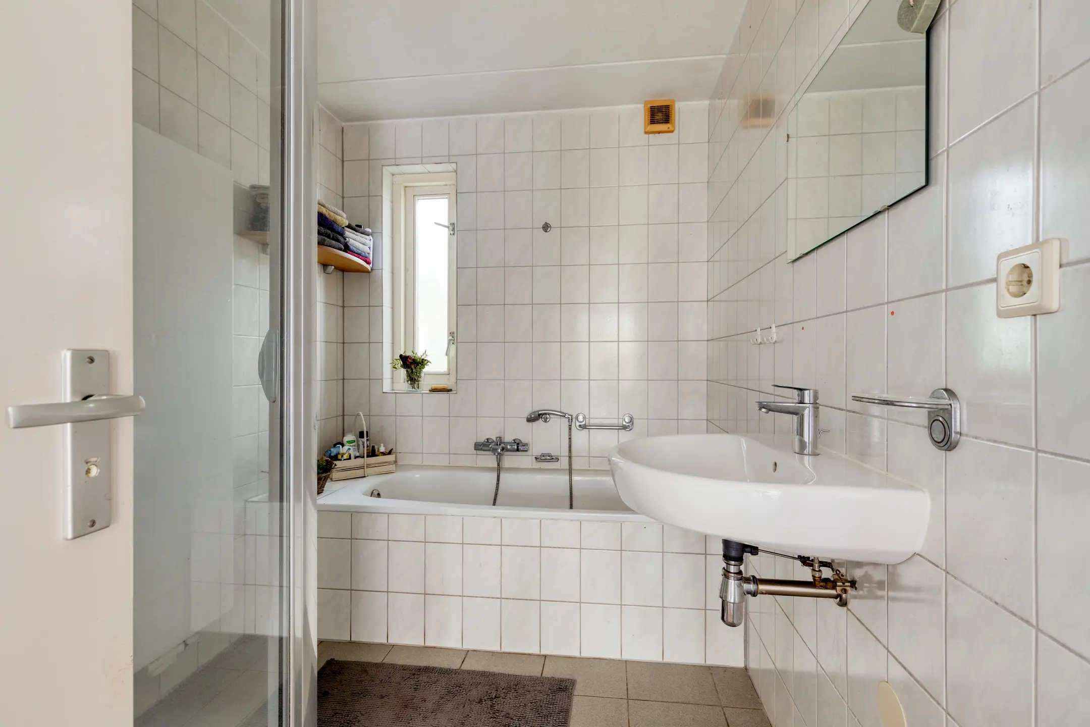 De nette badkamer is geheel betegeld en beschikt over een douchecabine, een ligbad en een wastafel.
