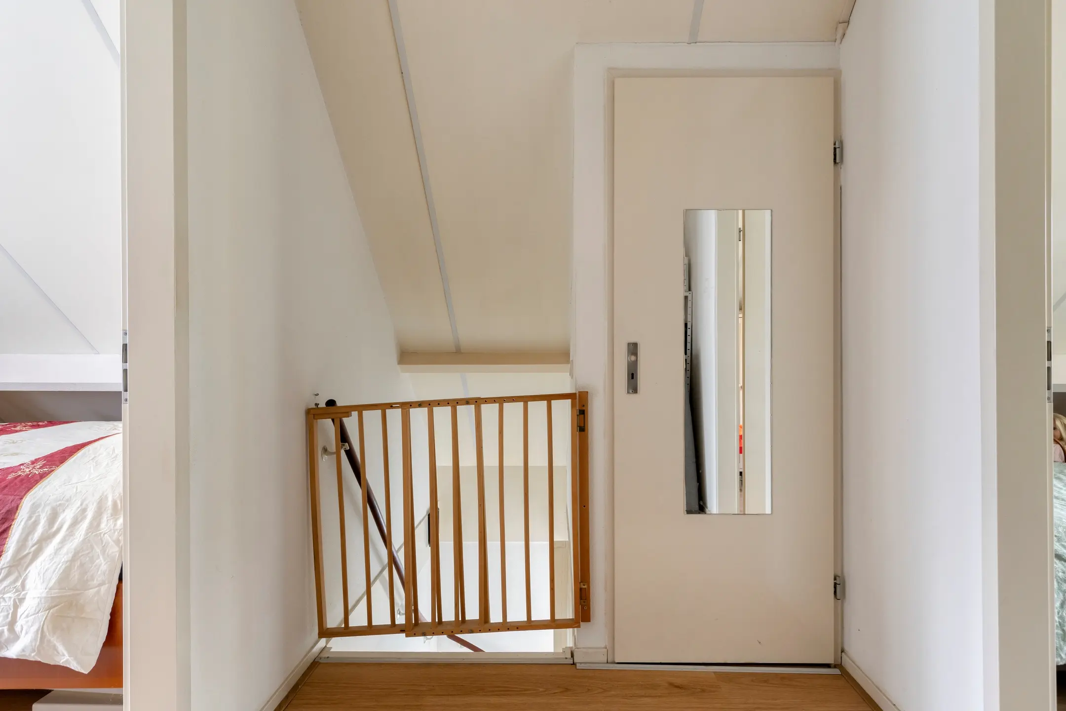 De trap in de ontvangsthal komt uit op de overloop van de 1e verdieping met 2 slaapkamers en een berging met de c.v. installatie.