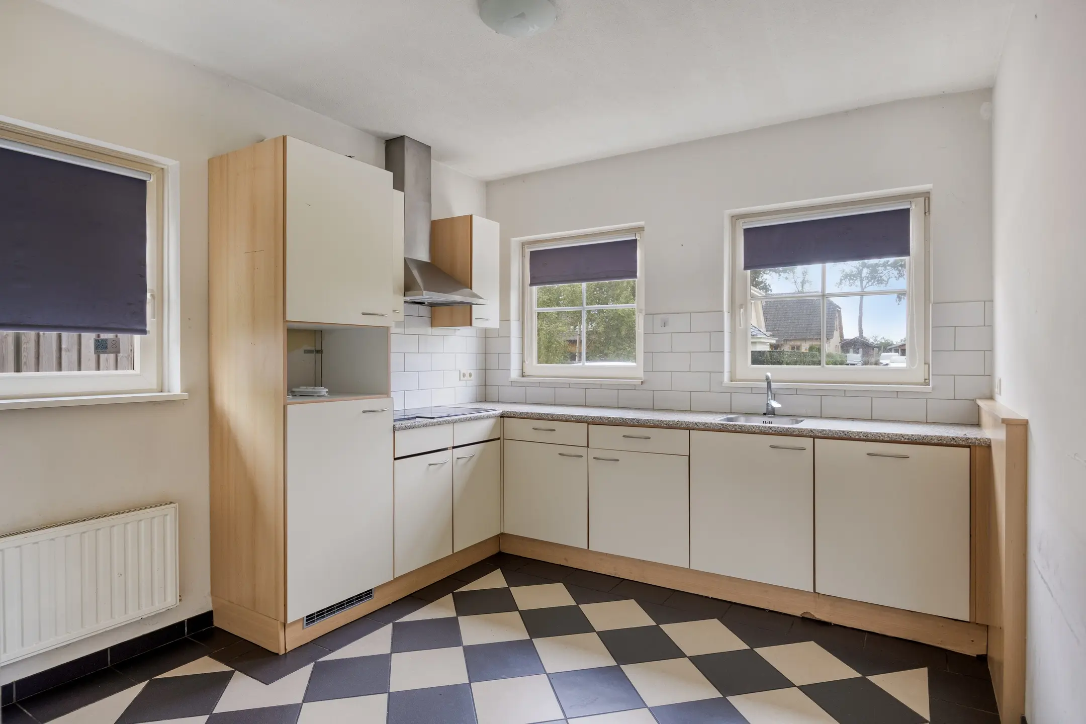 De keuken bevindt zich aan de voorzijde van de woning en is voorzien van een elektrische kookplaat, rvs-afzuigkap en koelkast. Dankzij de combinatie van lades en kasten is er volop bergruimte aanwezig.