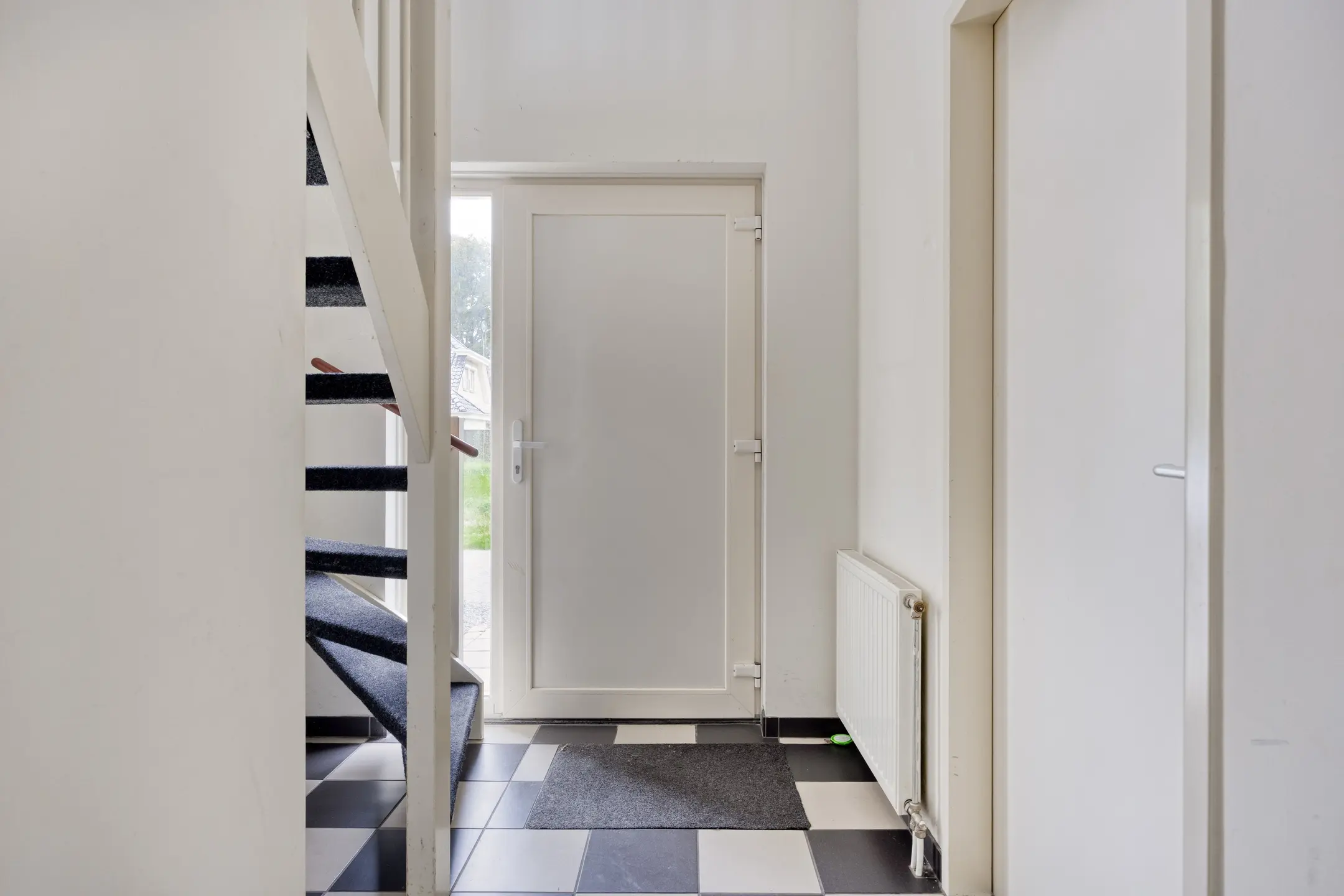 In de ruime ontvangsthal bevindt zich de trap naar de eerste verdieping. Vanuit de hal heeft u toegang tot de toiletruimte en de woonkamer.
