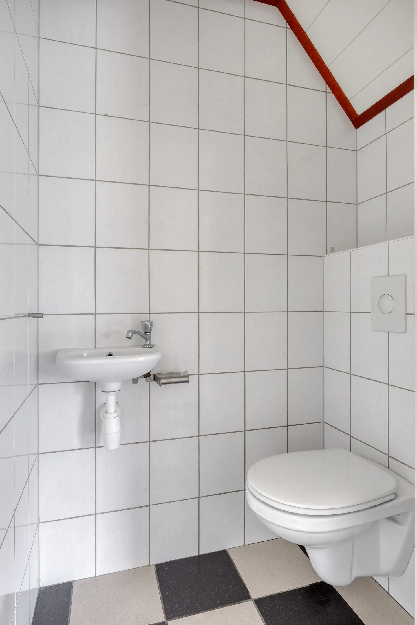 De toilet is geheel betegeld en voorzien van wandcloset en een fontein.