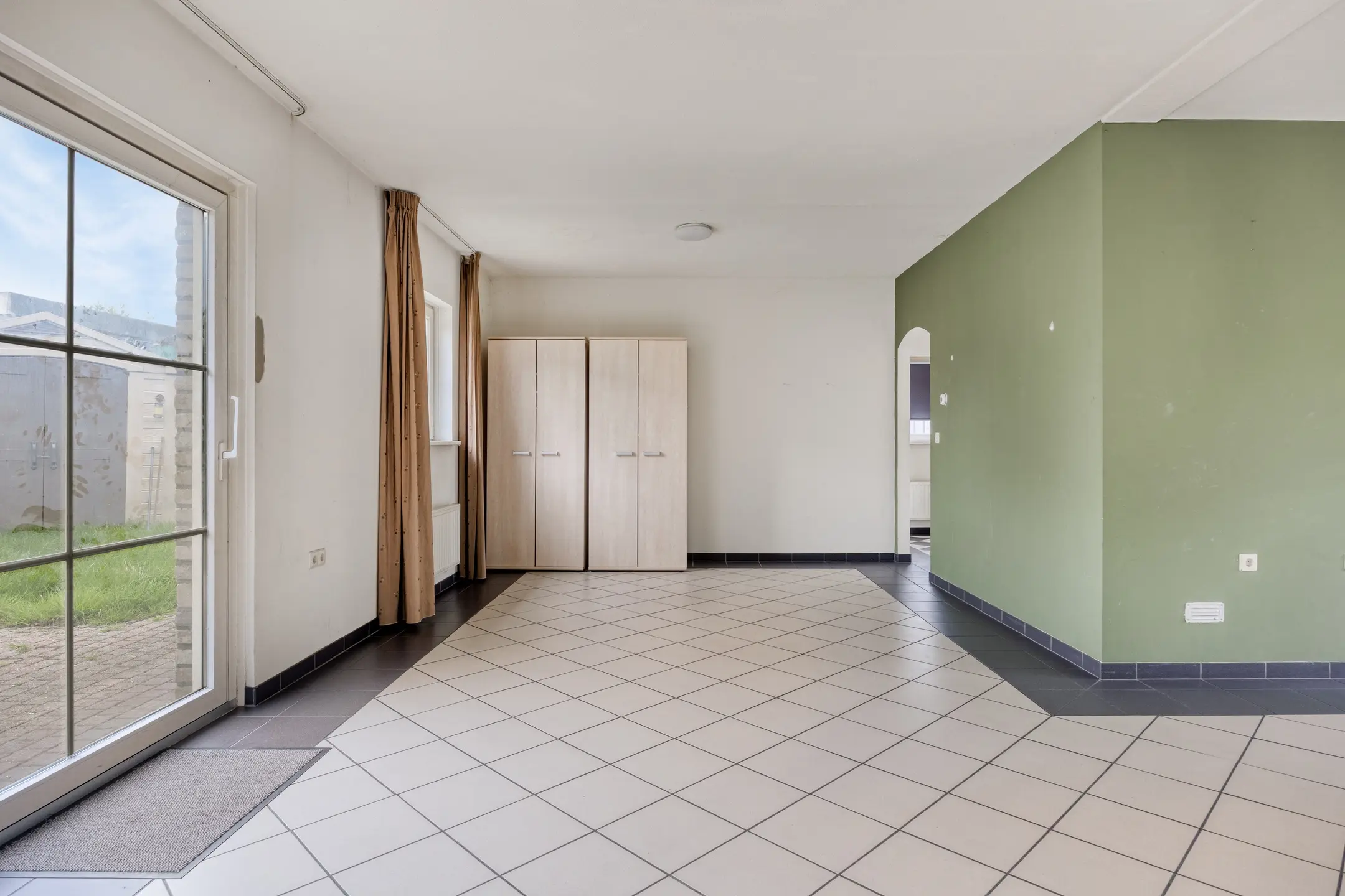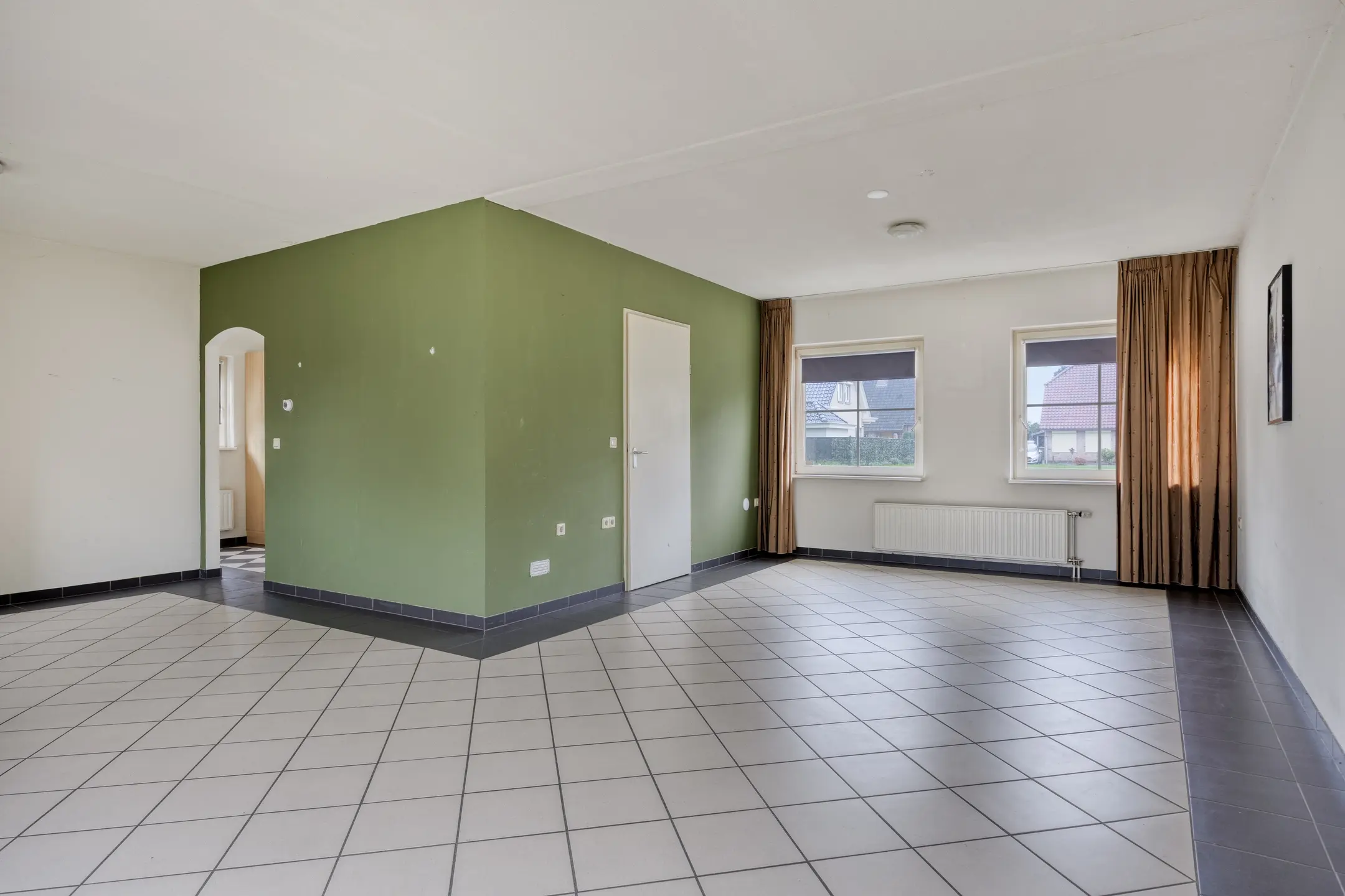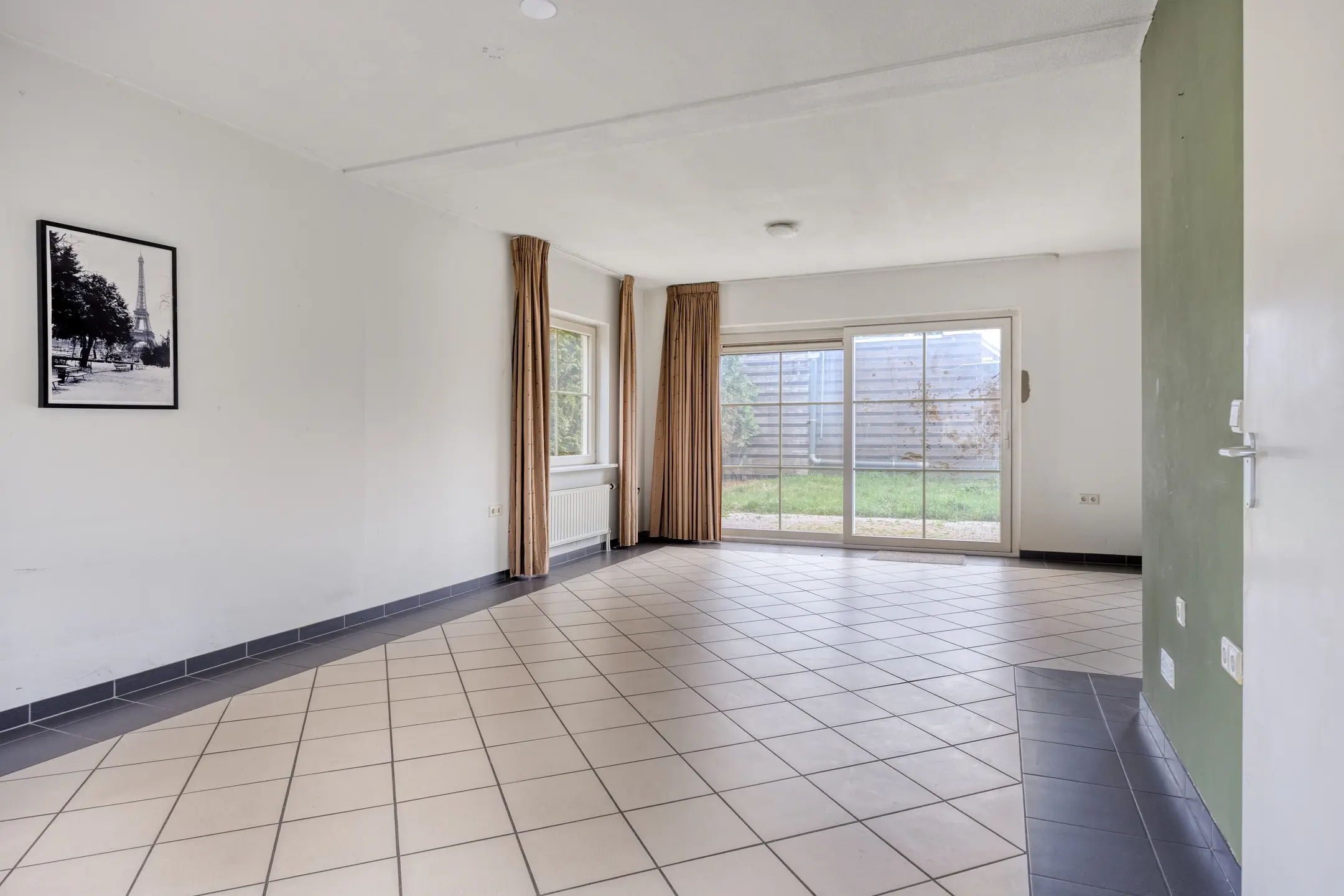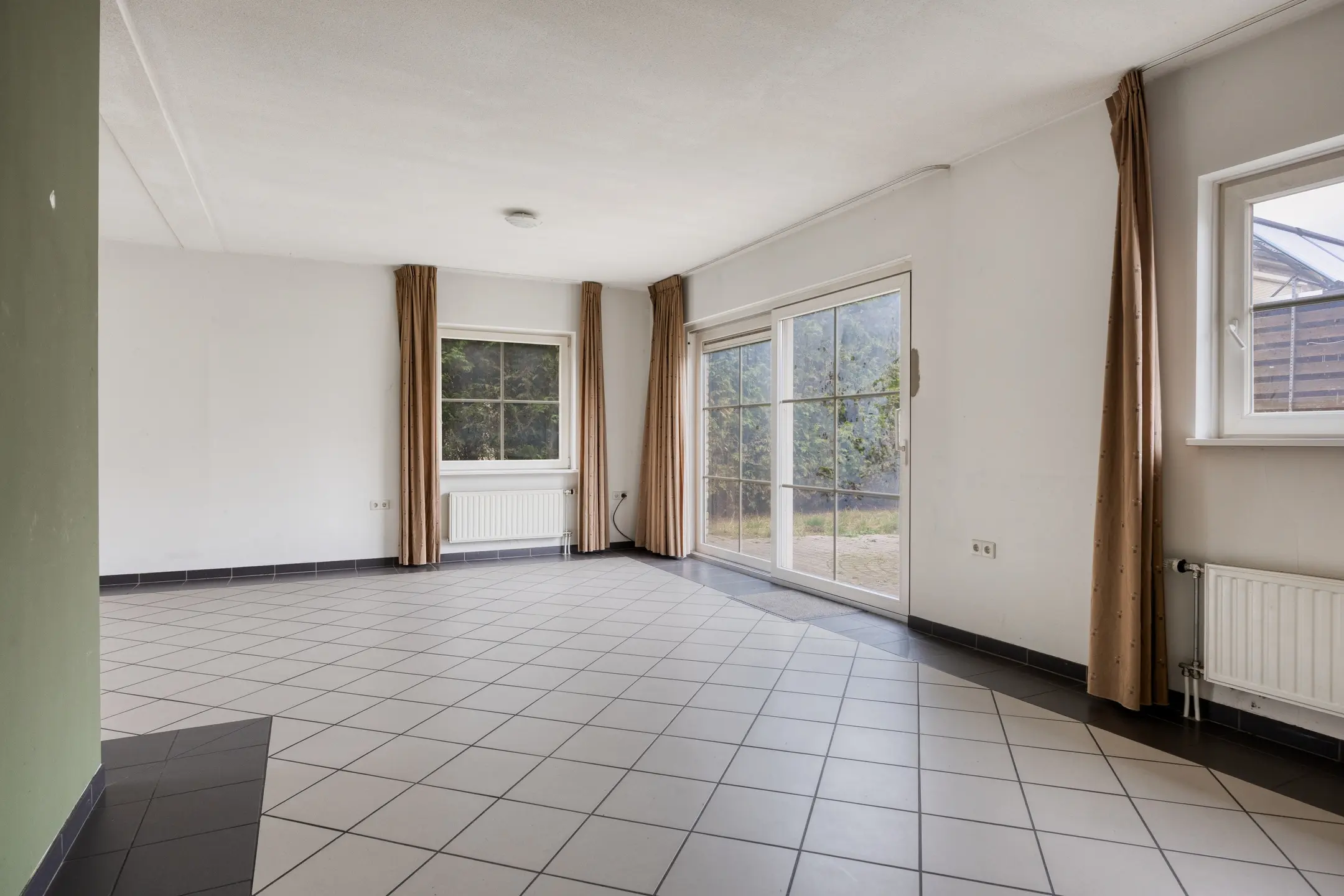 De woonkamer geniet van een fijne lichtinval door de vele ramen en de royale schuifpui. Via de schuifpui loopt u zo het terras en de tuin in. De vloer is voorzien van vloertegels en de wanden zijn gestuct.