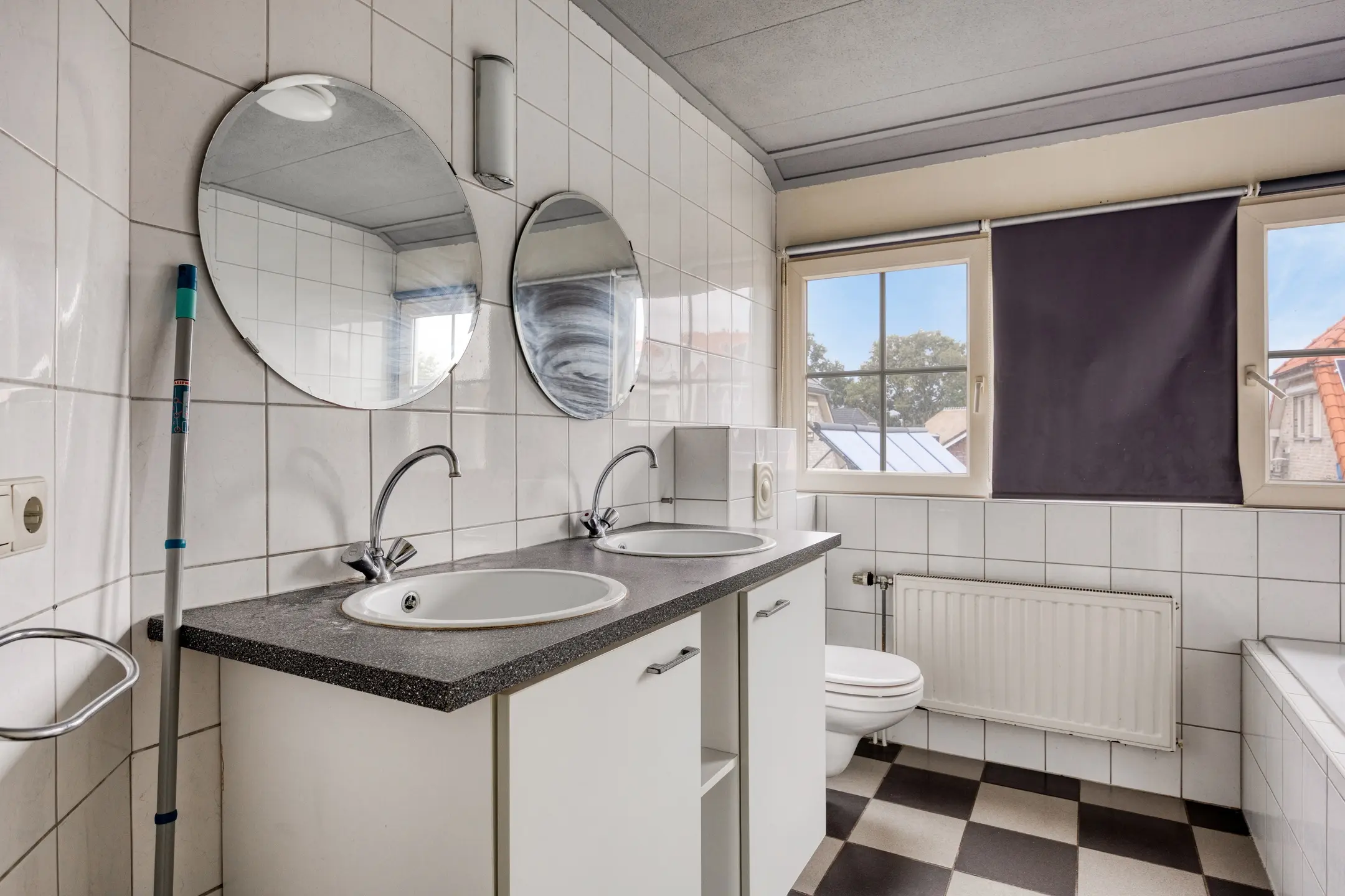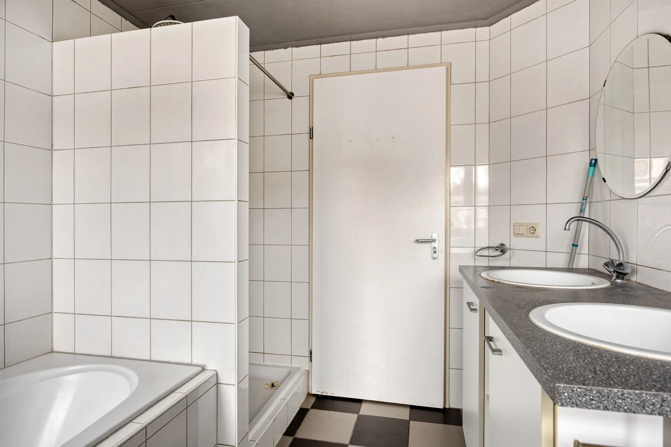 De badkamer is compleet ingericht met een ligbad, een douche, een dubbele wastafel en een wandcloset. De ruimte is volledig betegeld en beschikt over een raampartij, wat zorgt voor natuurlijke ventilatie en prettig daglicht.