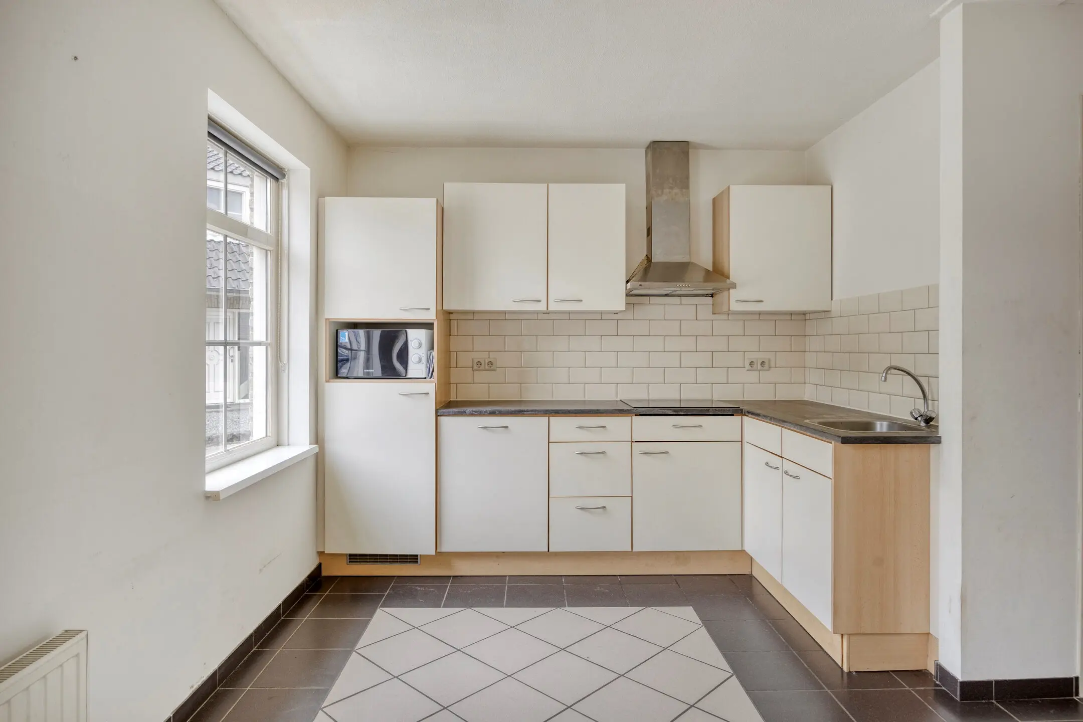 De keuken bevindt zich aan de voorzijde van de woning en is voorzien van een inductiekookplaat, rvs-afzuigkap, koelkast, vaatwasser en een losse magnetron. Dankzij de combinatie van lades en kasten is er volop bergruimte aanwezig.