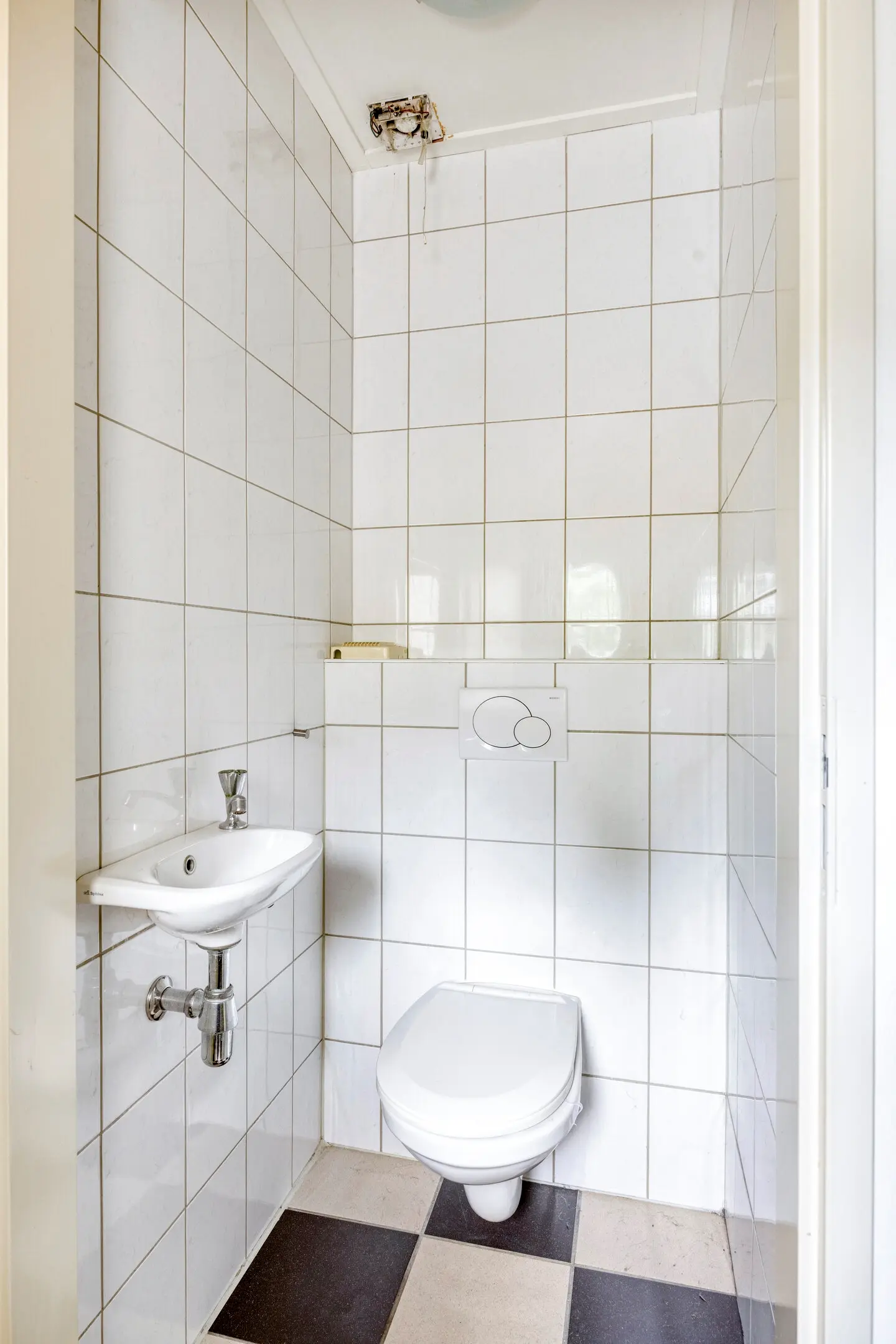 De toilet is geheel betegeld en voorzien van wandcloset en een fontein.