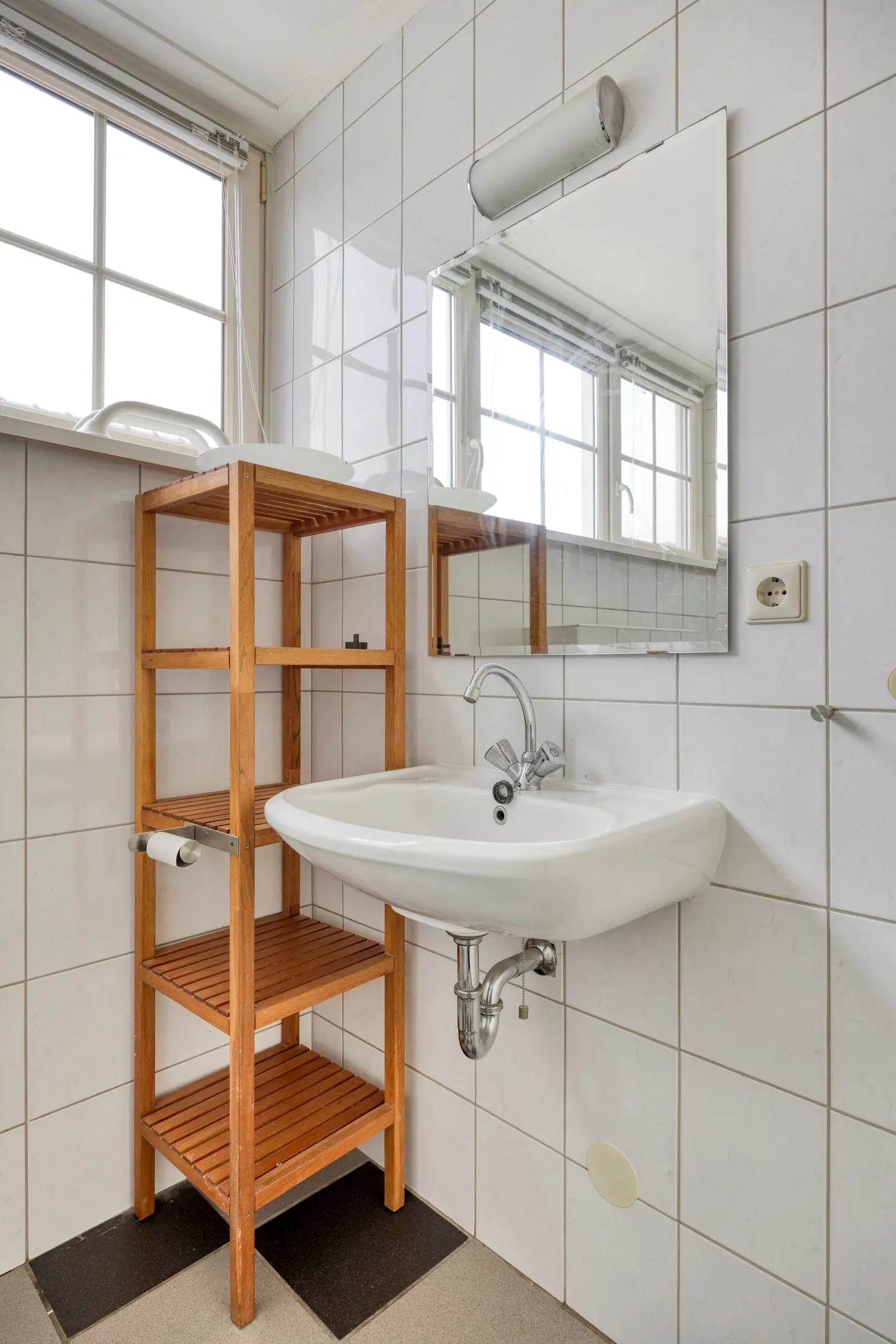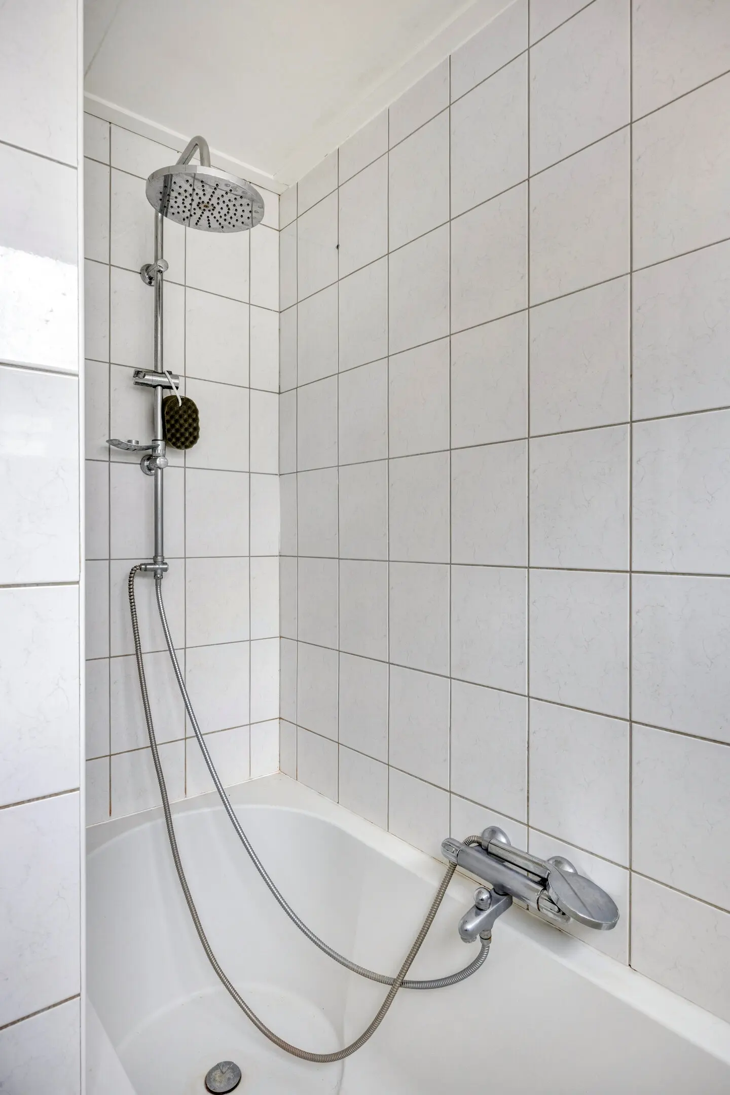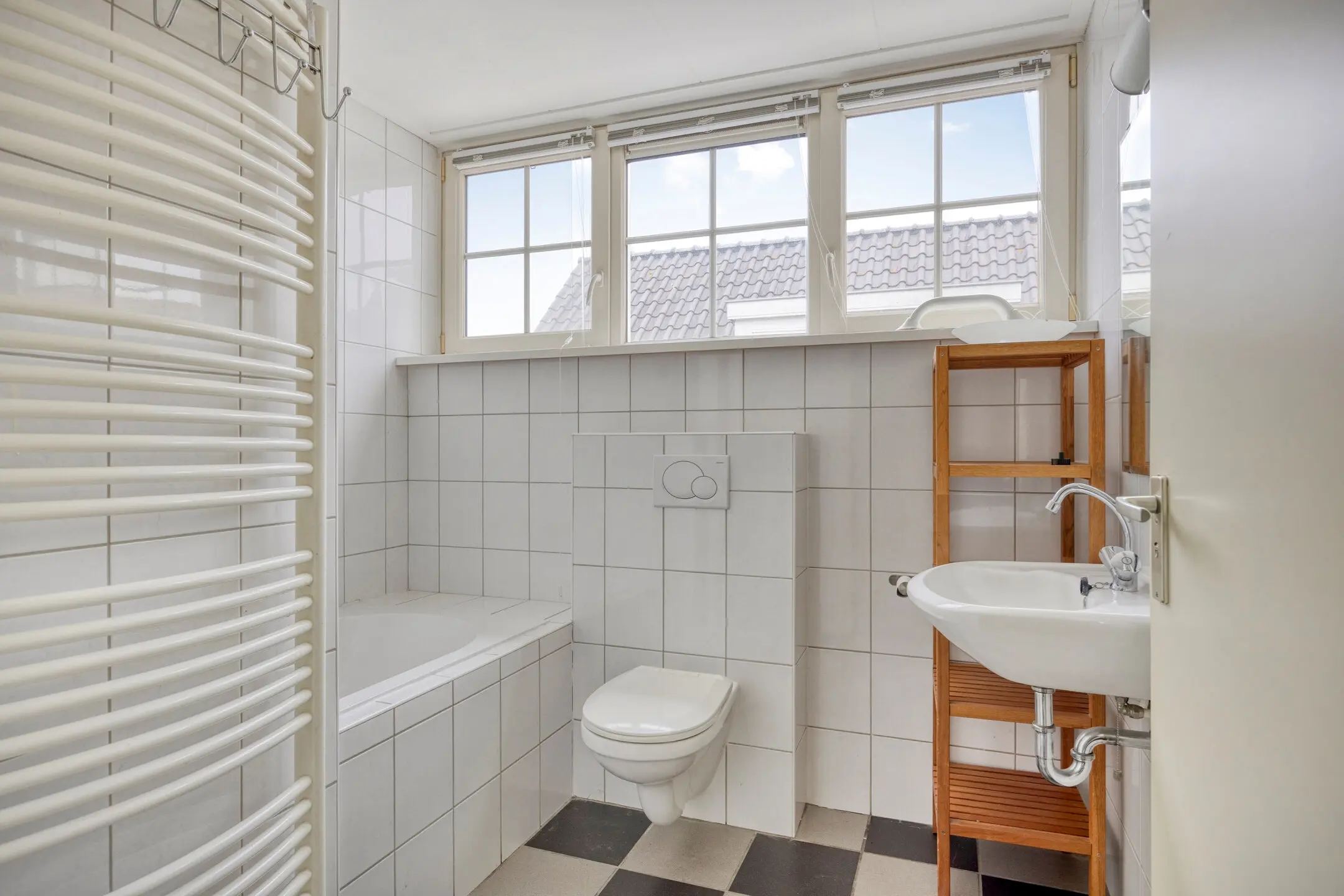 De badkamer is compleet ingericht met een ligbad met douche, een wastafel en een wandcloset. De ruimte is volledig betegeld en beschikt over een raampartij, wat zorgt voor natuurlijke ventilatie en prettig daglicht.