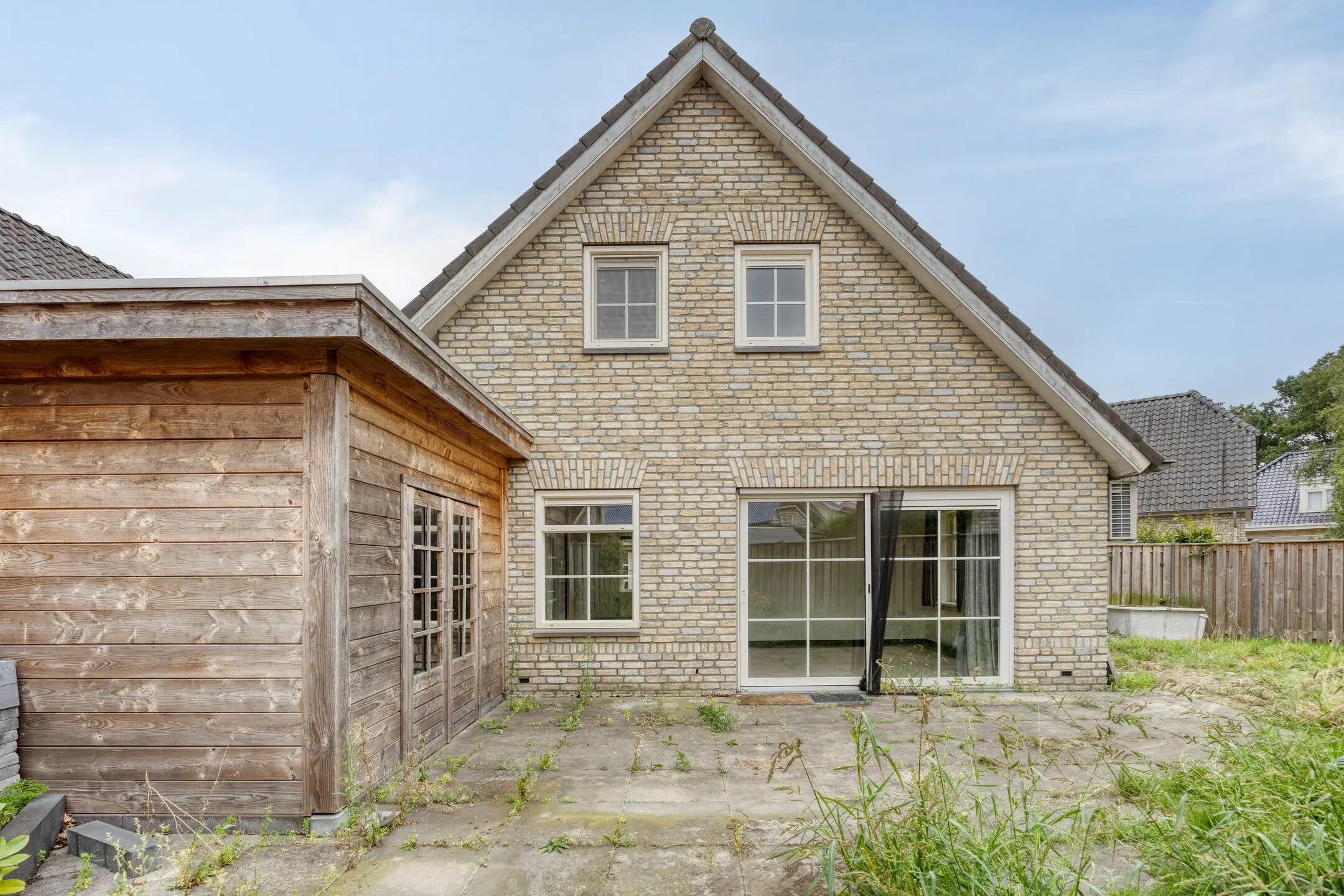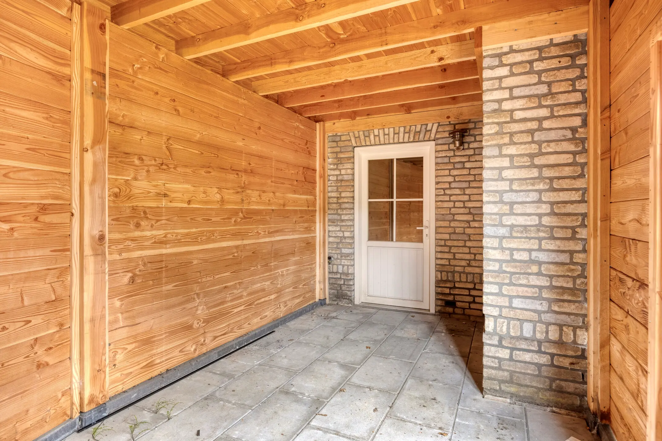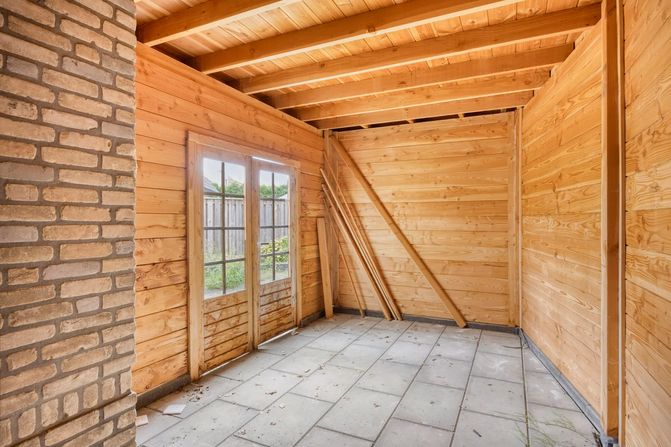 De aangebouwde houten berging biedt praktische opbergruimte, bijvoorbeeld voor tuinspullen.