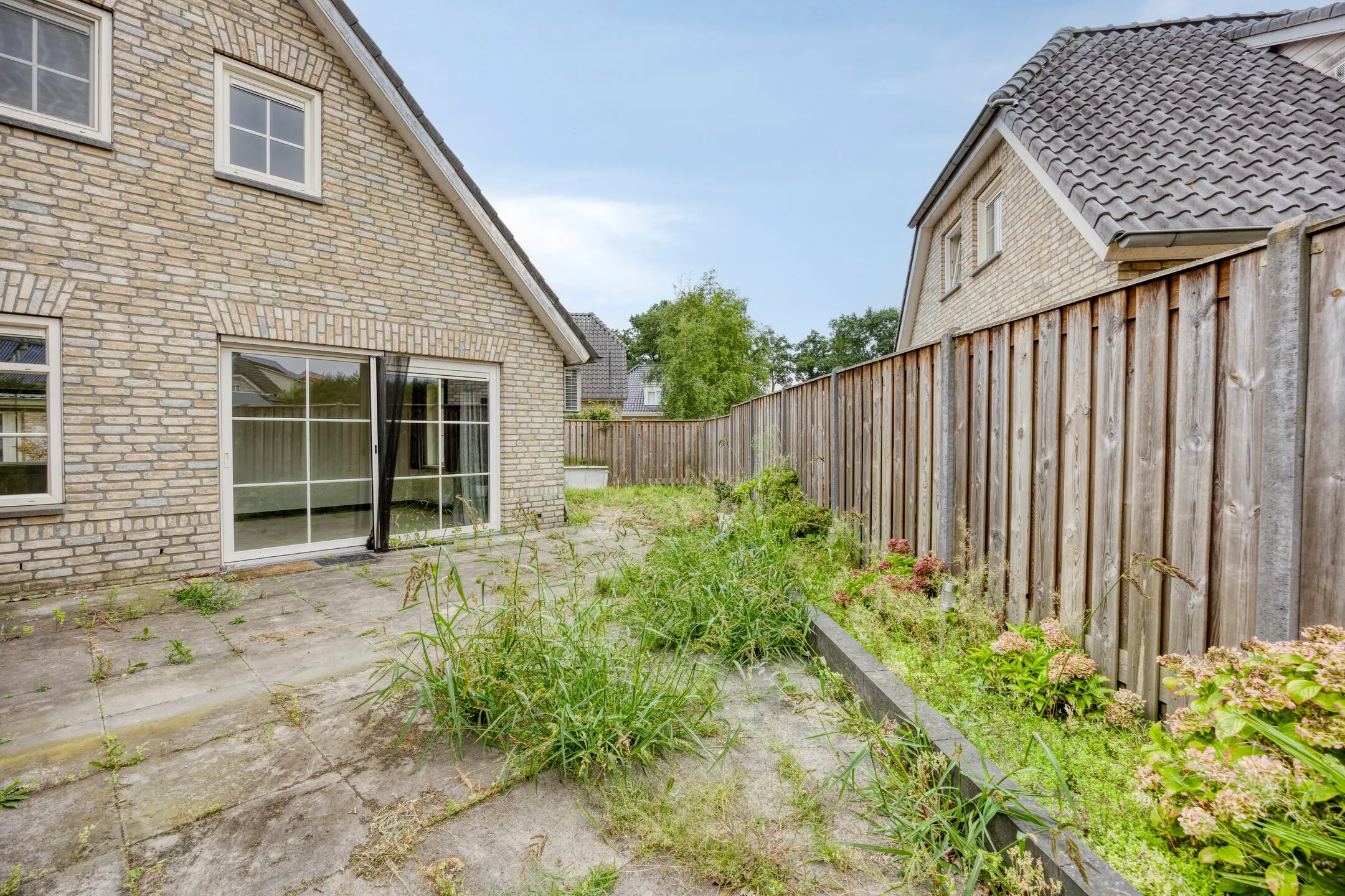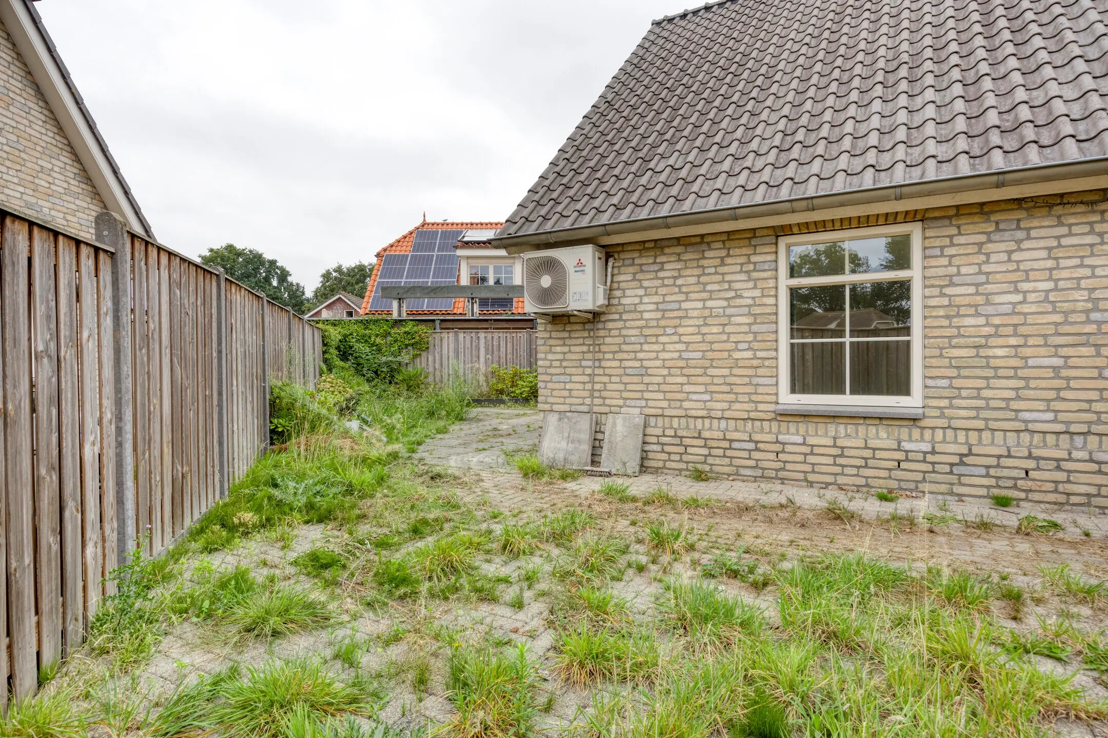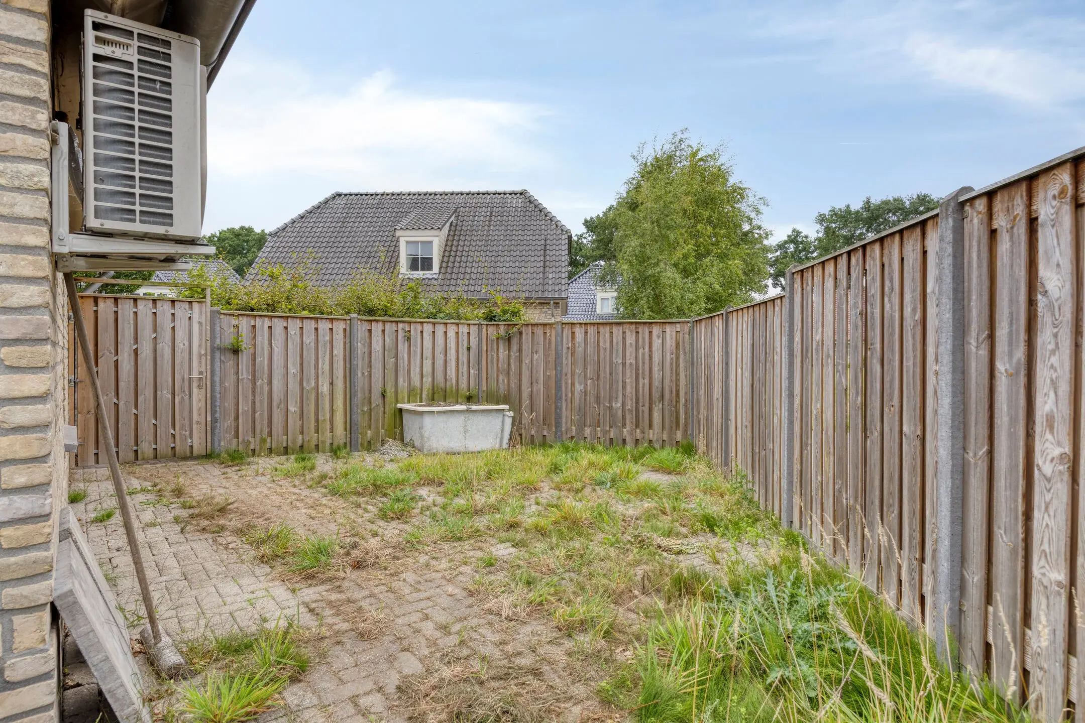 Deze geschakelde woning staat op een perceel van circa 281 m² en beschikt over een lichte woonkamer met schuifpui naar de tuin, een open keuken, een bijkeuken, twee slaapkamers en een verzorgde badkamer.