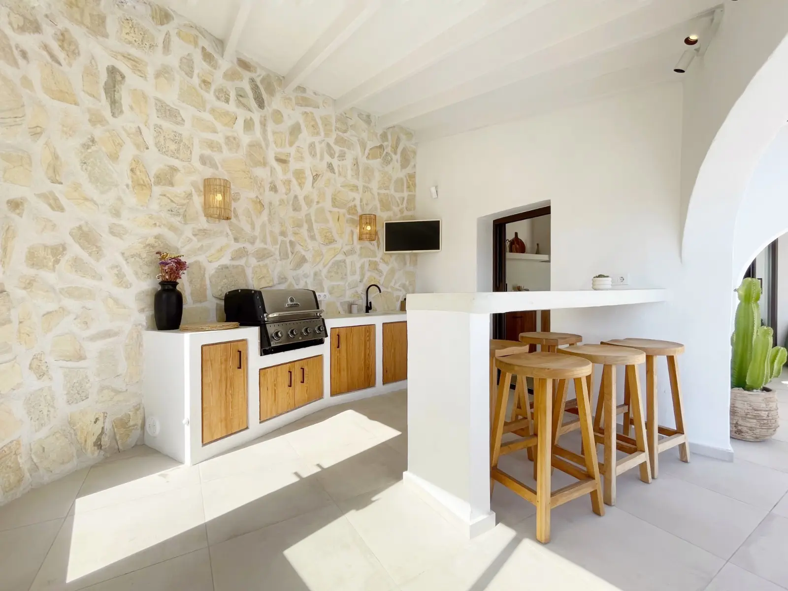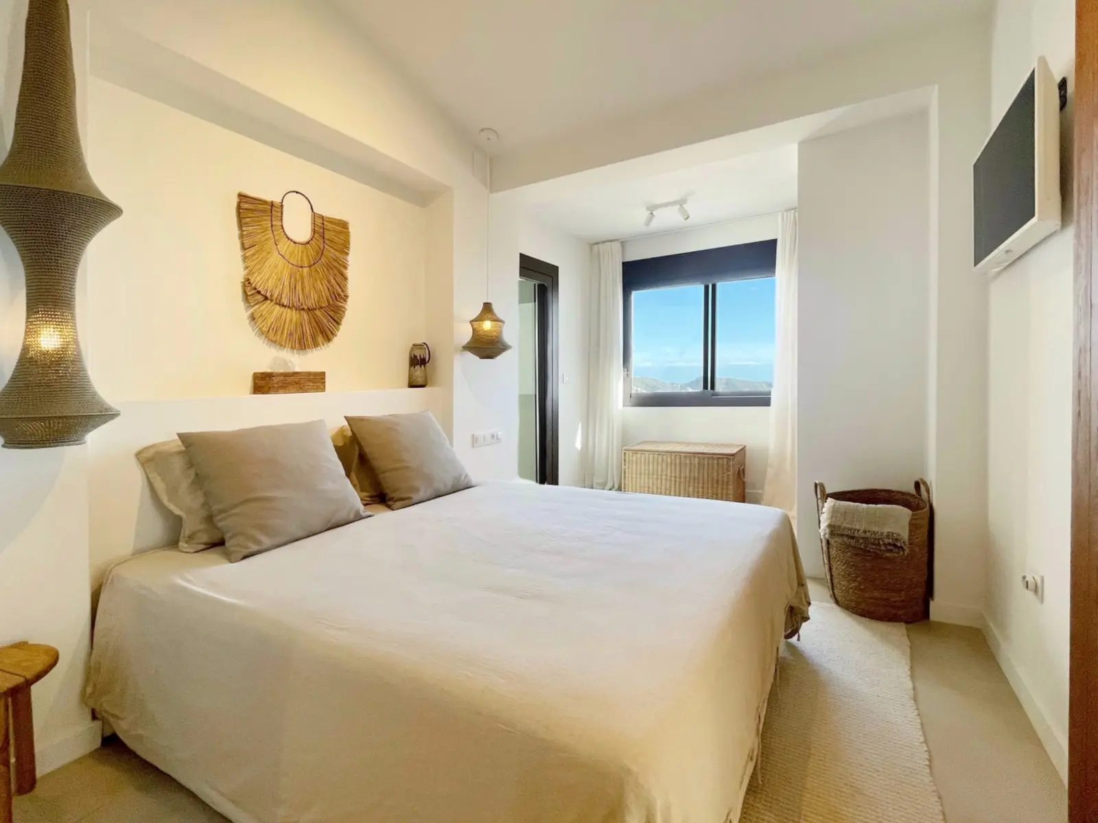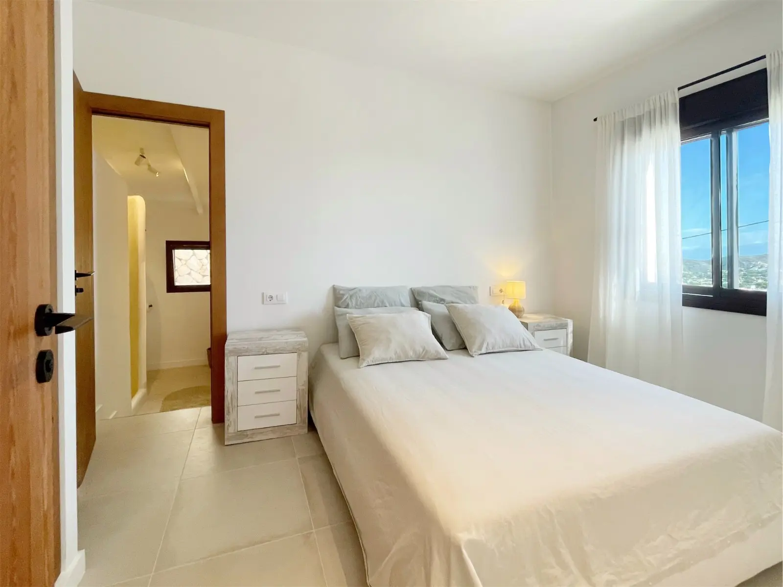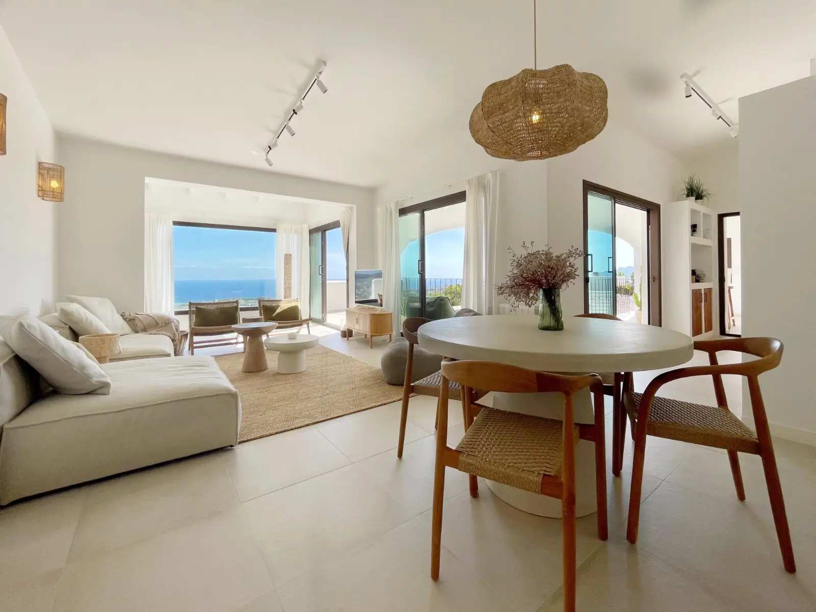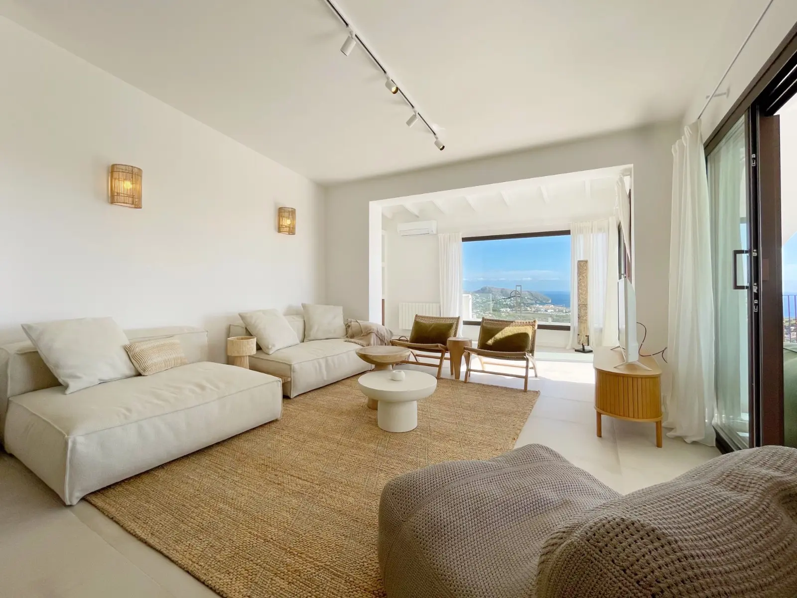 De villa beschikt over ruime, lichte leefruimtes met grote raampartijen die het adembenemende uitzicht maximaal tot zijn recht laten komen. De open leefruimte sluit aan op een moderne Ibiza-stijl keuken, volledig uitgerust met inbouwapparatuur en directe toegang tot een buitenkeuken met BBQ. Op hetzelfde niveau bevindt zich de hoofdslaapkamer met ensuite badkamer en privéterras. Op de benedenverdieping , te bereiken via een interne trap, zijn twee extra slaapkamers met elk een eigen badkamer, ingebouwde kasten met ledverlichting, airconditioning, elektrische rolluiken, vliegenhorren en zeezicht. Verder zijn er een wasruimte, technische ruimte en bergruimte aanwezig. De villa beschikt over meerdere terrassen, deels overdekt, een niervormig zwembad met buitendouche en diverse loungehoeken. De mediterrane tuin met sfeervolle verlichting creëert een aangename sfeer, zowel overdag als ’s avonds.