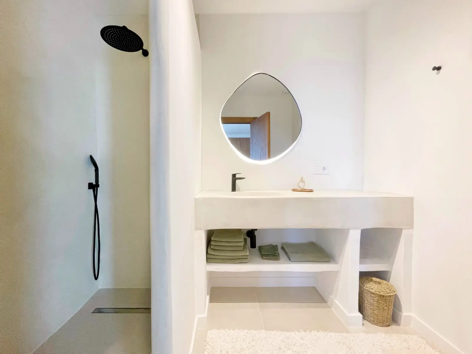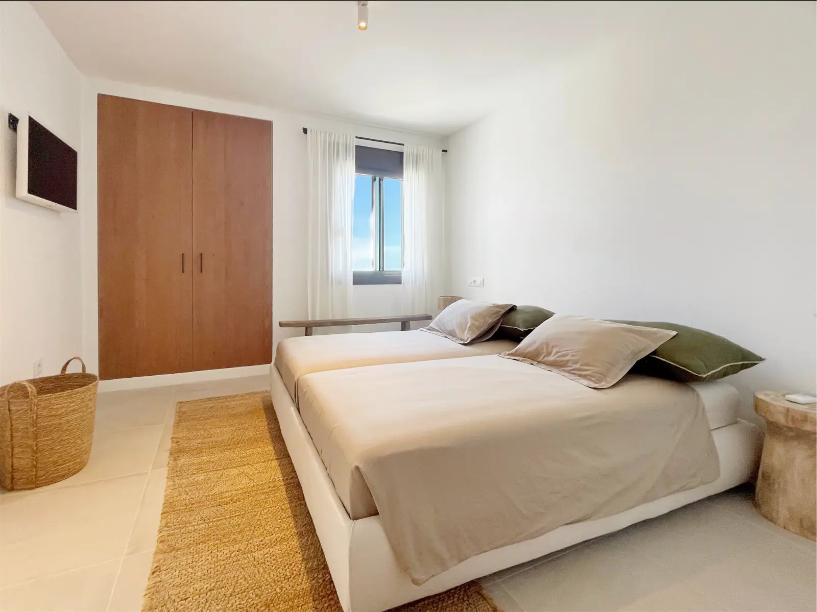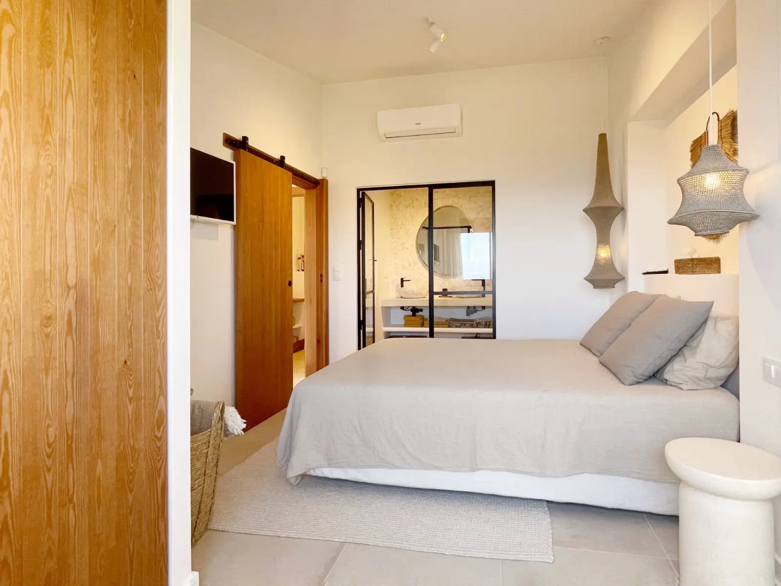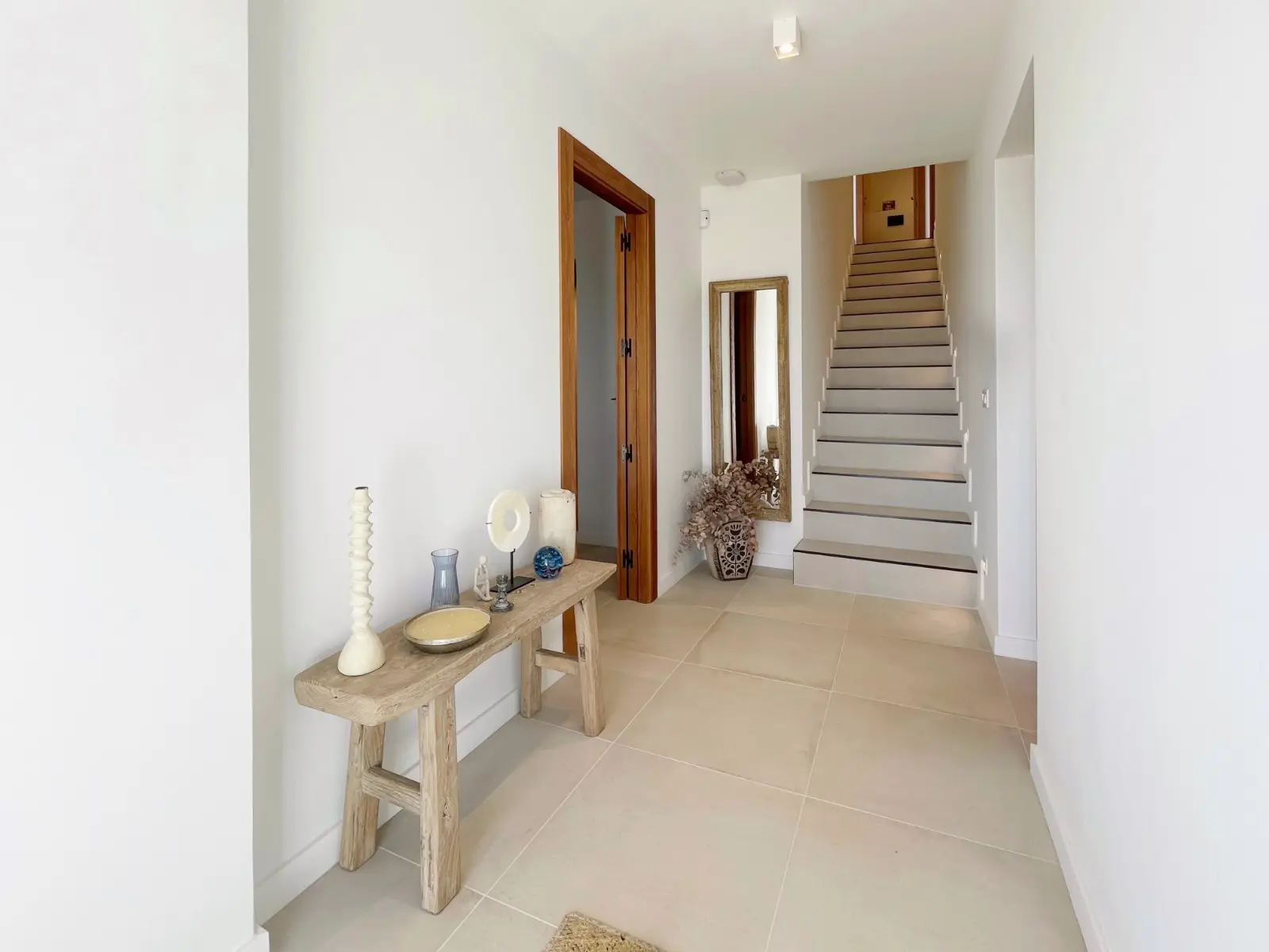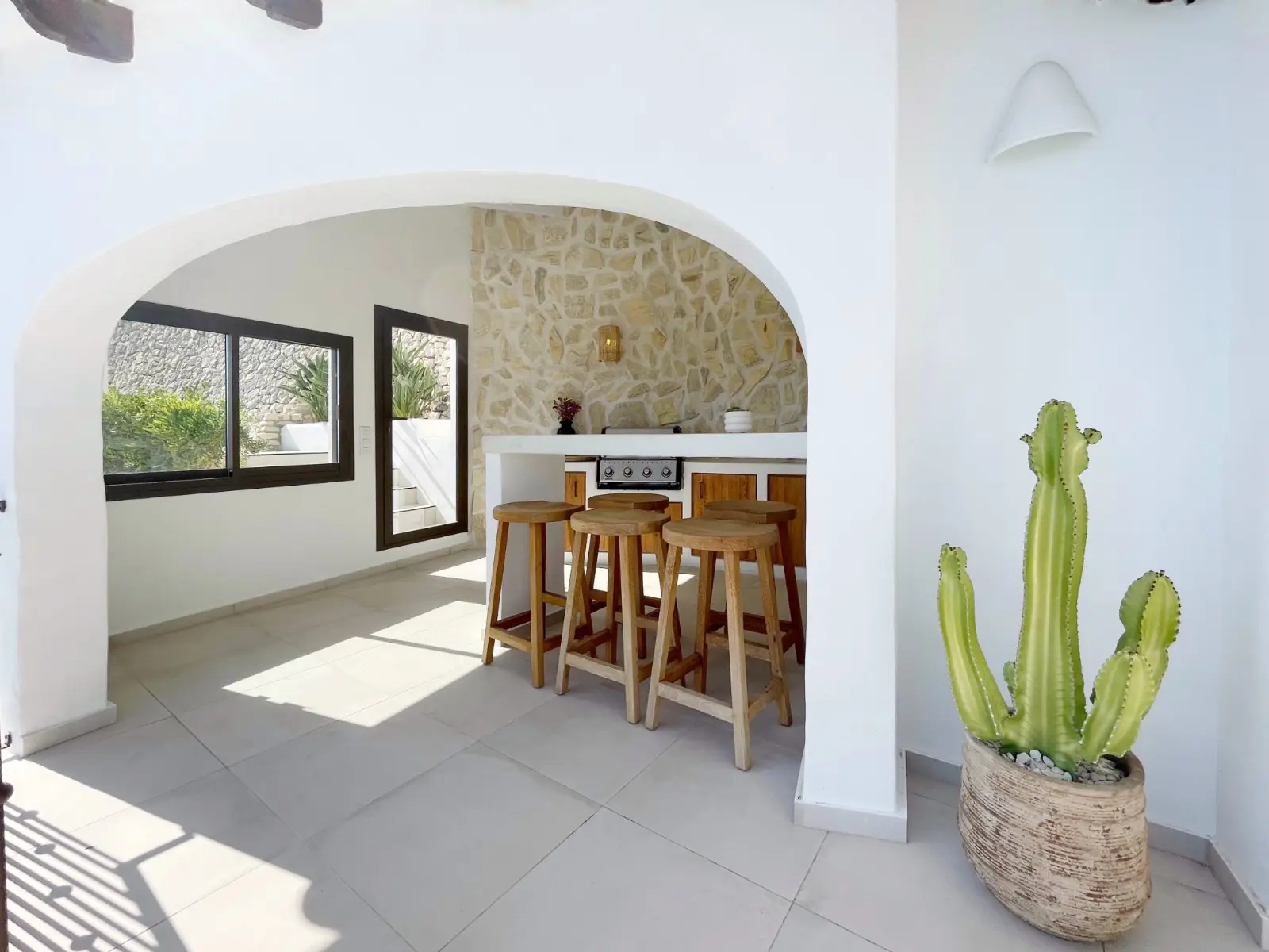 De villa beschikt over ruime, lichte leefruimtes met grote raampartijen die het adembenemende uitzicht maximaal tot zijn recht laten komen. De open leefruimte sluit aan op een moderne Ibiza-stijl keuken, volledig uitgerust met inbouwapparatuur en directe toegang tot een buitenkeuken met BBQ. Op hetzelfde niveau bevindt zich de hoofdslaapkamer met ensuite badkamer en privéterras. Op de benedenverdieping , te bereiken via een interne trap, zijn twee extra slaapkamers met elk een eigen badkamer, ingebouwde kasten met ledverlichting, airconditioning, elektrische rolluiken, vliegenhorren en zeezicht. Verder zijn er een wasruimte, technische ruimte en bergruimte aanwezig. De villa beschikt over meerdere terrassen, deels overdekt, een niervormig zwembad met buitendouche en diverse loungehoeken. De mediterrane tuin met sfeervolle verlichting creëert een aangename sfeer, zowel overdag als ’s avonds.