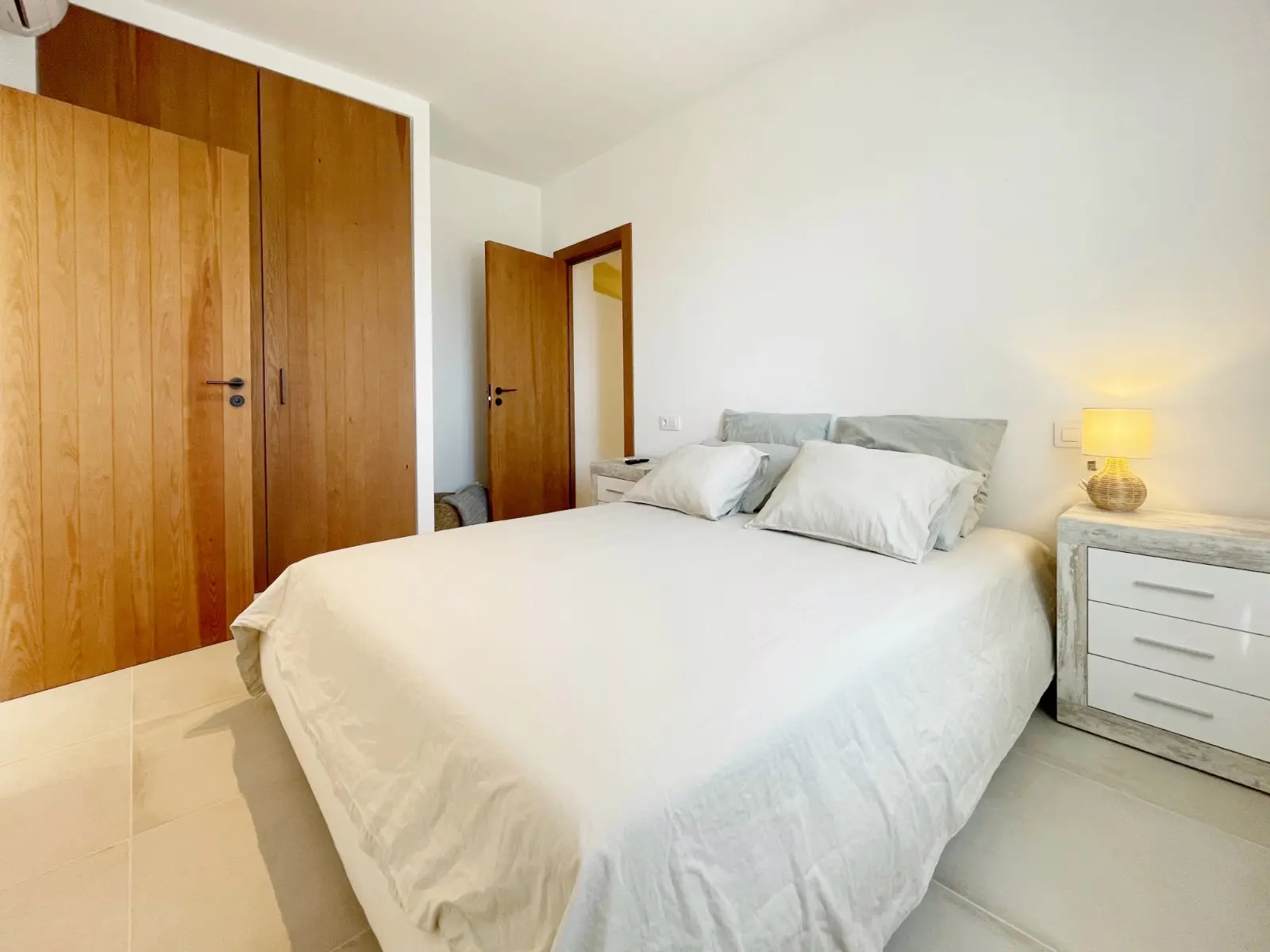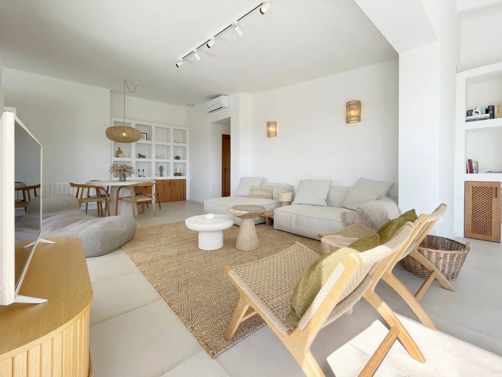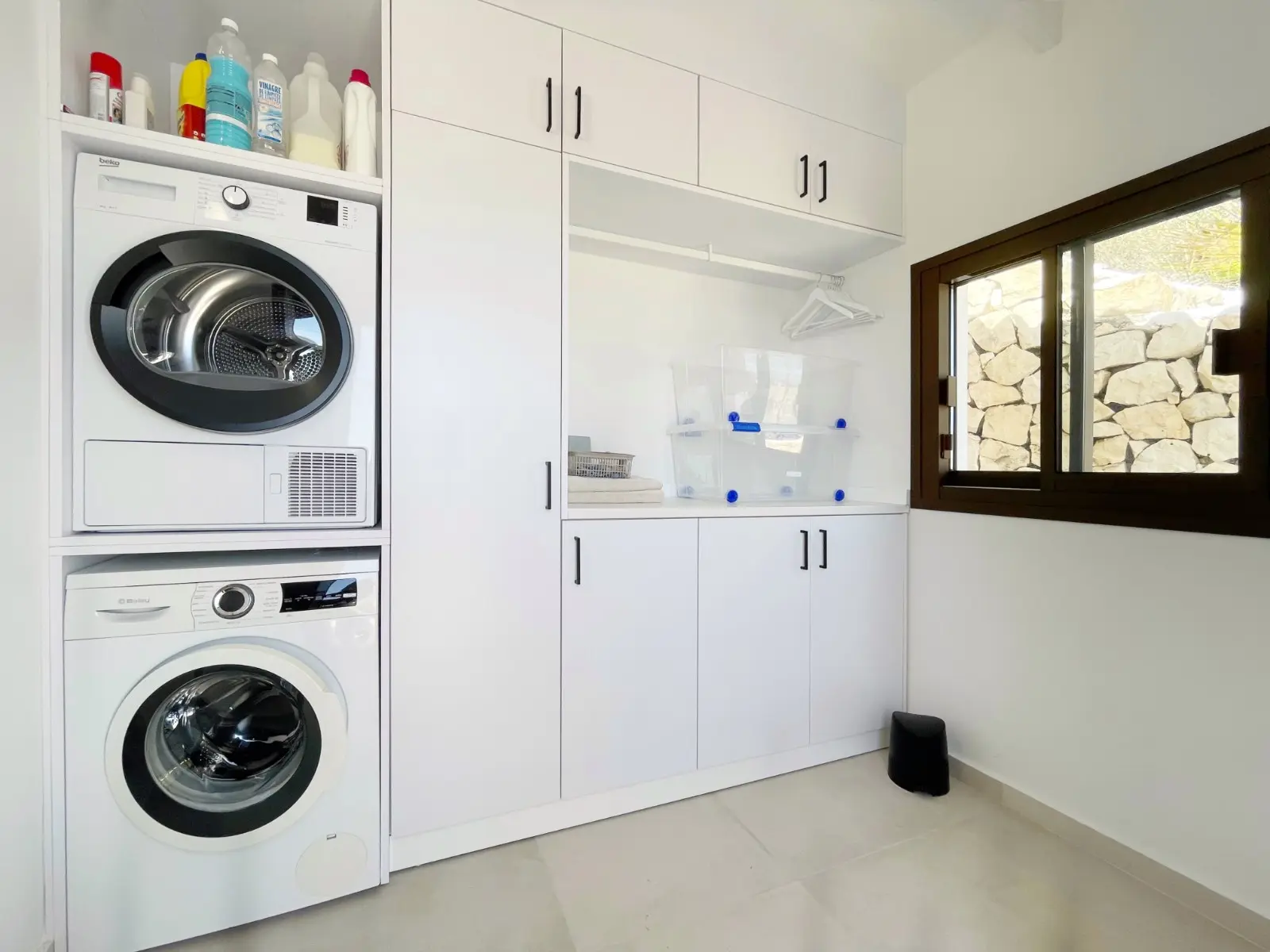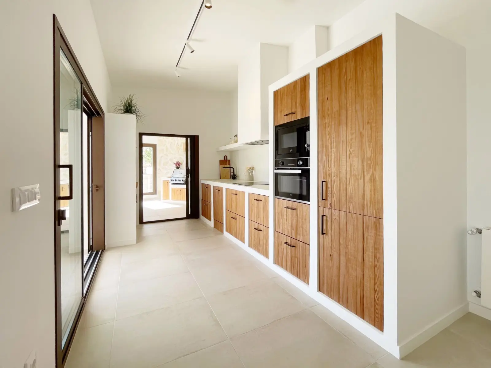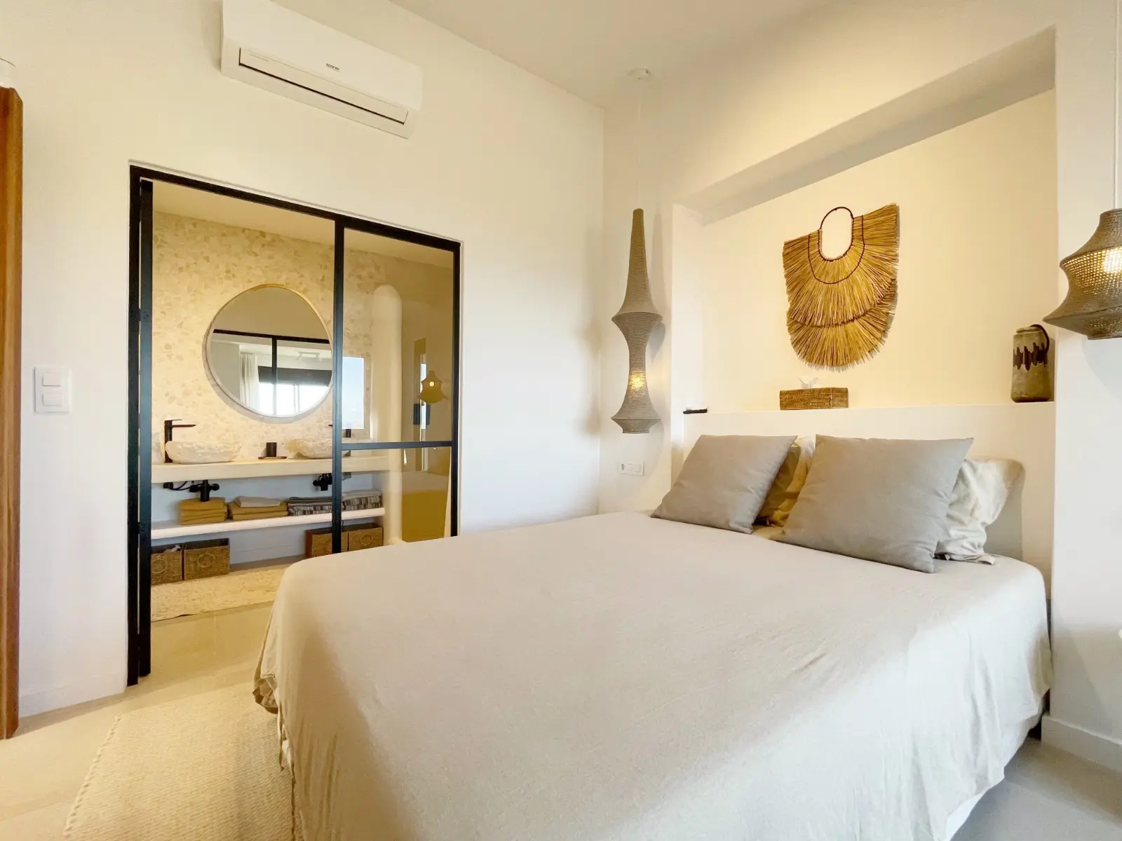 De villa beschikt over ruime, lichte leefruimtes met grote raampartijen die het adembenemende uitzicht maximaal tot zijn recht laten komen. De open leefruimte sluit aan op een moderne Ibiza-stijl keuken, volledig uitgerust met inbouwapparatuur en directe toegang tot een buitenkeuken met BBQ. Op hetzelfde niveau bevindt zich de hoofdslaapkamer met ensuite badkamer en privéterras. Op de benedenverdieping , te bereiken via een interne trap, zijn twee extra slaapkamers met elk een eigen badkamer, ingebouwde kasten met ledverlichting, airconditioning, elektrische rolluiken, vliegenhorren en zeezicht. Verder zijn er een wasruimte, technische ruimte en bergruimte aanwezig. De villa beschikt over meerdere terrassen, deels overdekt, een niervormig zwembad met buitendouche en diverse loungehoeken. De mediterrane tuin met sfeervolle verlichting creëert een aangename sfeer, zowel overdag als ’s avonds.