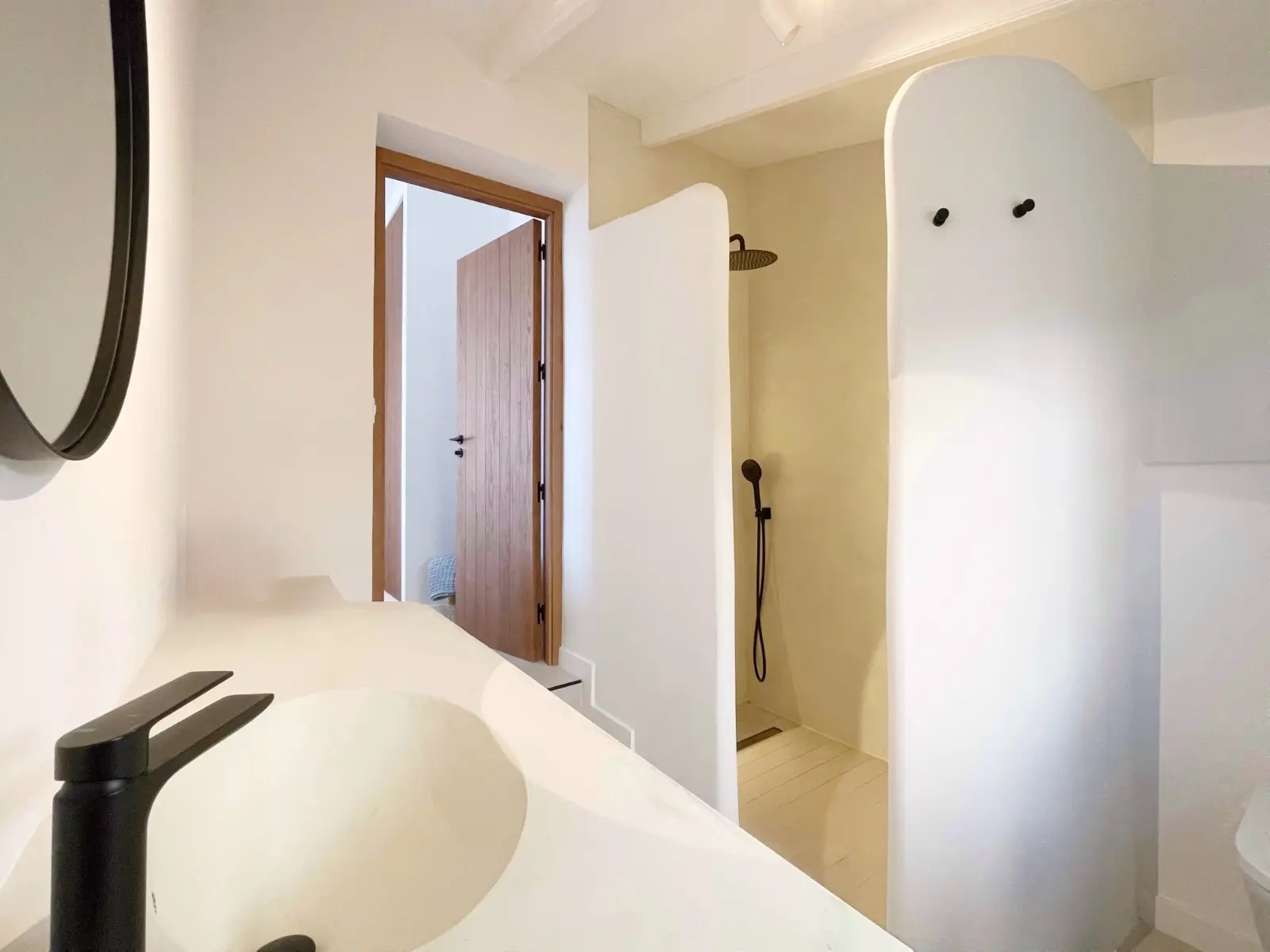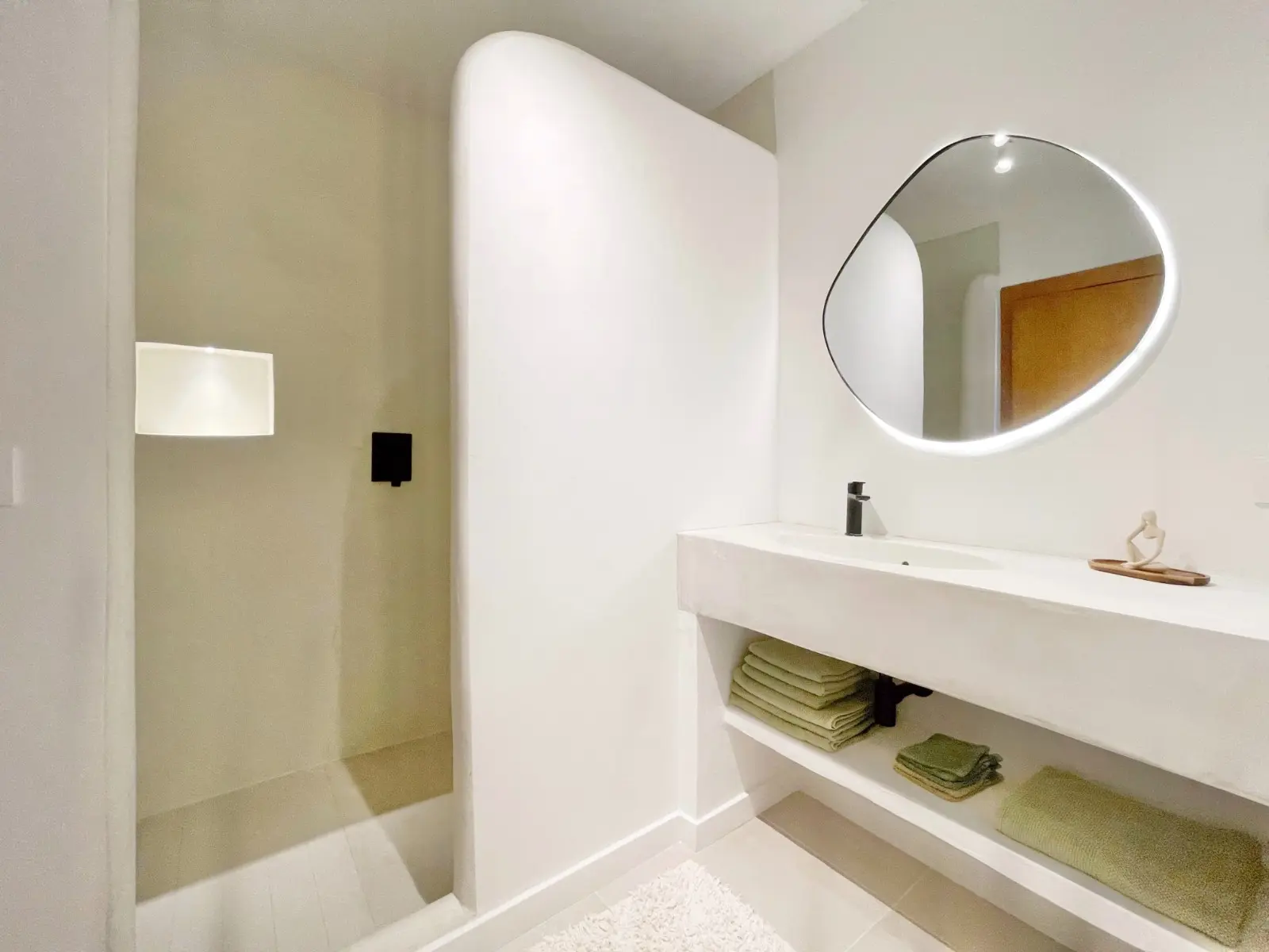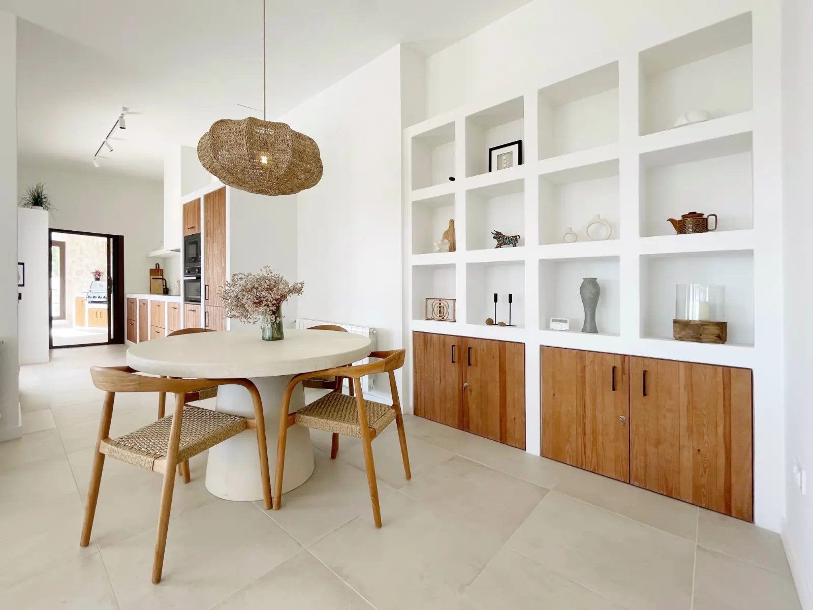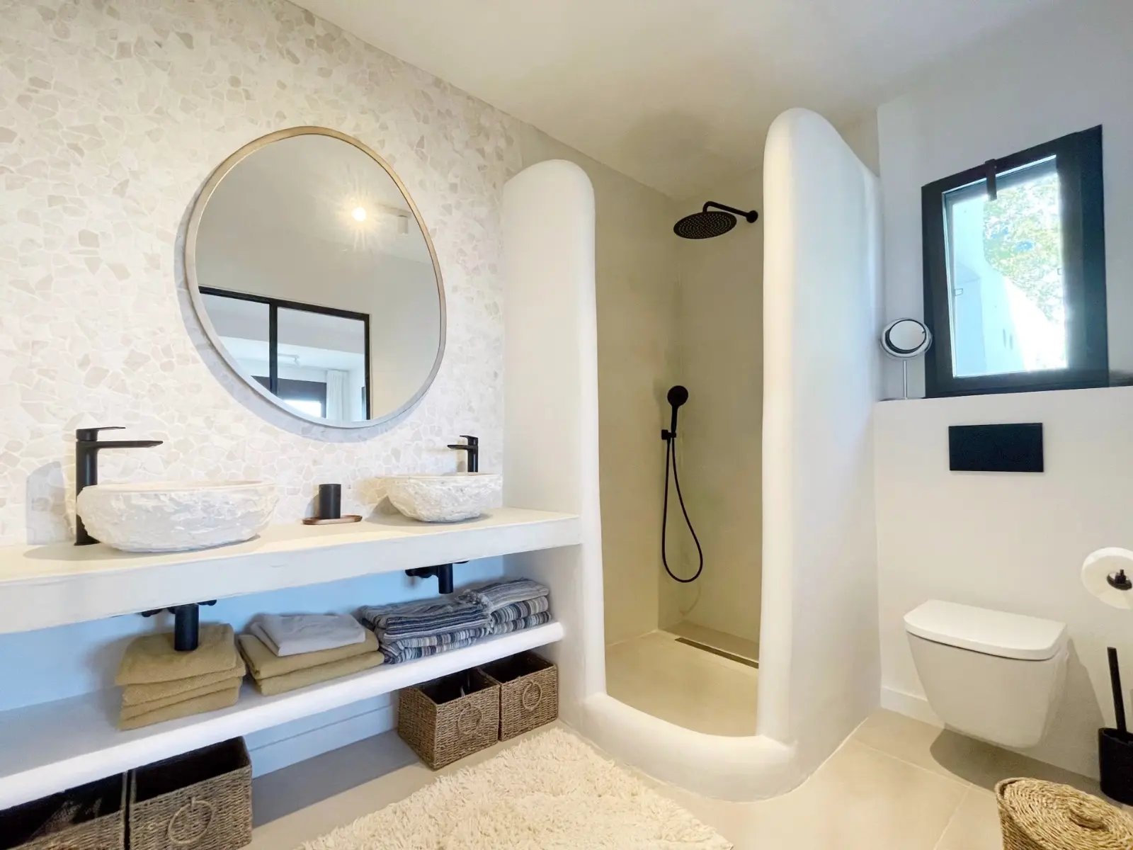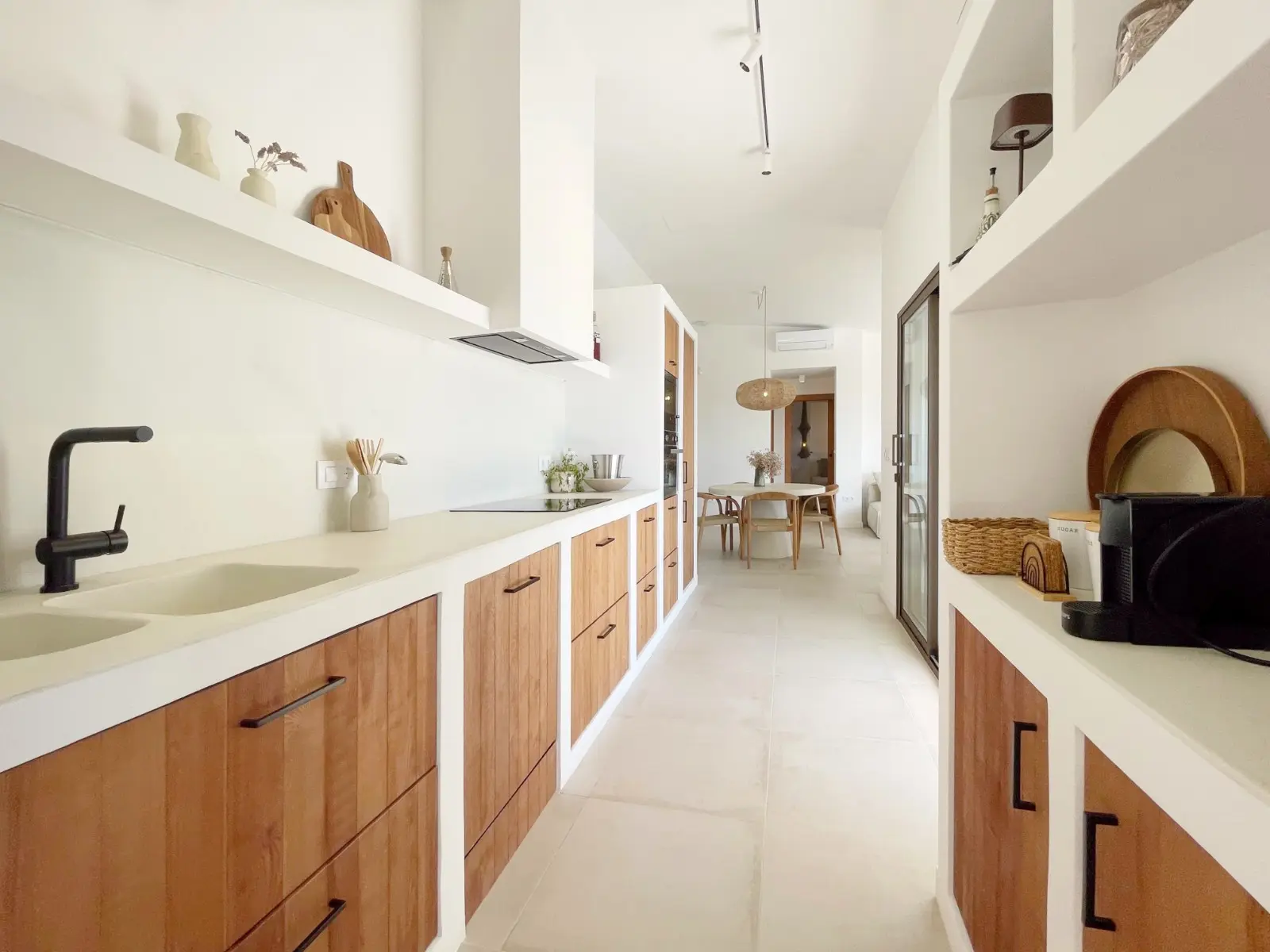 De villa beschikt over ruime, lichte leefruimtes met grote raampartijen die het adembenemende uitzicht maximaal tot zijn recht laten komen. De open leefruimte sluit aan op een moderne Ibiza-stijl keuken, volledig uitgerust met inbouwapparatuur en directe toegang tot een buitenkeuken met BBQ. Op hetzelfde niveau bevindt zich de hoofdslaapkamer met ensuite badkamer en privéterras. Op de benedenverdieping , te bereiken via een interne trap, zijn twee extra slaapkamers met elk een eigen badkamer, ingebouwde kasten met ledverlichting, airconditioning, elektrische rolluiken, vliegenhorren en zeezicht. Verder zijn er een wasruimte, technische ruimte en bergruimte aanwezig. De villa beschikt over meerdere terrassen, deels overdekt, een niervormig zwembad met buitendouche en diverse loungehoeken. De mediterrane tuin met sfeervolle verlichting creëert een aangename sfeer, zowel overdag als ’s avonds.